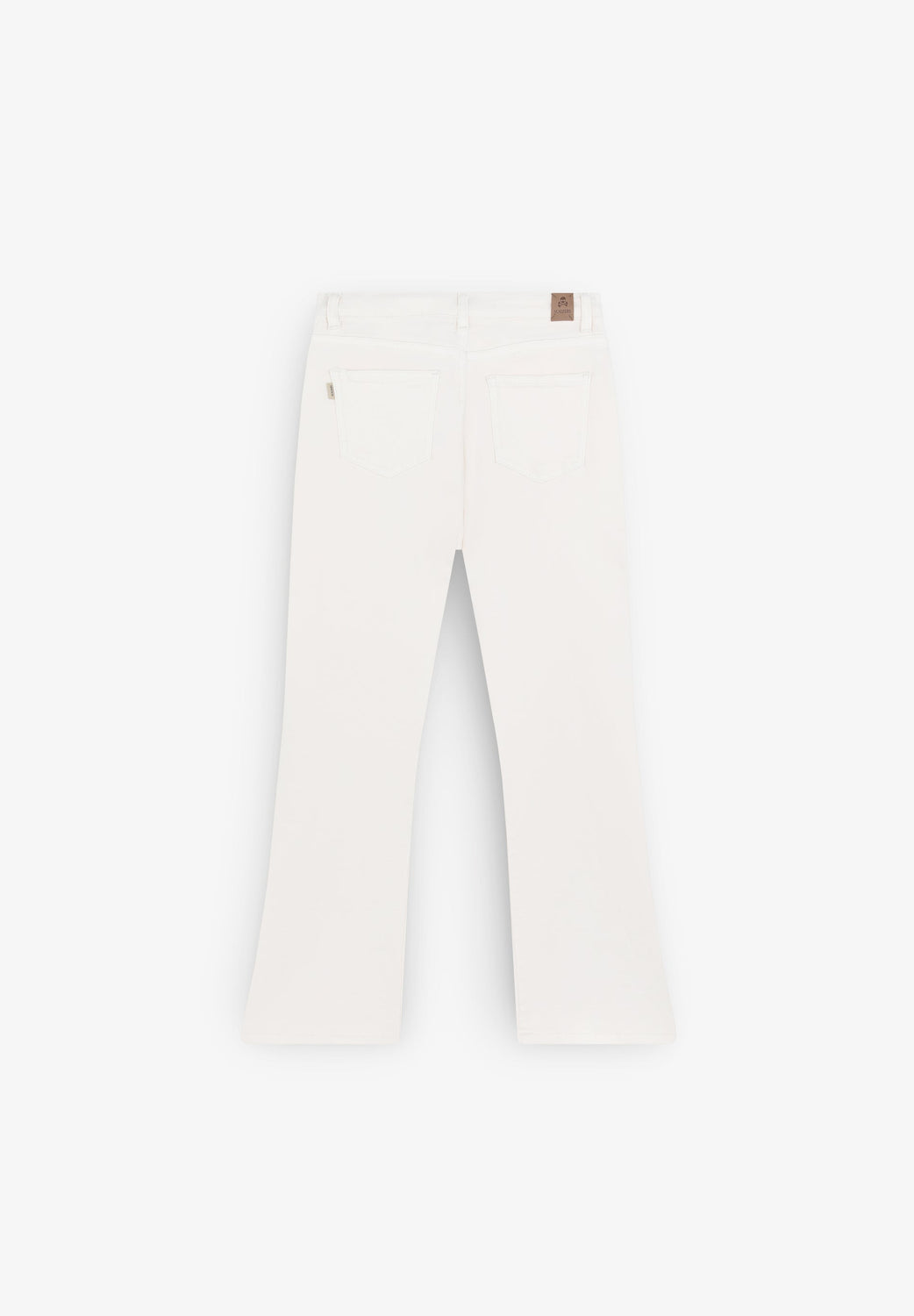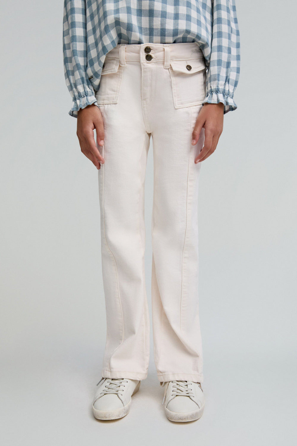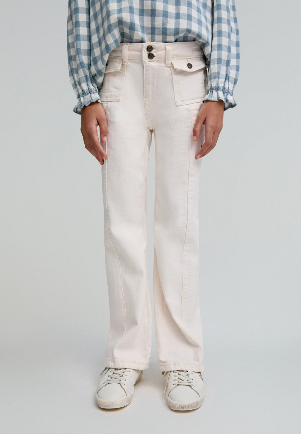 Pantalón confeccionado en tejido ligeramente elástico. Regular fit, cierre con botones y cremallera y bolsillos frontales con botones y traseros. Trabillas en cintura y costuras frontales.