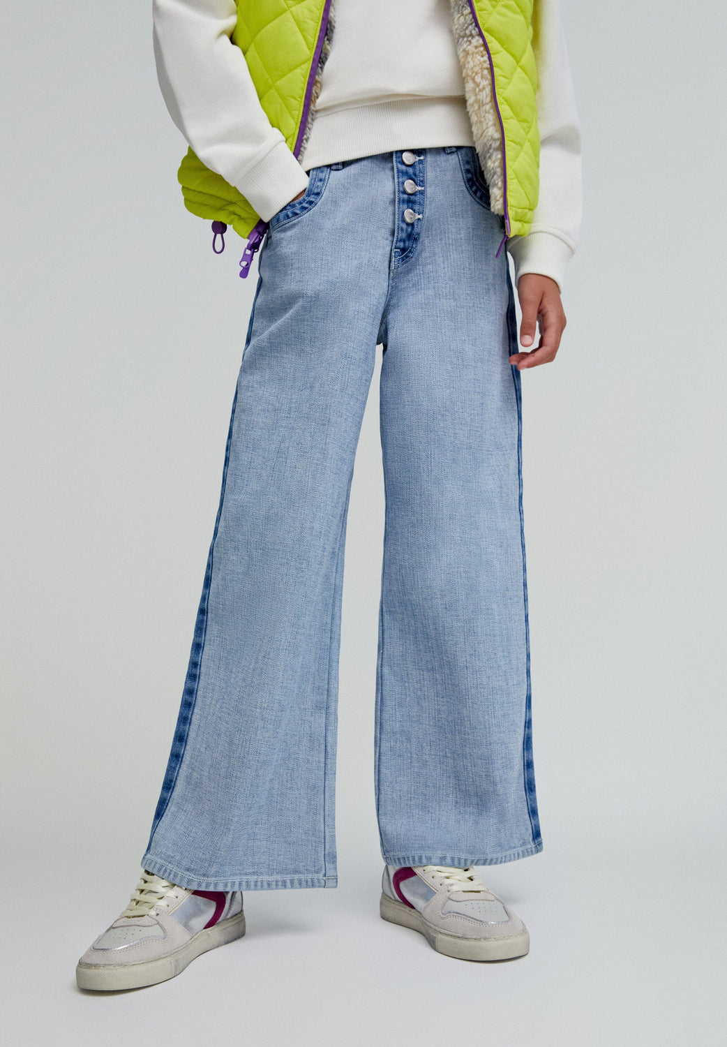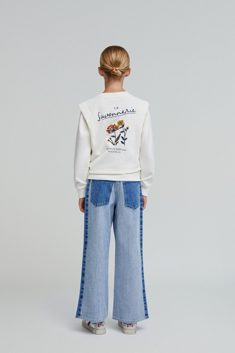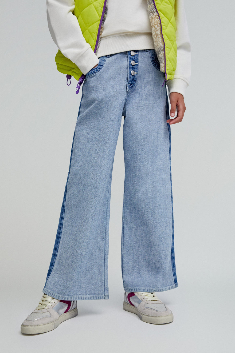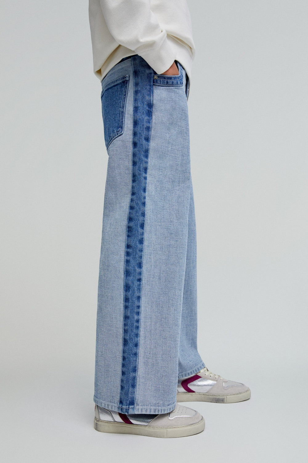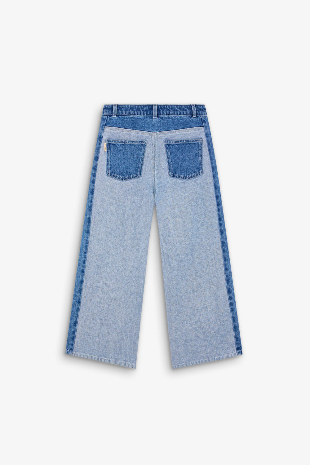 Jeans bicolor confeccionados en algodón BCI ligeramente elástico. Corte culotte, cierre con botón y cremallera. Bolsillos laterales y traseros.