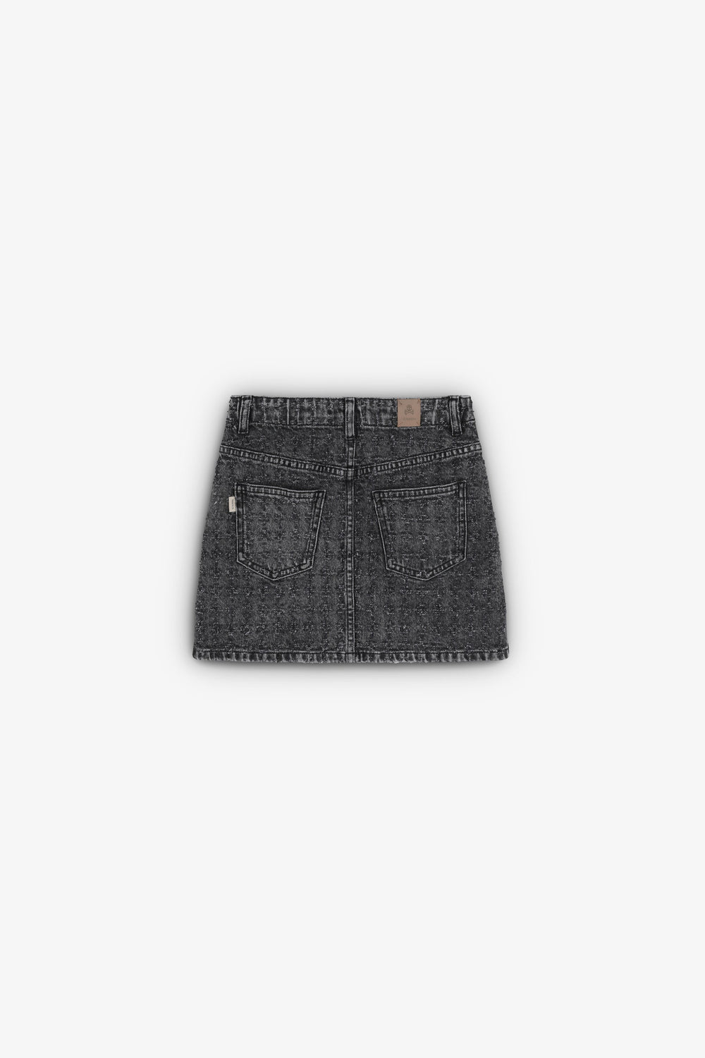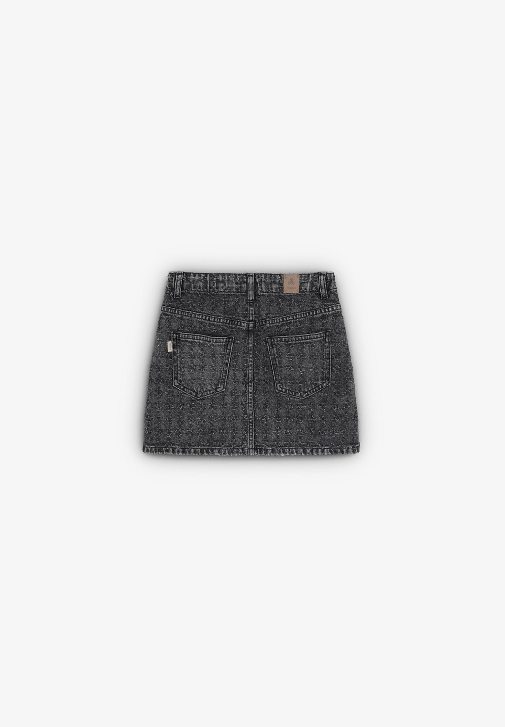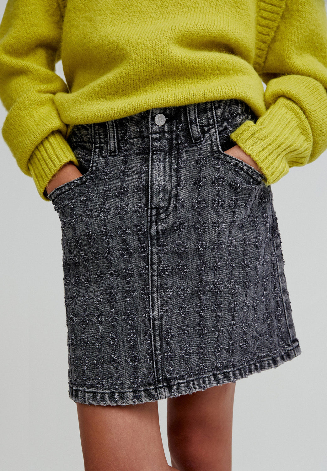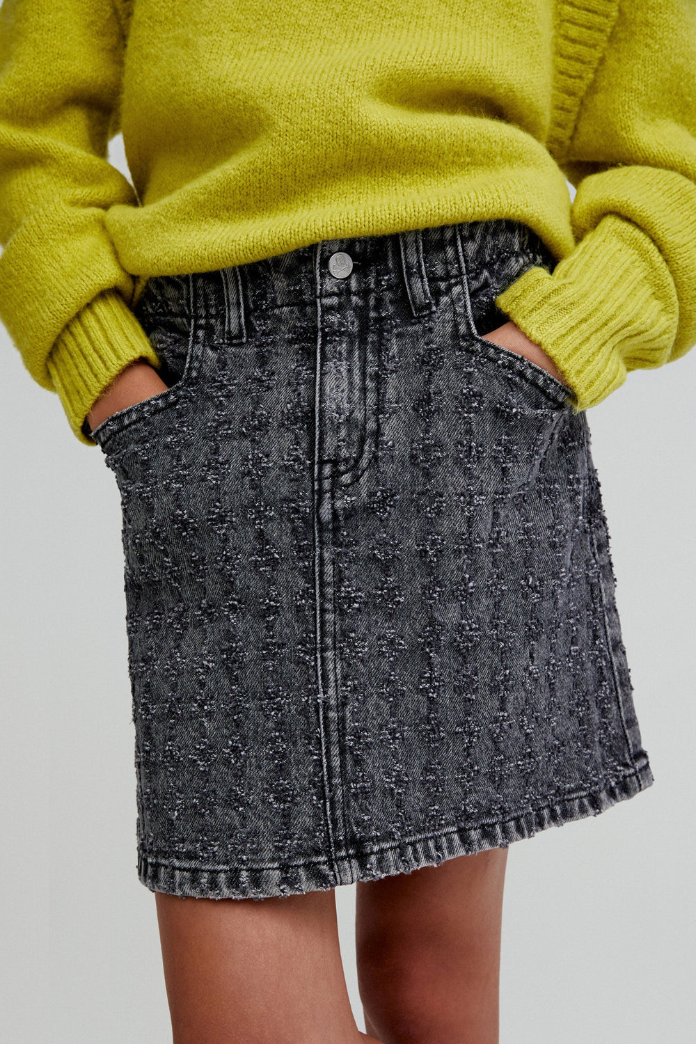 Falda mini denim con fantasía confeccionada en tejido ligeramente elástico. Regular Fit. Cierre con botón y cremallera. Cinturilla elástica en parte trasera. Bolsillos frontales y traseros.