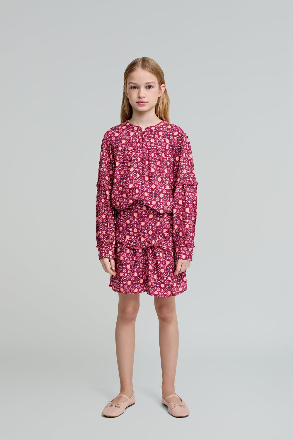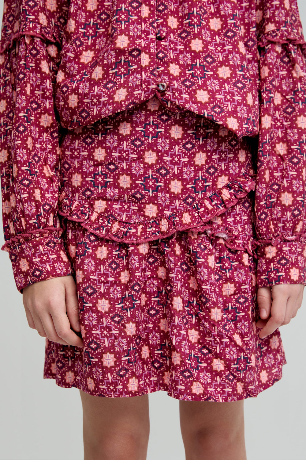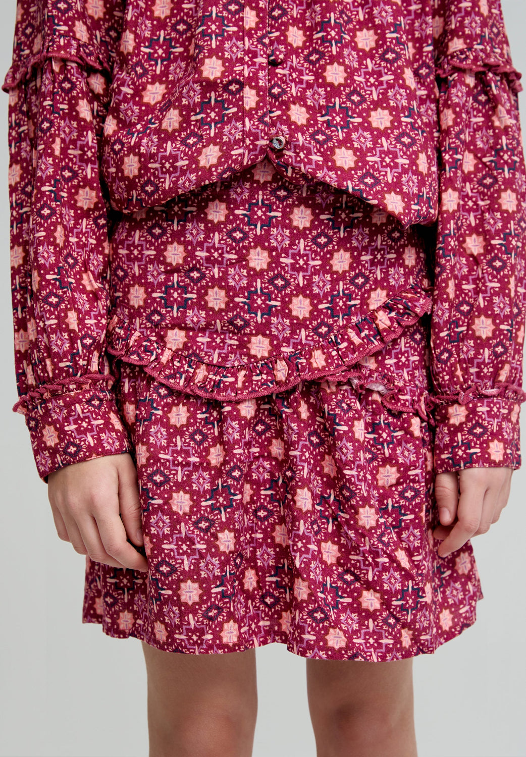 Falda mini con print confeccionada en tejido fluido. Regular fit, cierre con cremallera y detalle de volantes.