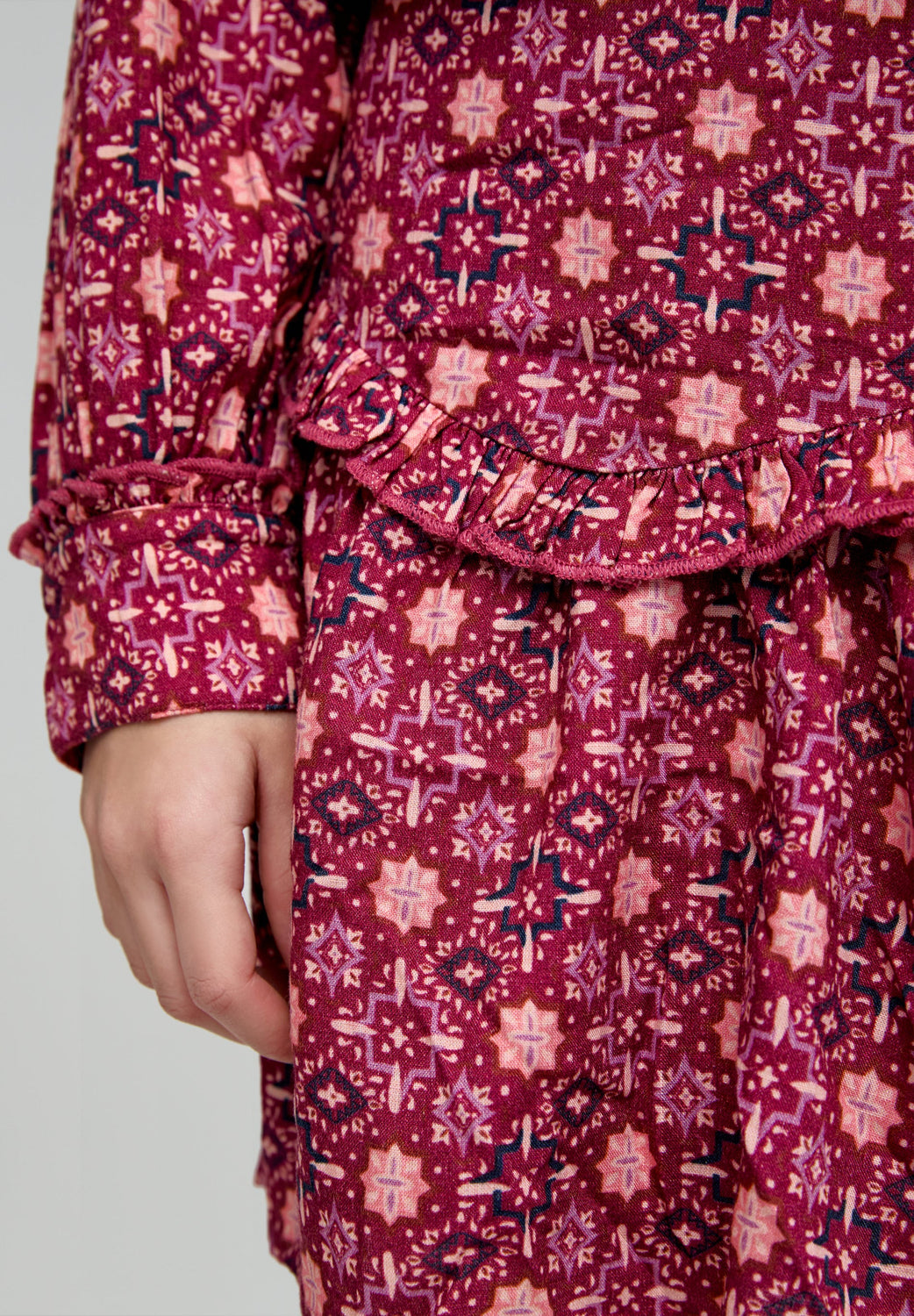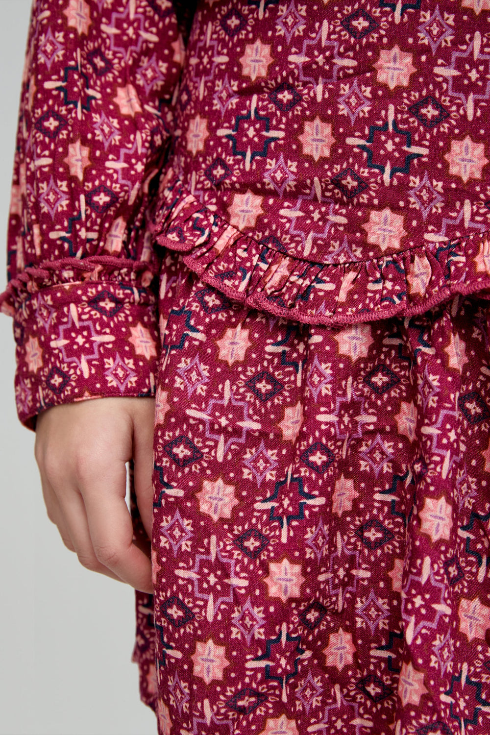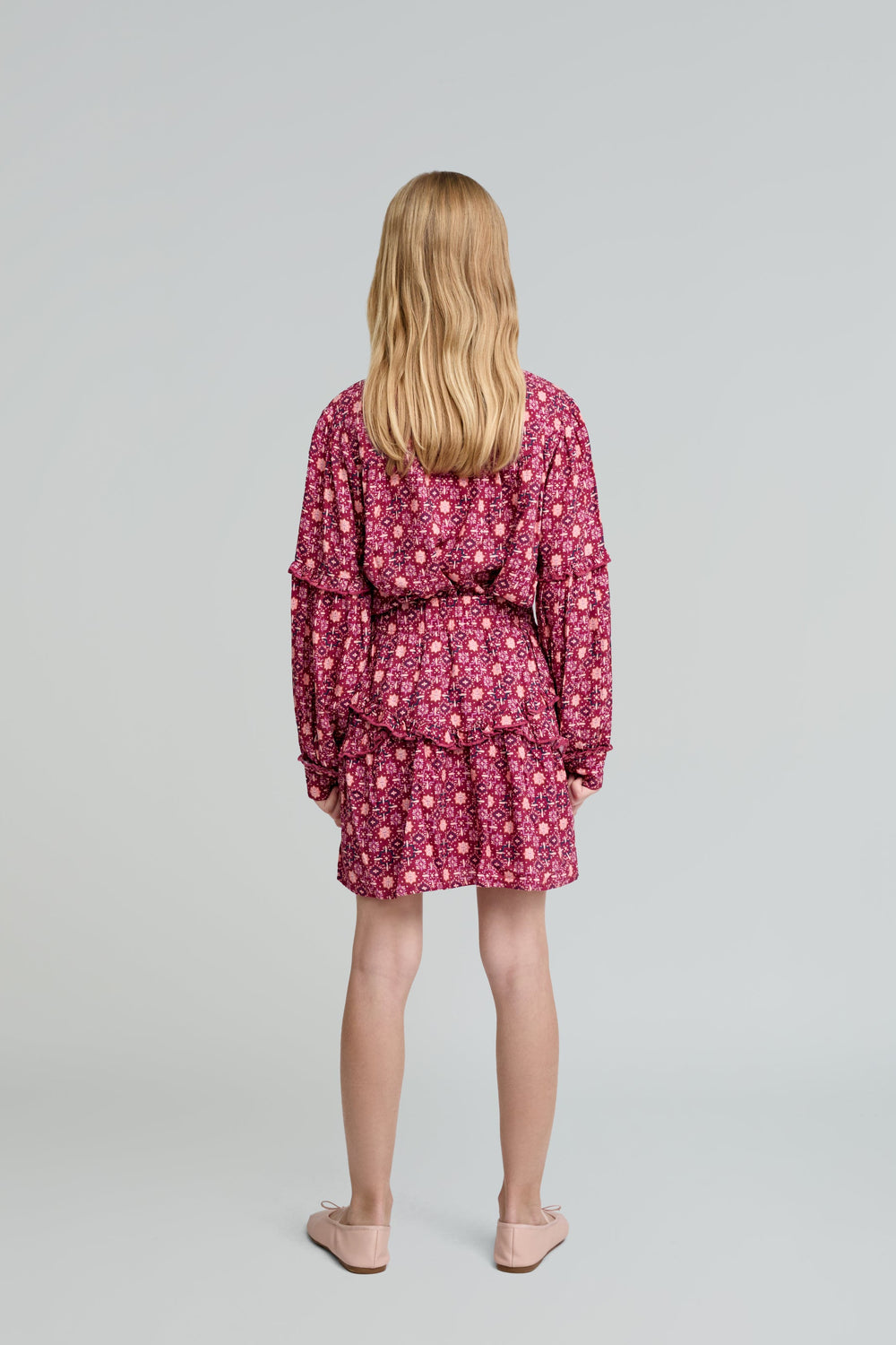 Falda mini con print confeccionada en tejido fluido. Regular fit, cierre con cremallera y detalle de volantes.