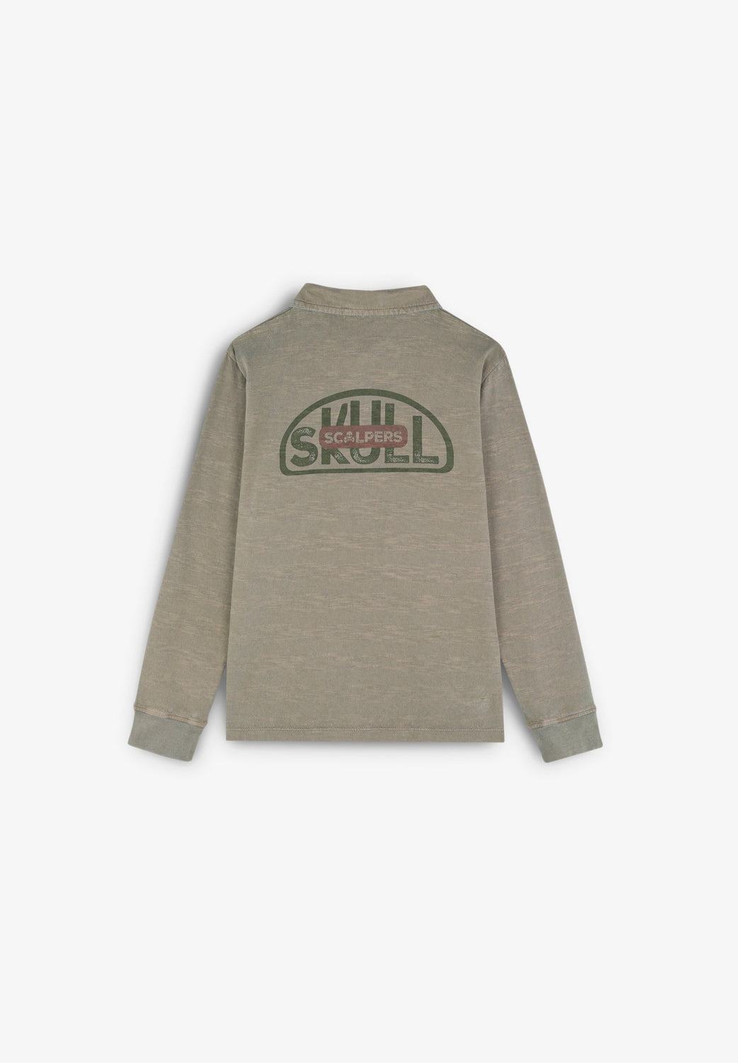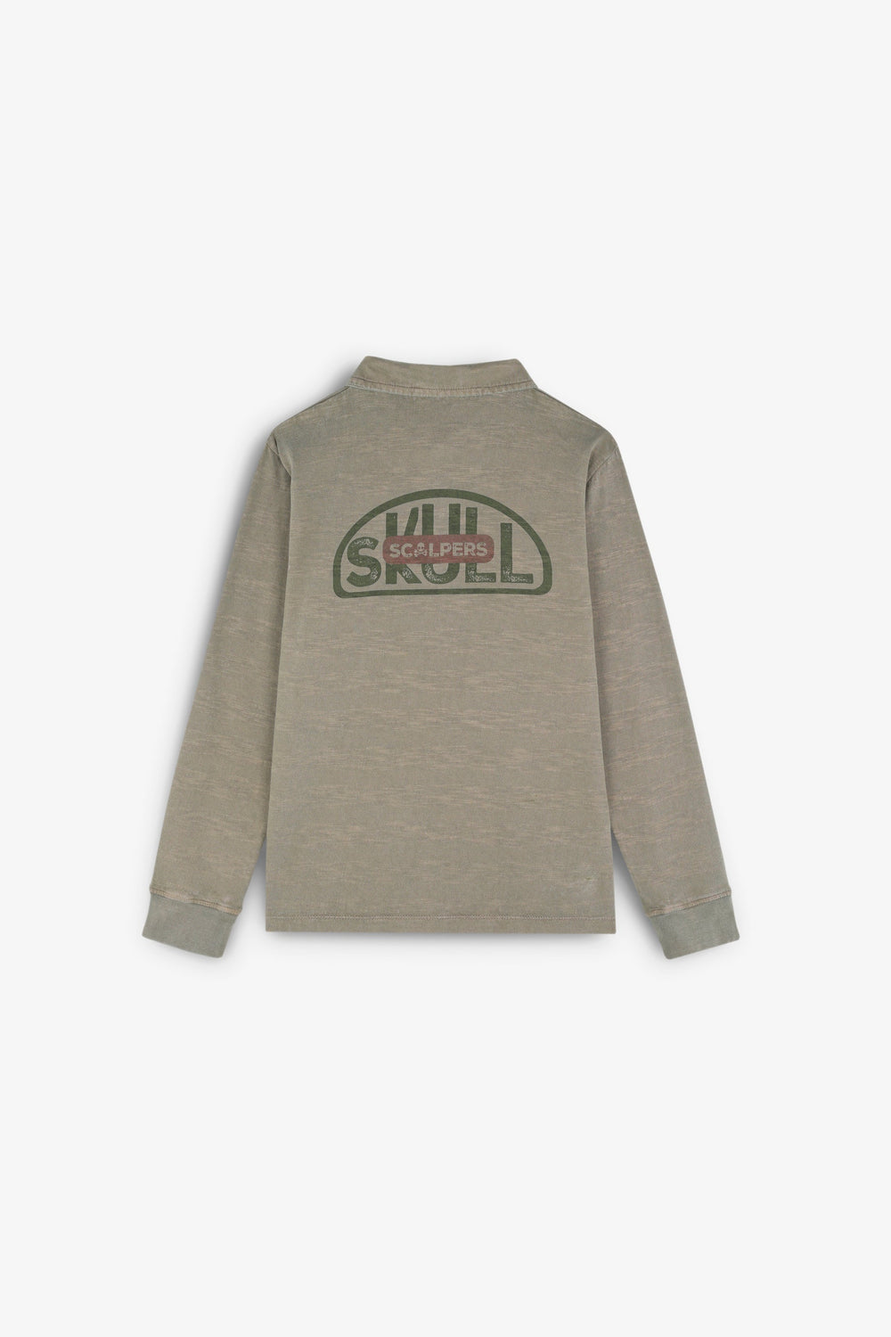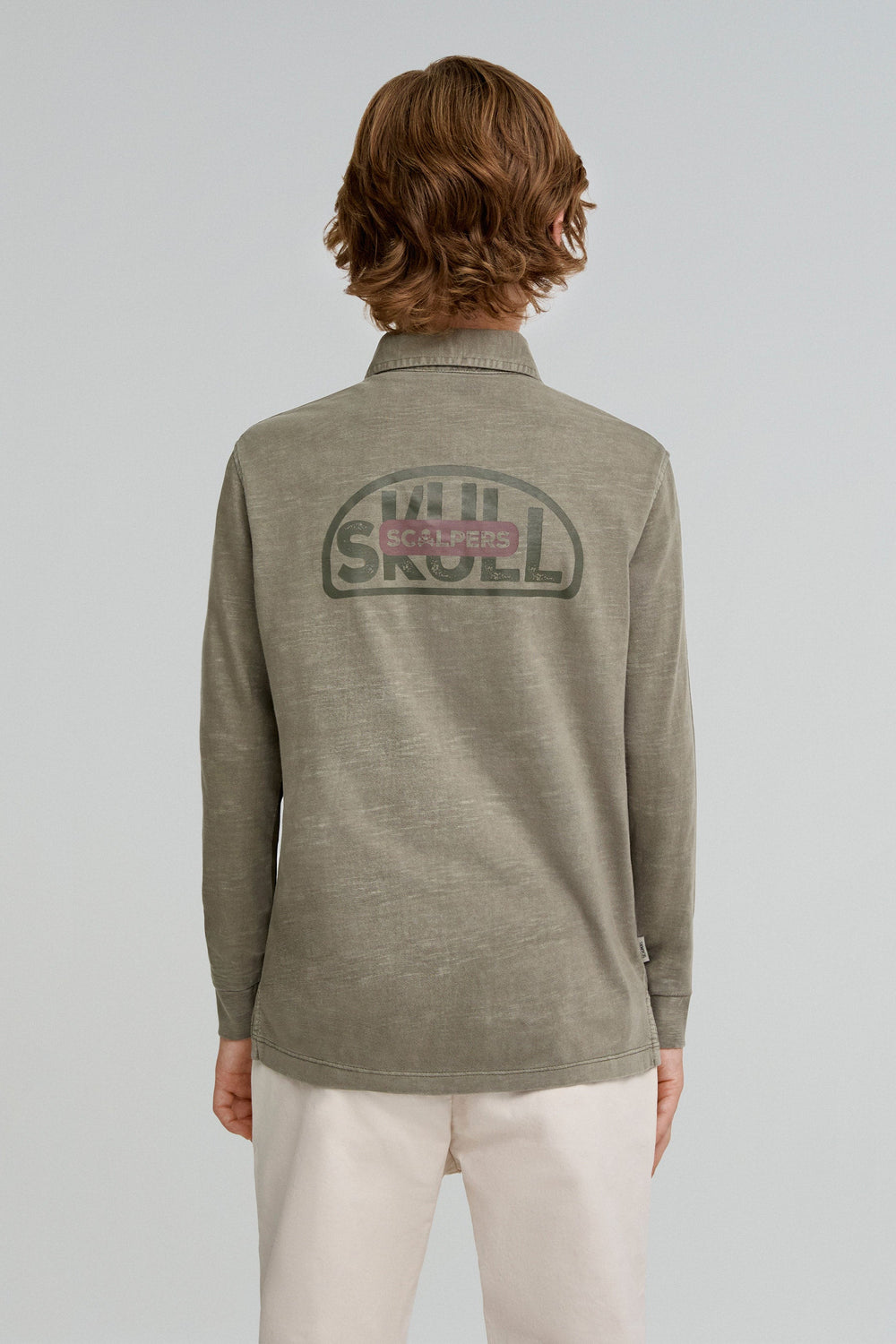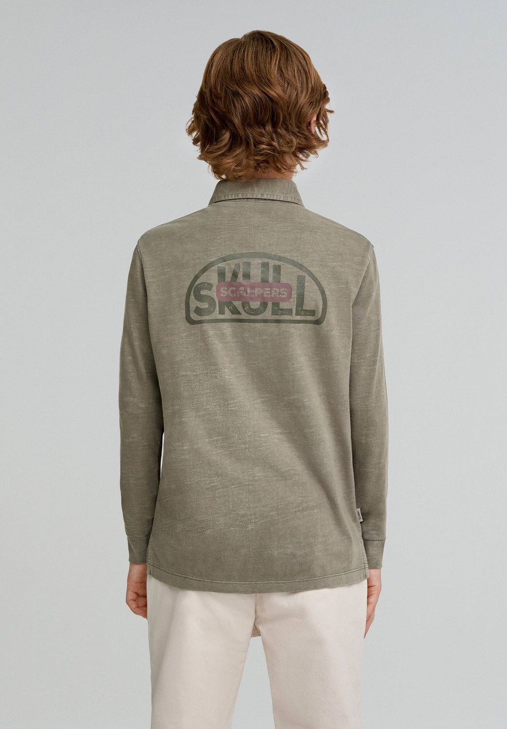 Polo confeccionado en 100% algodón BCI. Regular fit, cuello clásico con botones y manga larga. Print trasero y logo con calavera bordada.