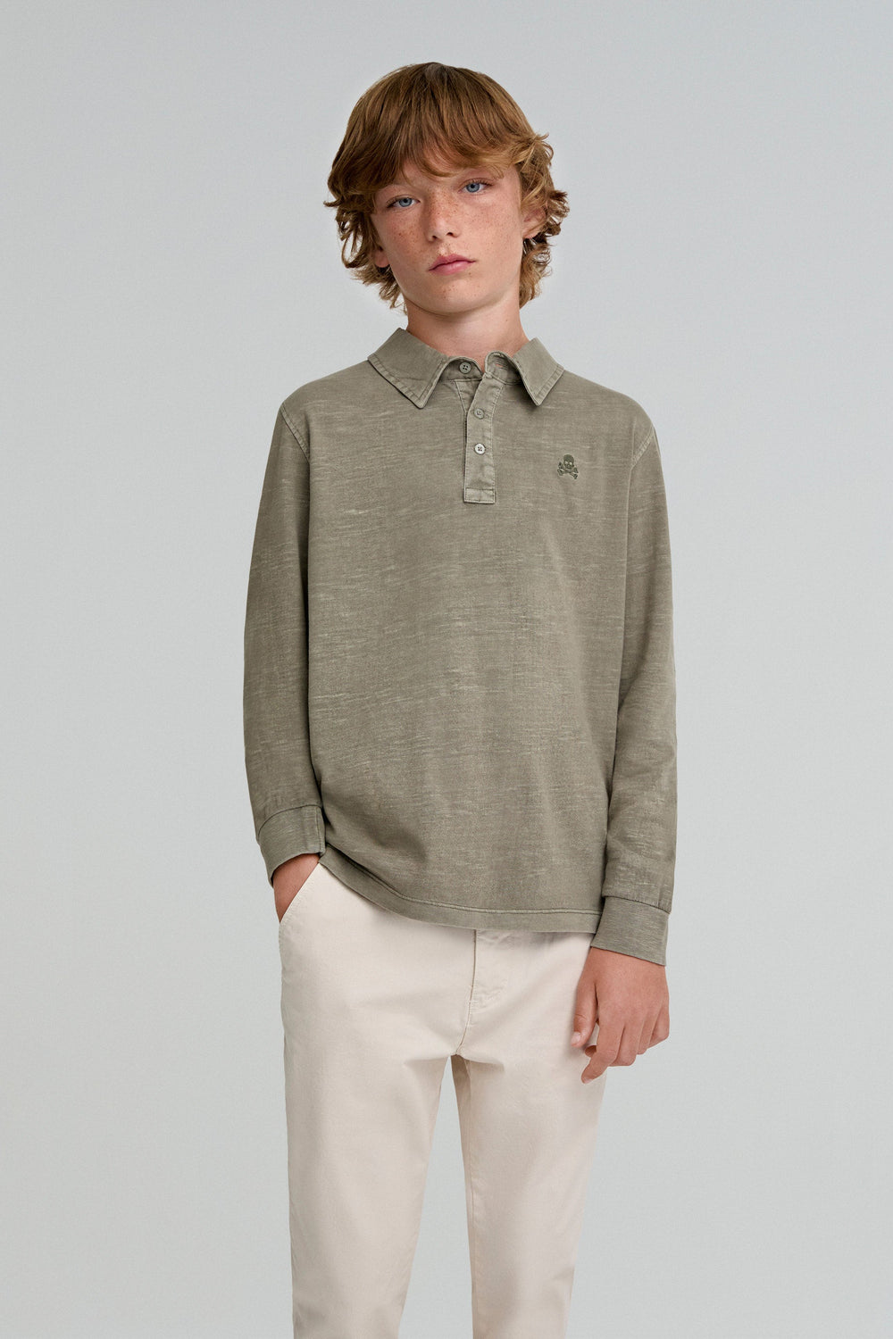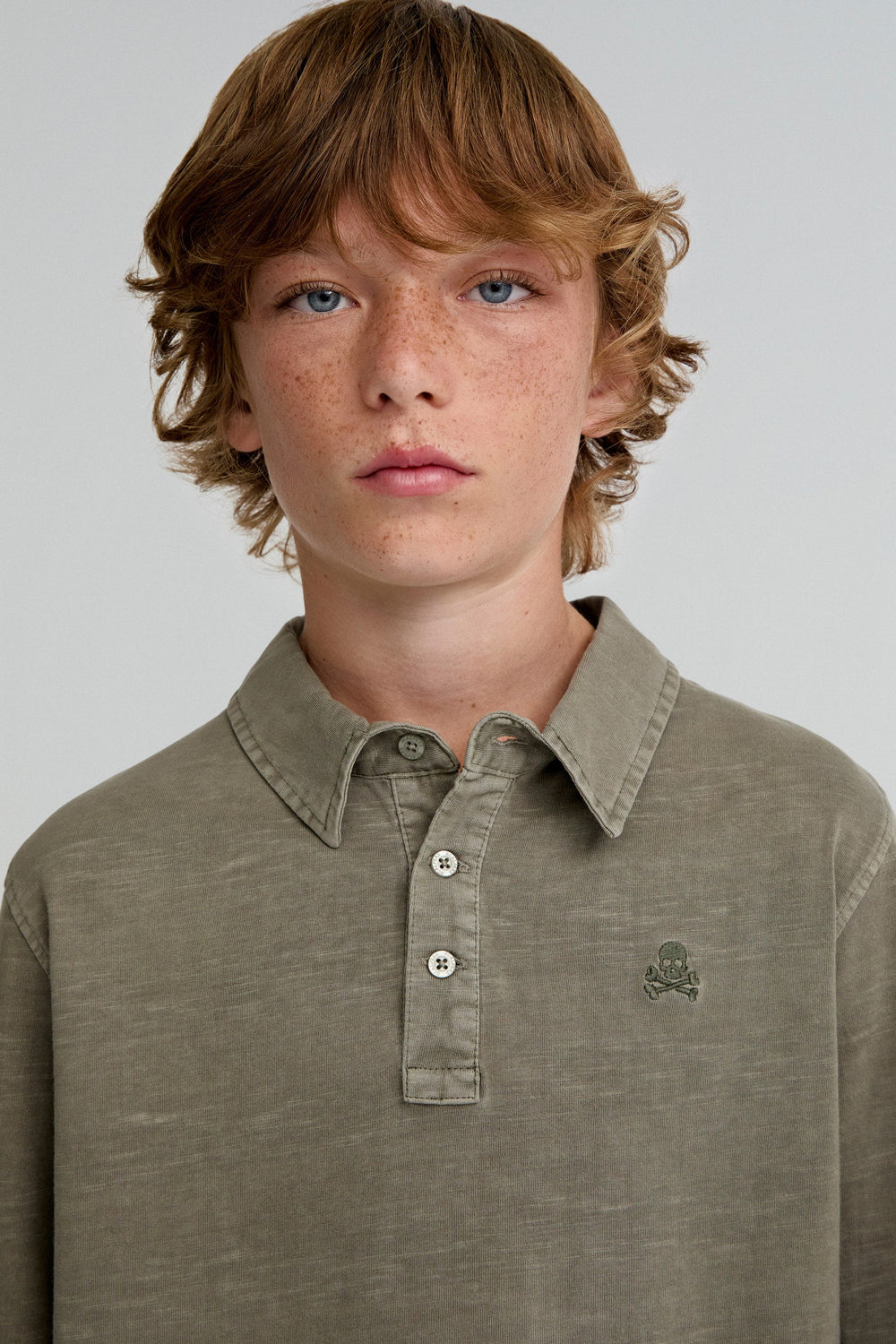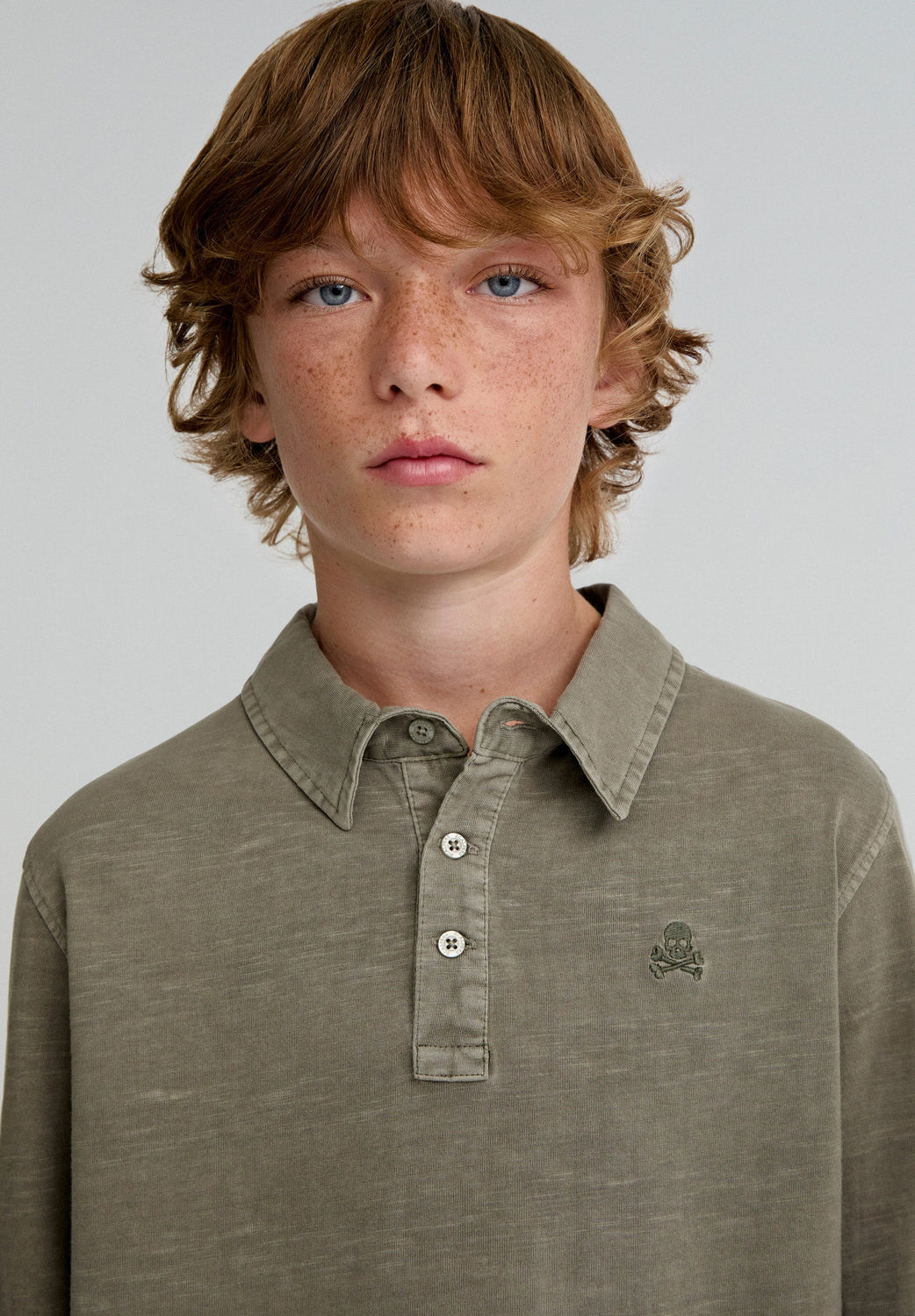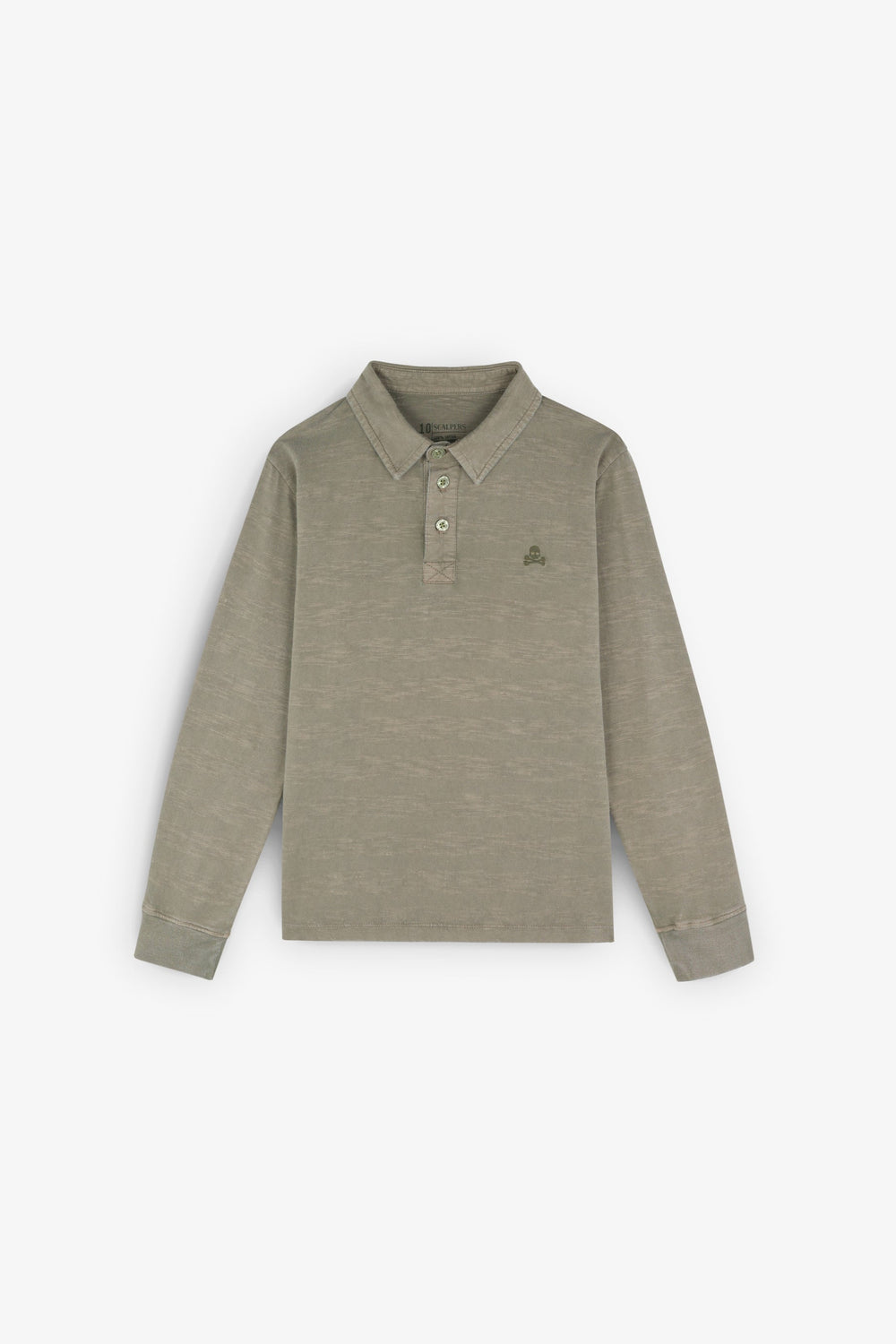 Polo confeccionado en 100% algodón BCI. Regular fit, cuello clásico con botones y manga larga. Print trasero y logo con calavera bordada.