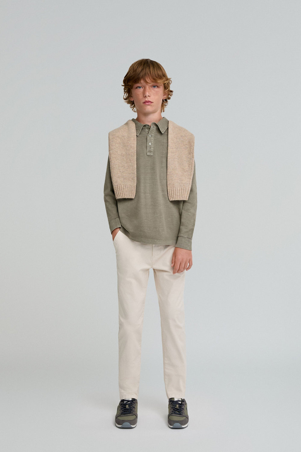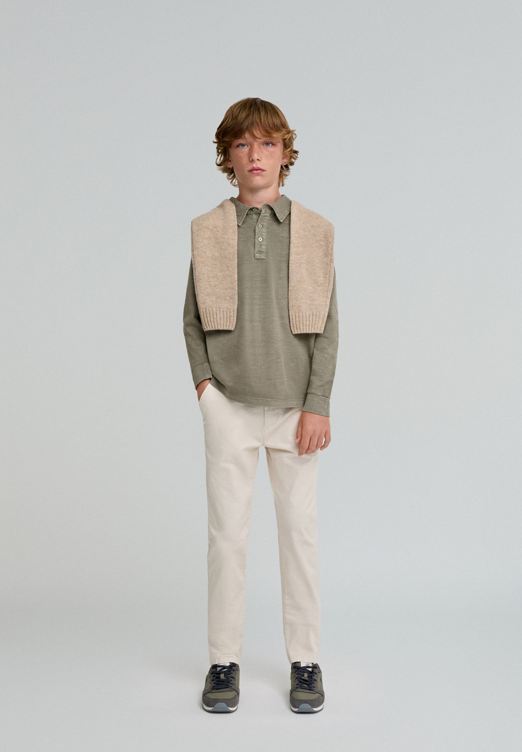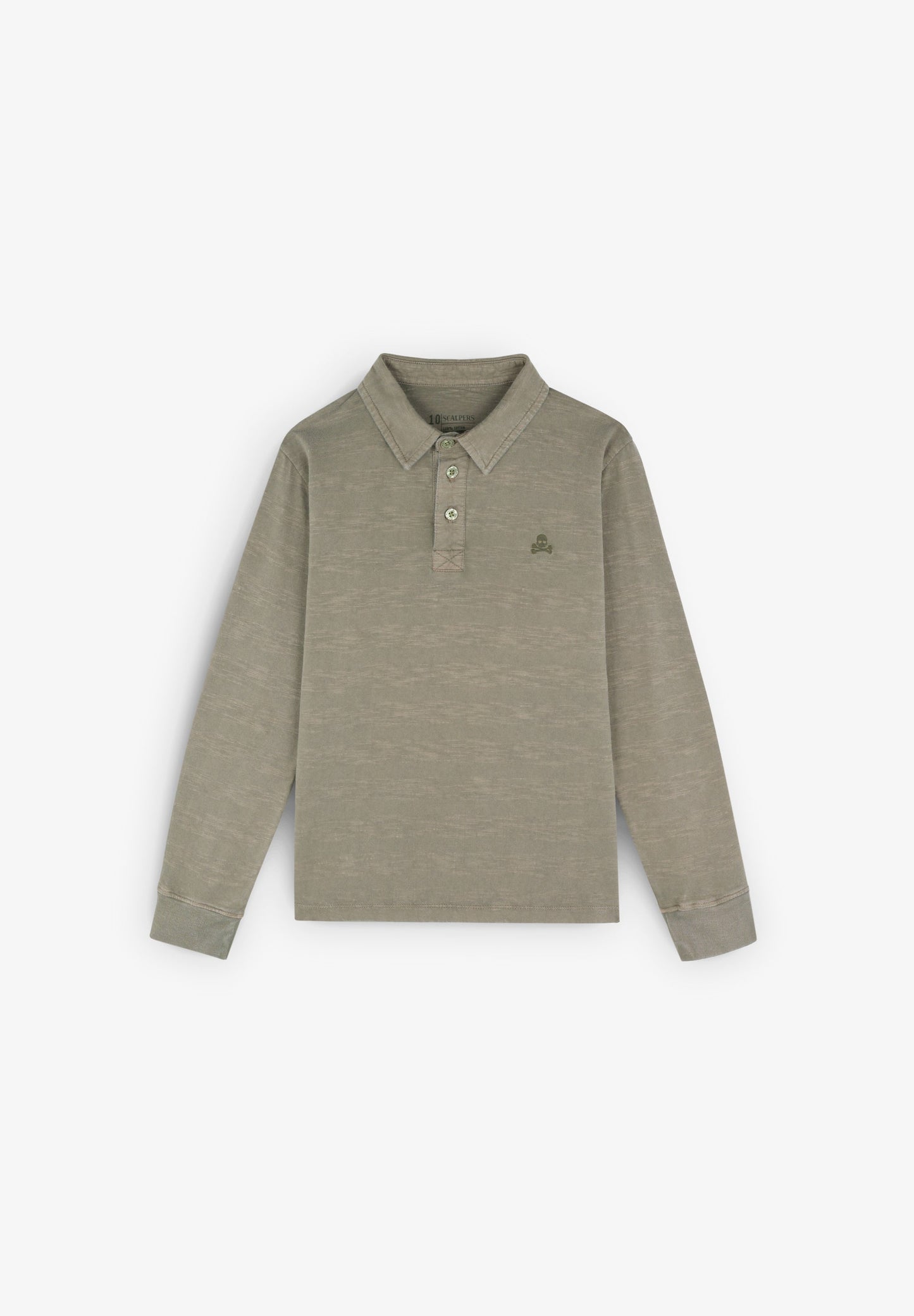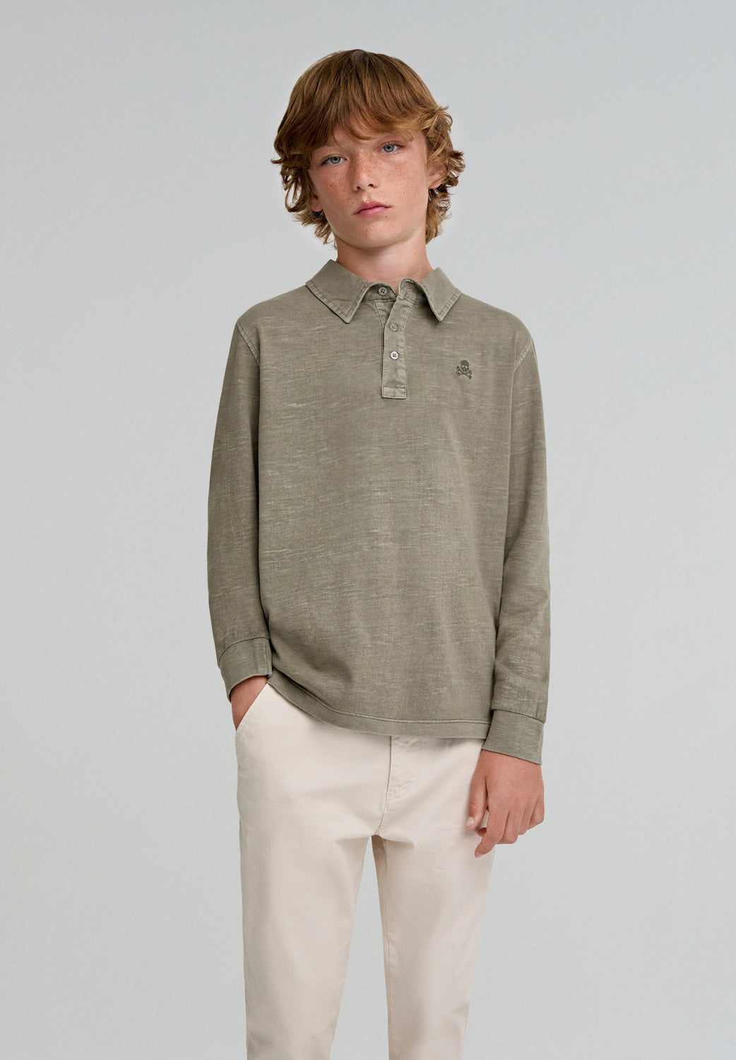 Polo confeccionado en 100% algodón BCI. Regular fit, cuello clásico con botones y manga larga. Print trasero y logo con calavera bordada.