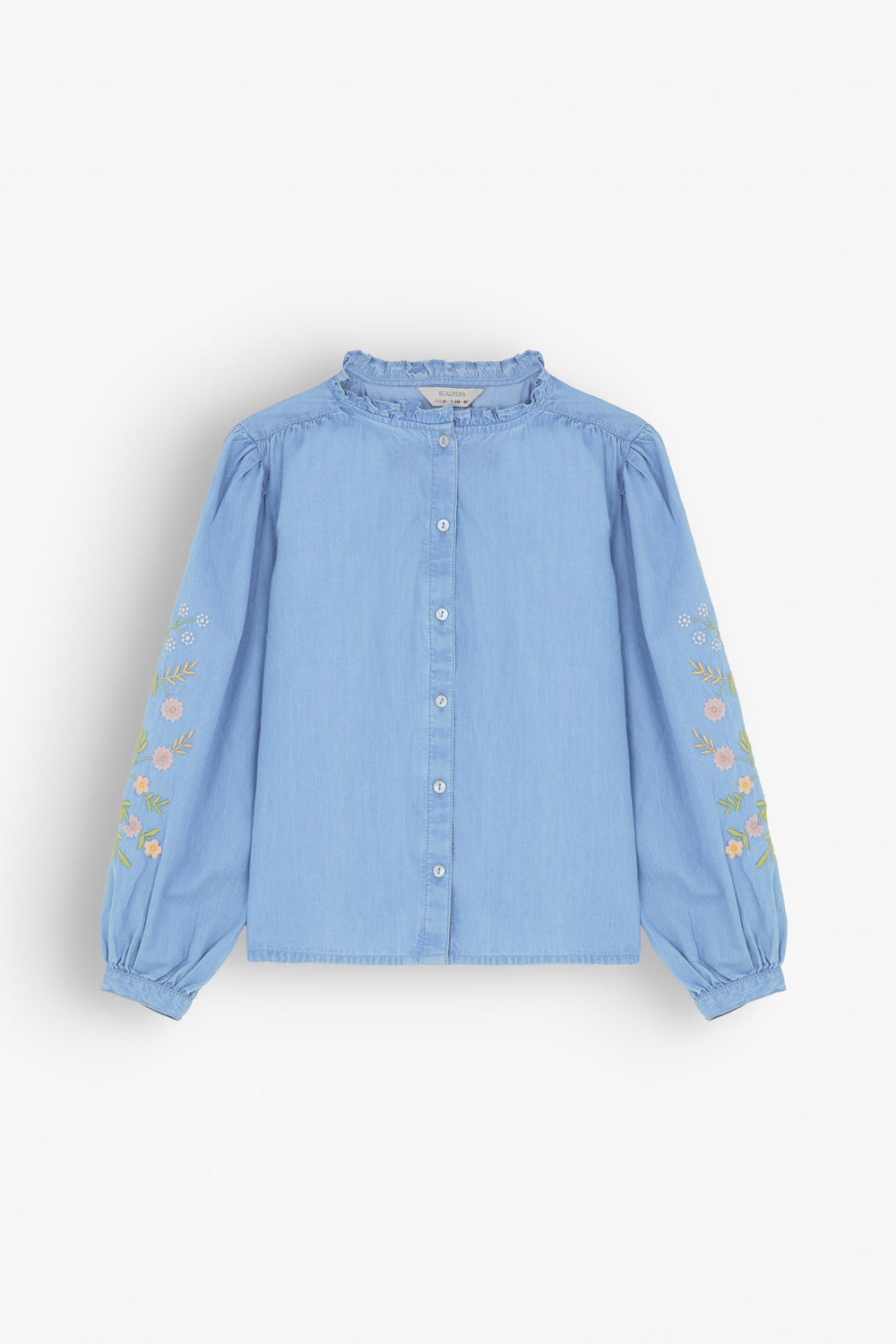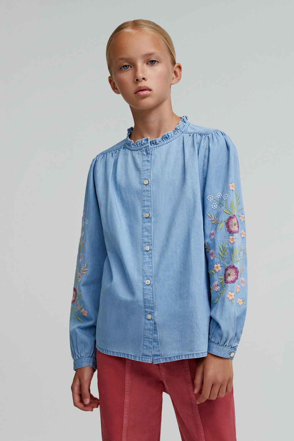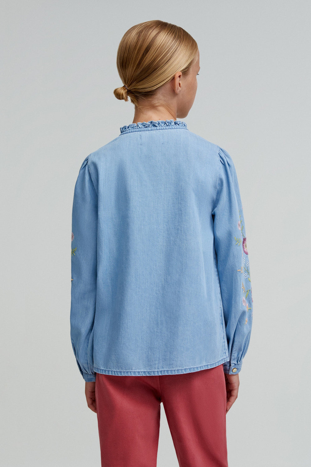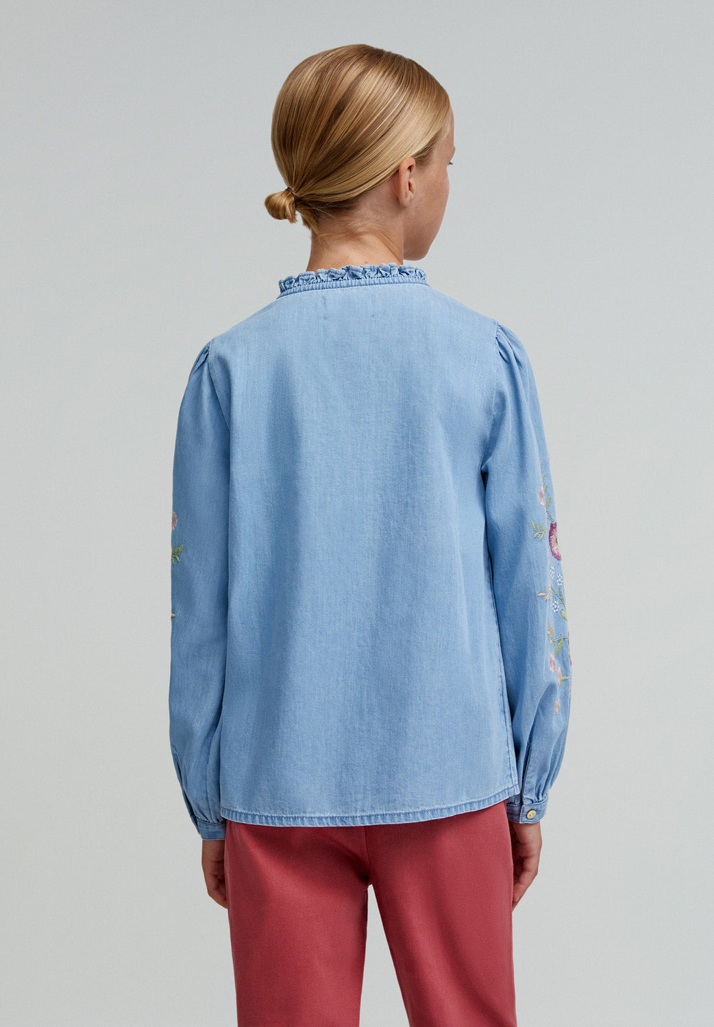 Blusa denim bordada a contraste confeccionada en 100% algodón. Regular fit. Cuello redondo acabado en volante y cierre con botones. Manga larga acabada en puño con botón.