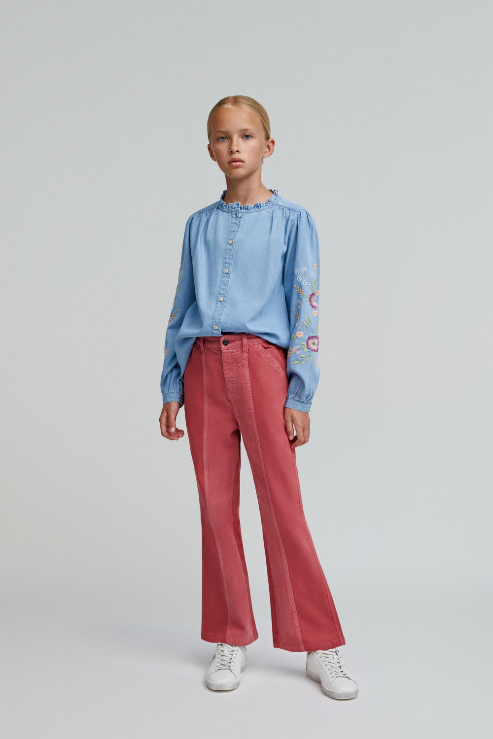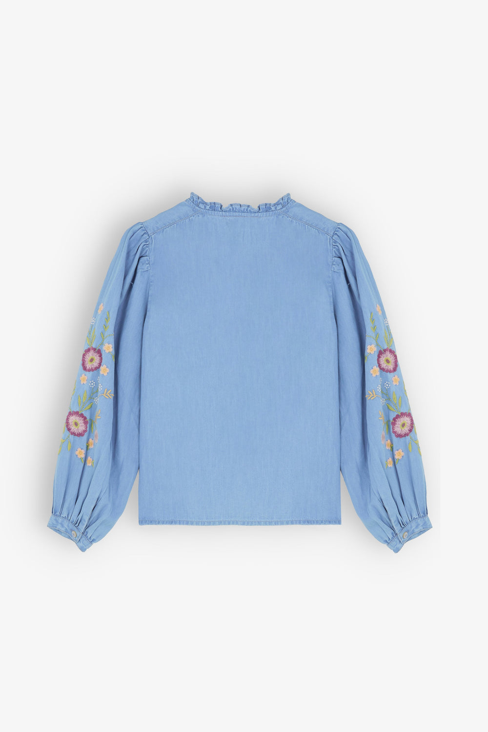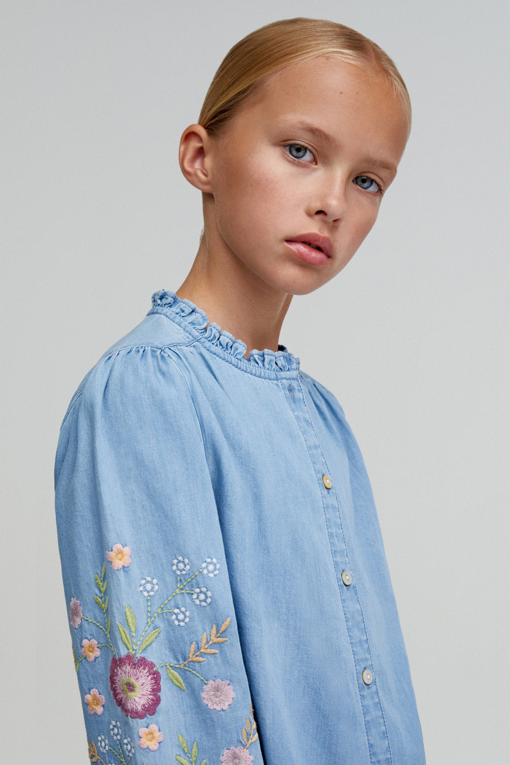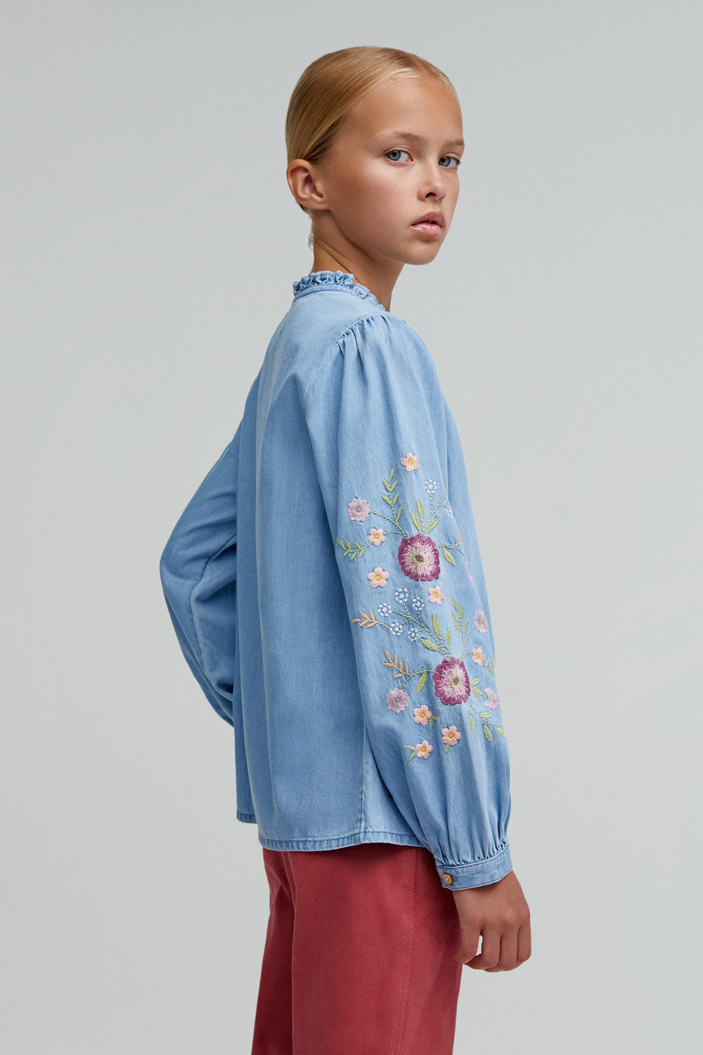 Blusa denim bordada a contraste confeccionada en 100% algodón. Regular fit. Cuello redondo acabado en volante y cierre con botones. Manga larga acabada en puño con botón.