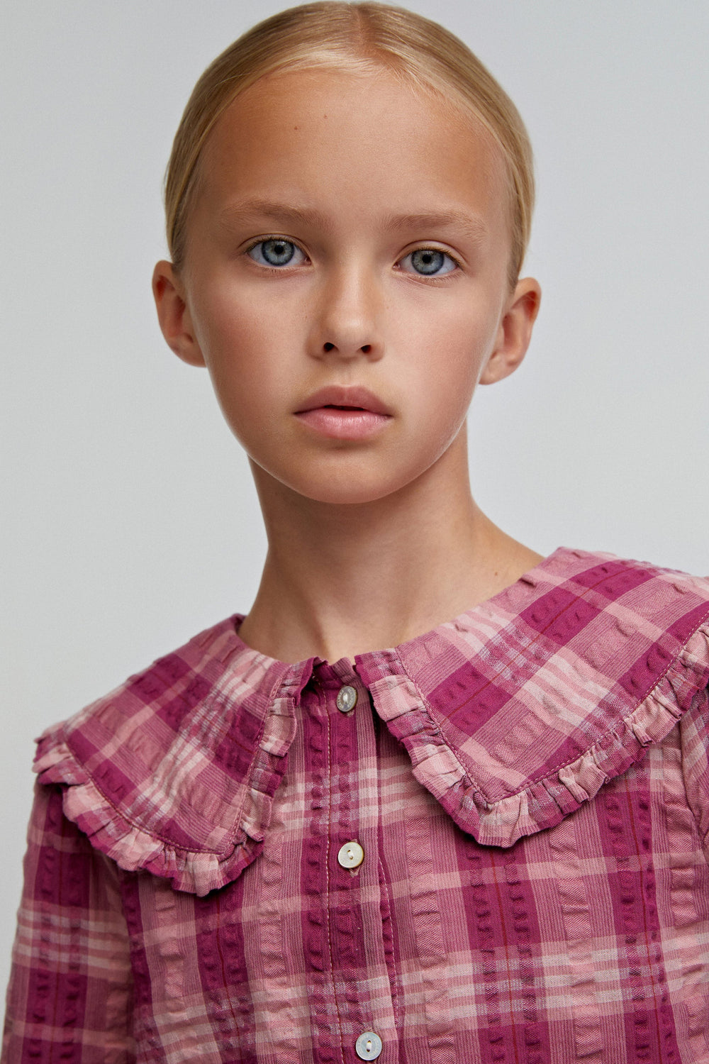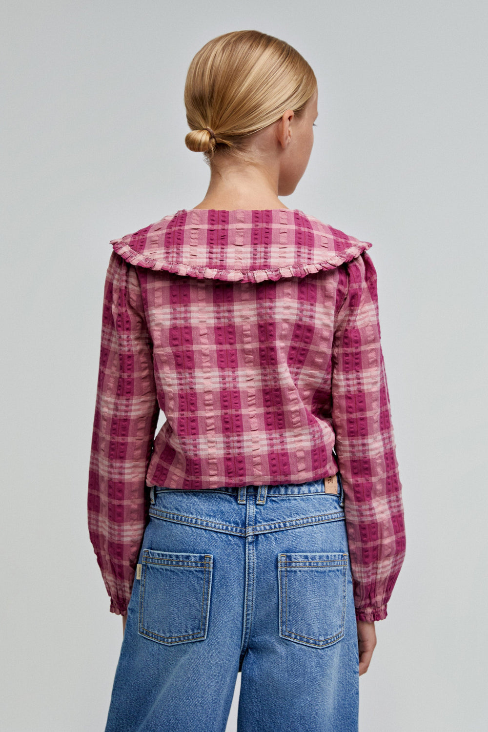 Blusa de cuadros vichy confeccionada en 100% algodón BCI. Regular fit. Cierre con botones. Cuello bobo con detalle de volantes. Manga larga acaba en puño con con frunces.