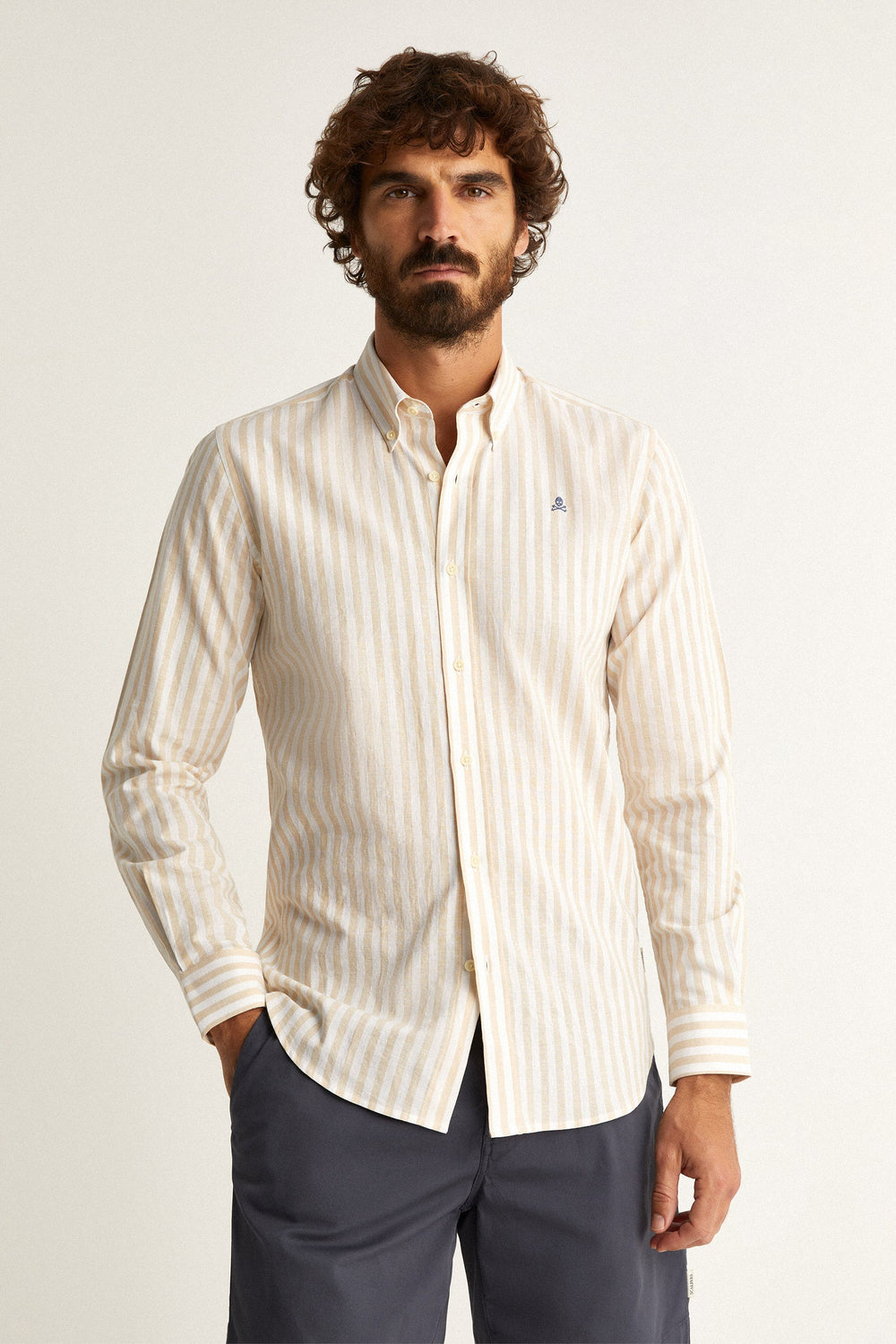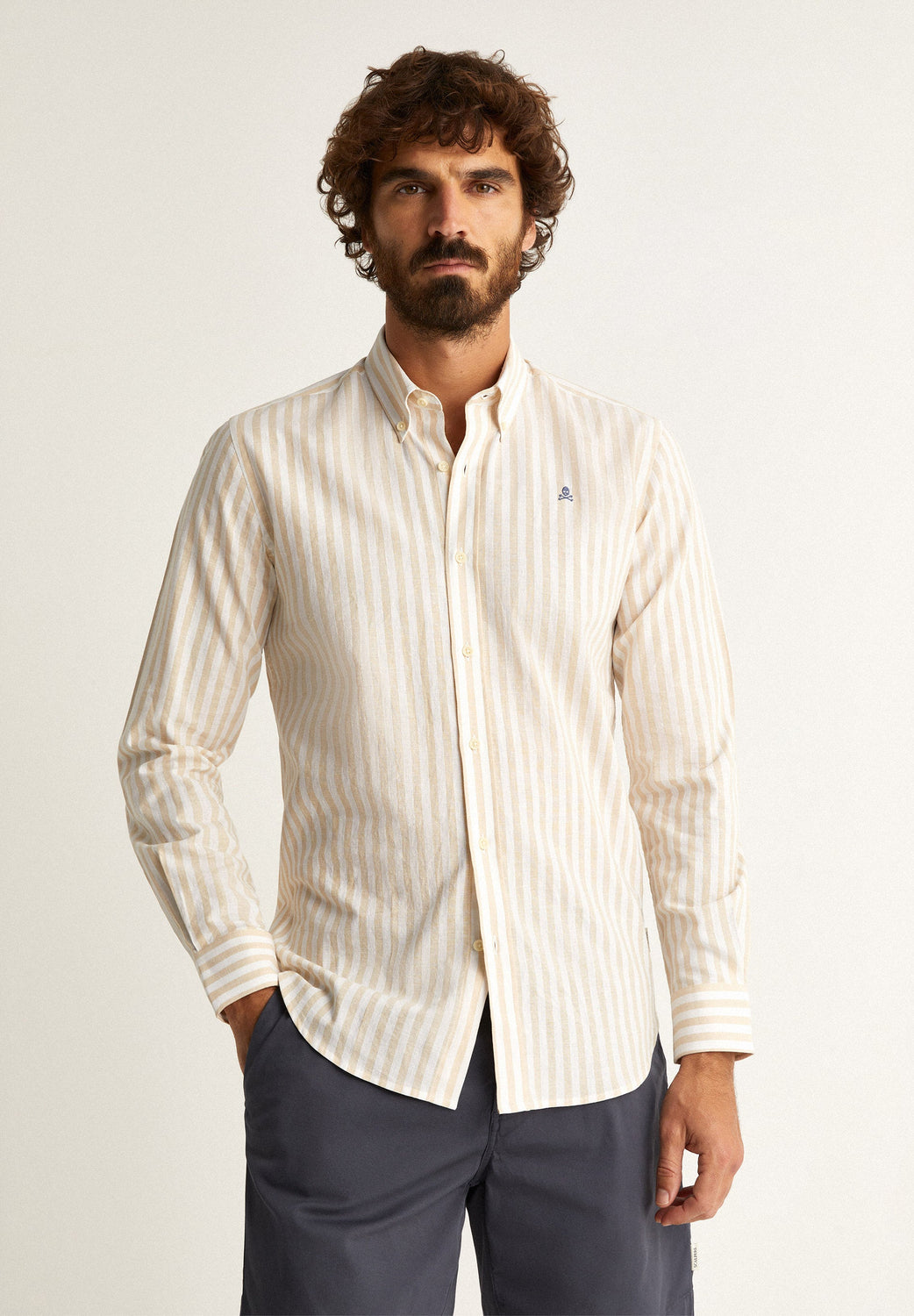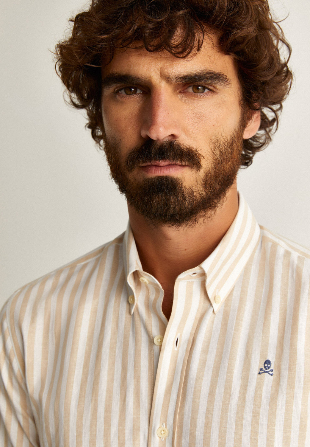 Camisa de rayas con calavera bordada a contraste en pecho.