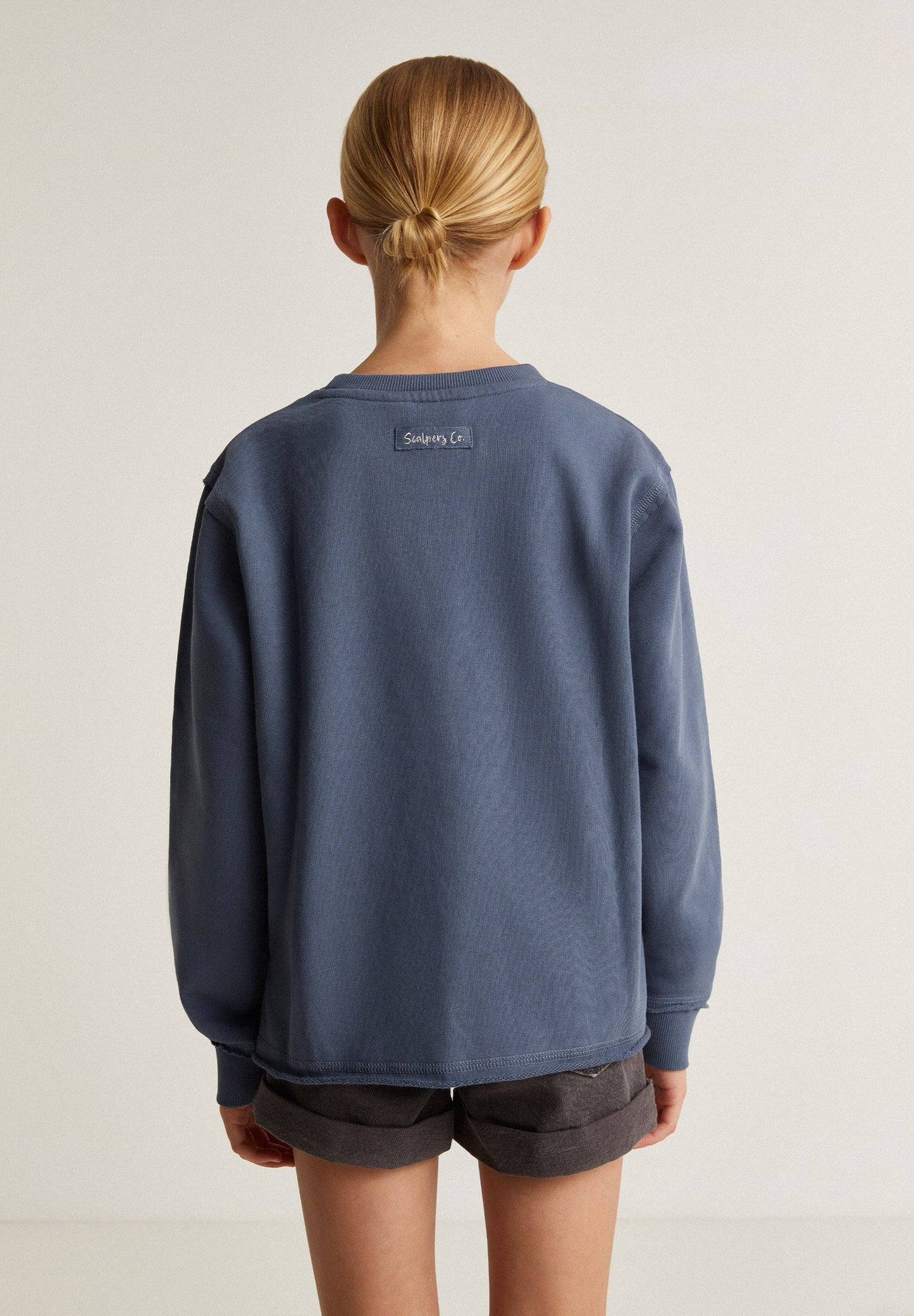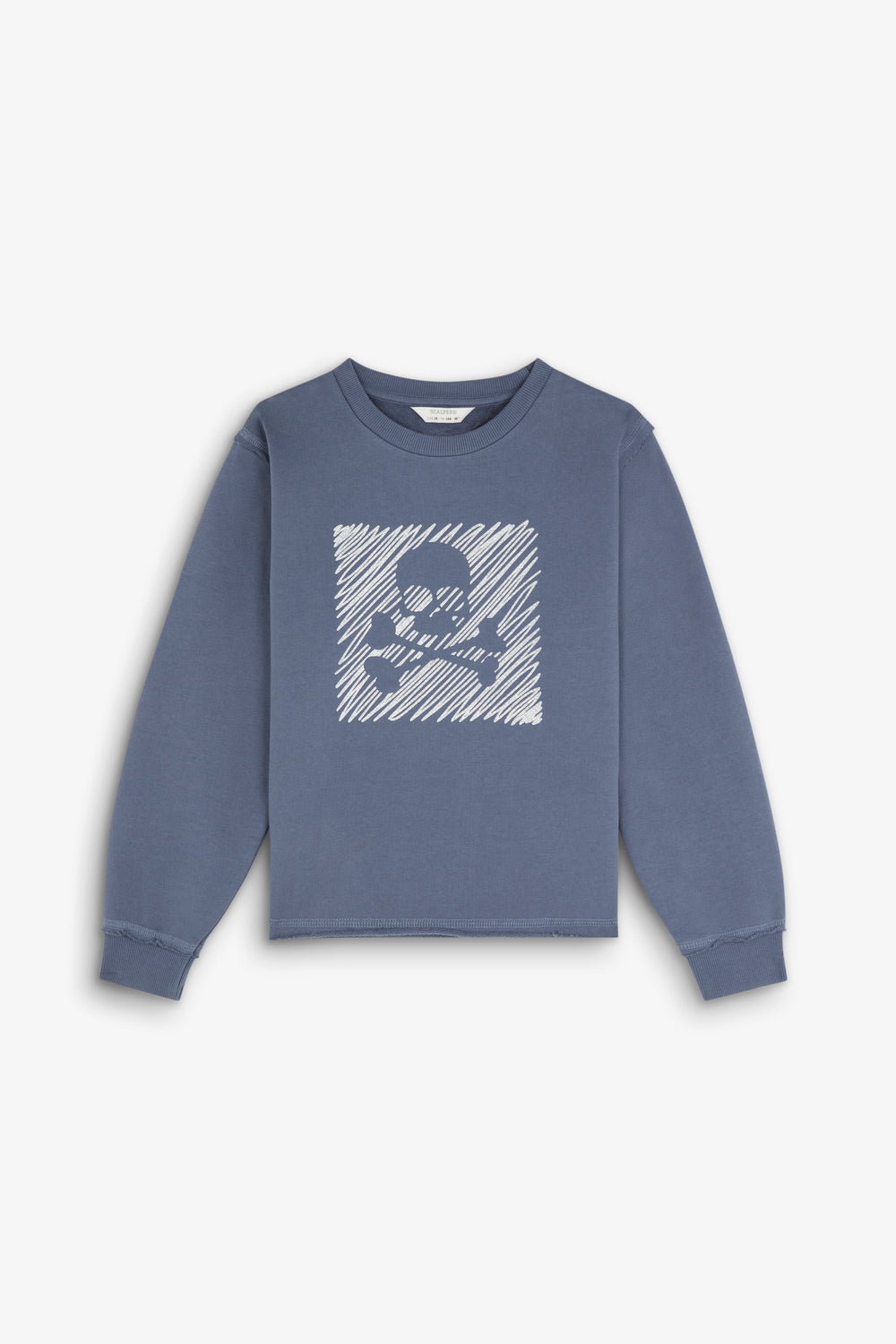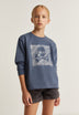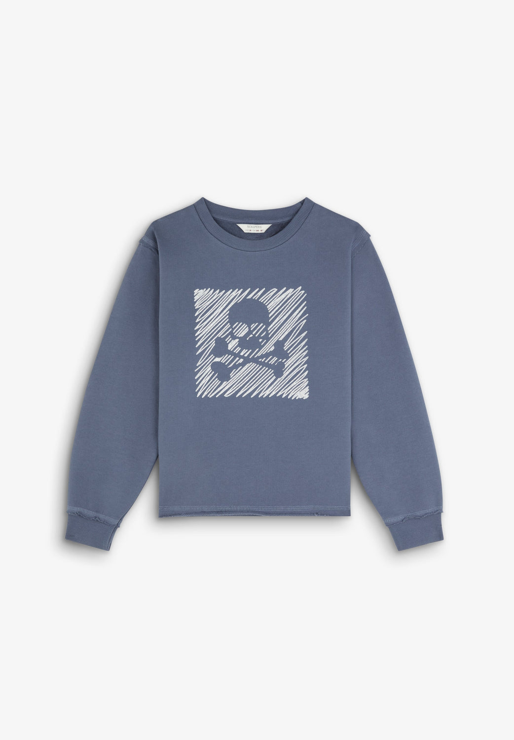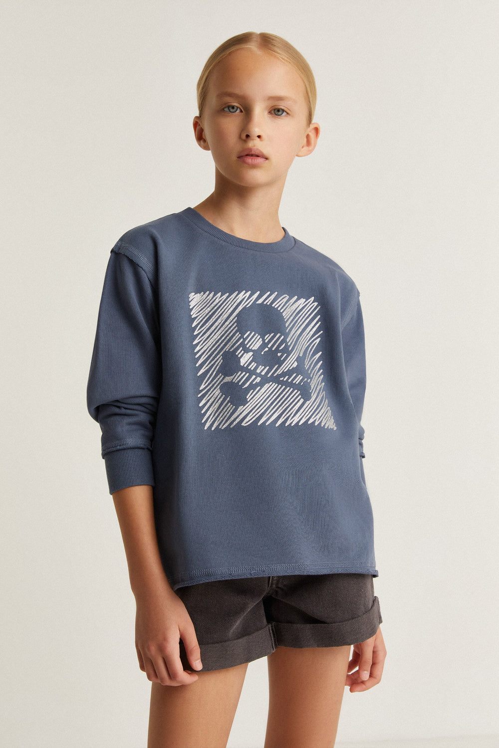 Sudadera con print frontal en glitter de calavera. Confeccionada en 100% Algodón BCI. Corte Regular fit. Cuello redondo. Manga larga. Acabados en rib. Detalle de bajo desflecado.