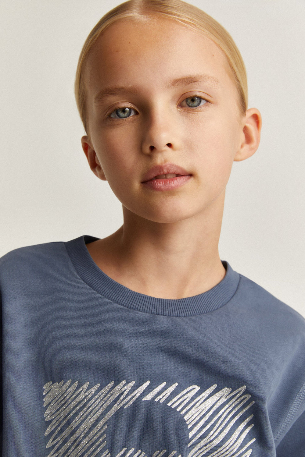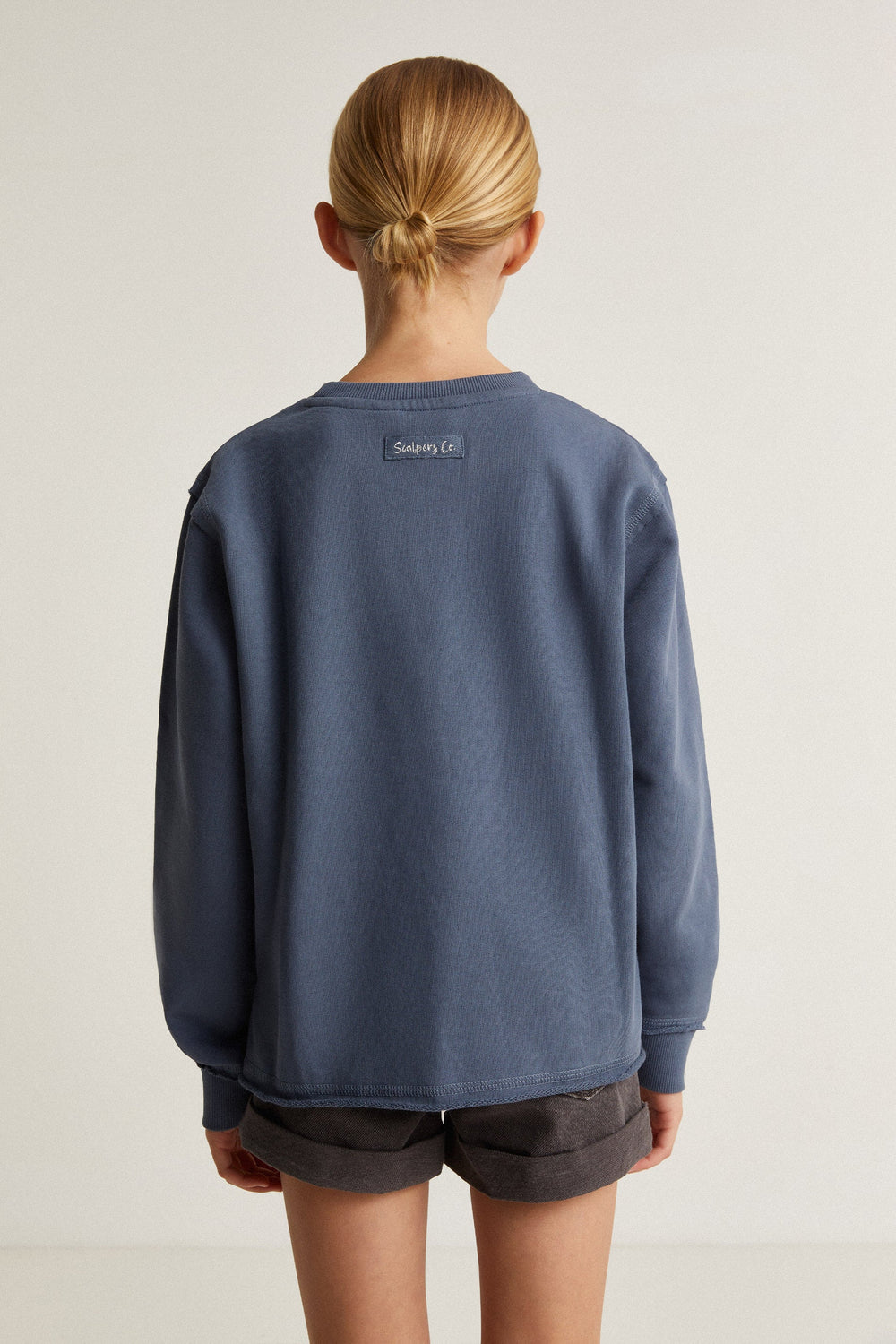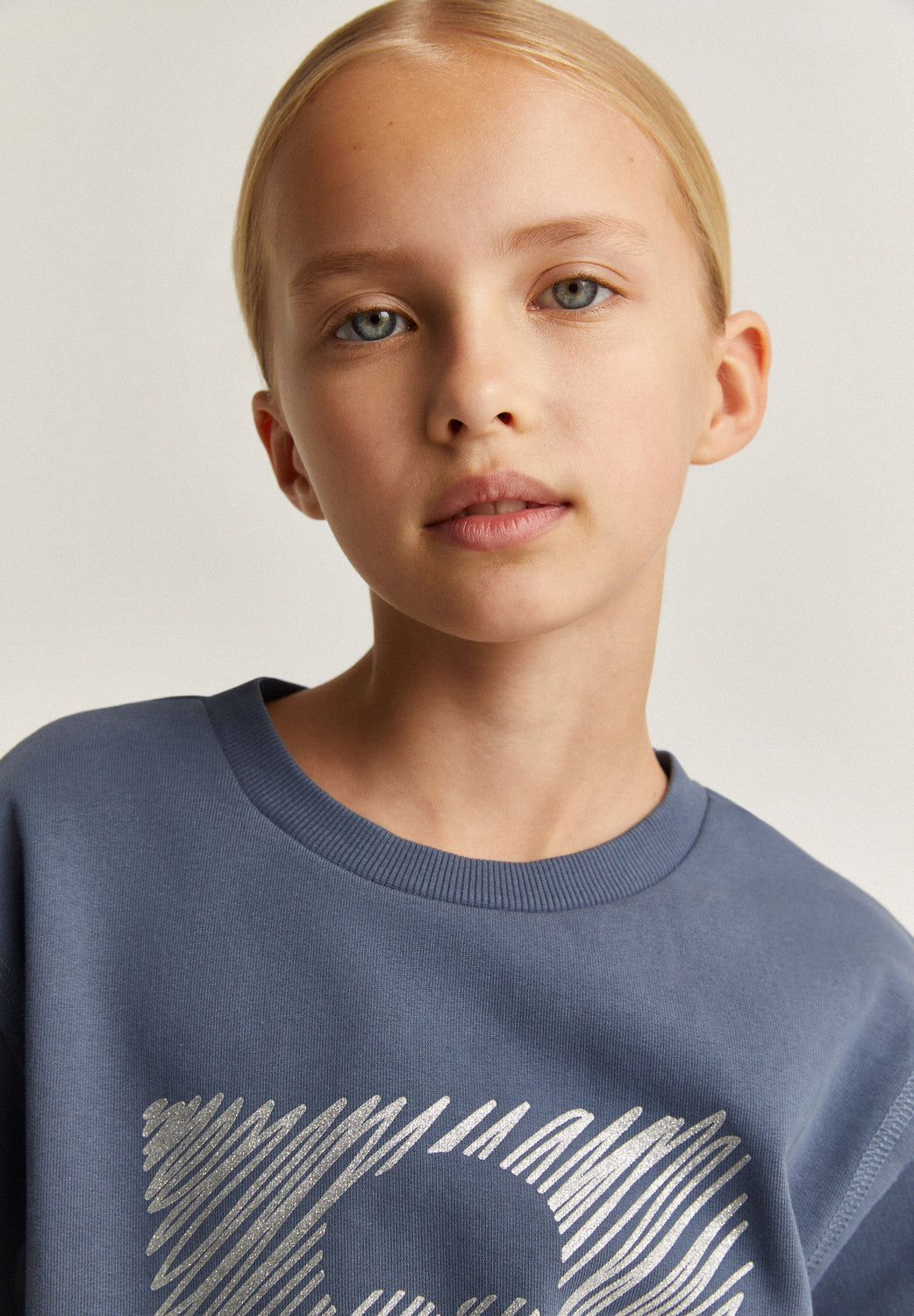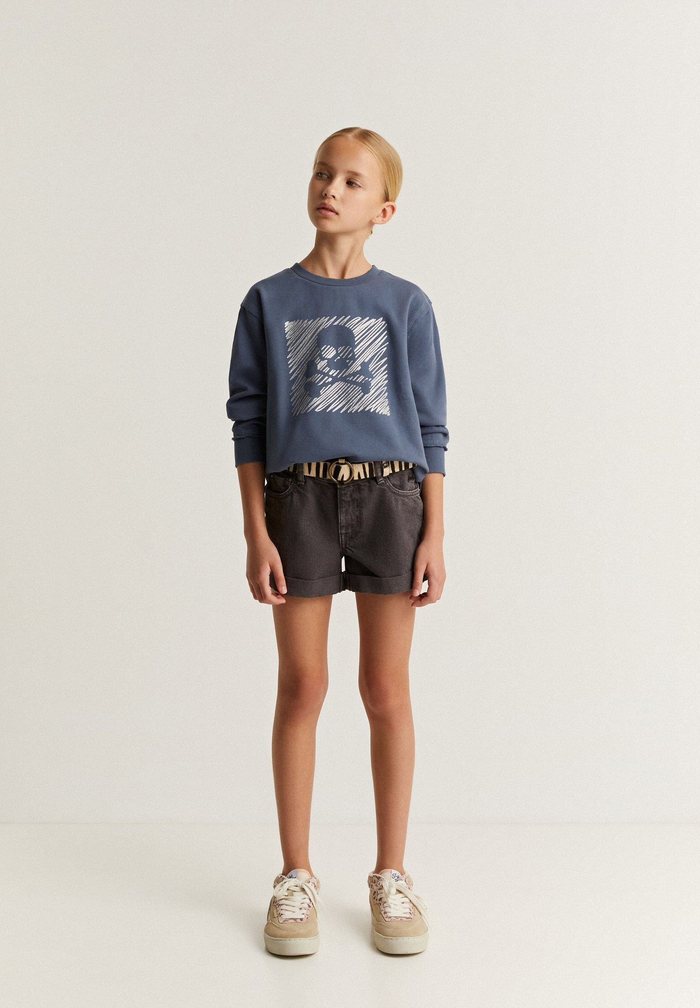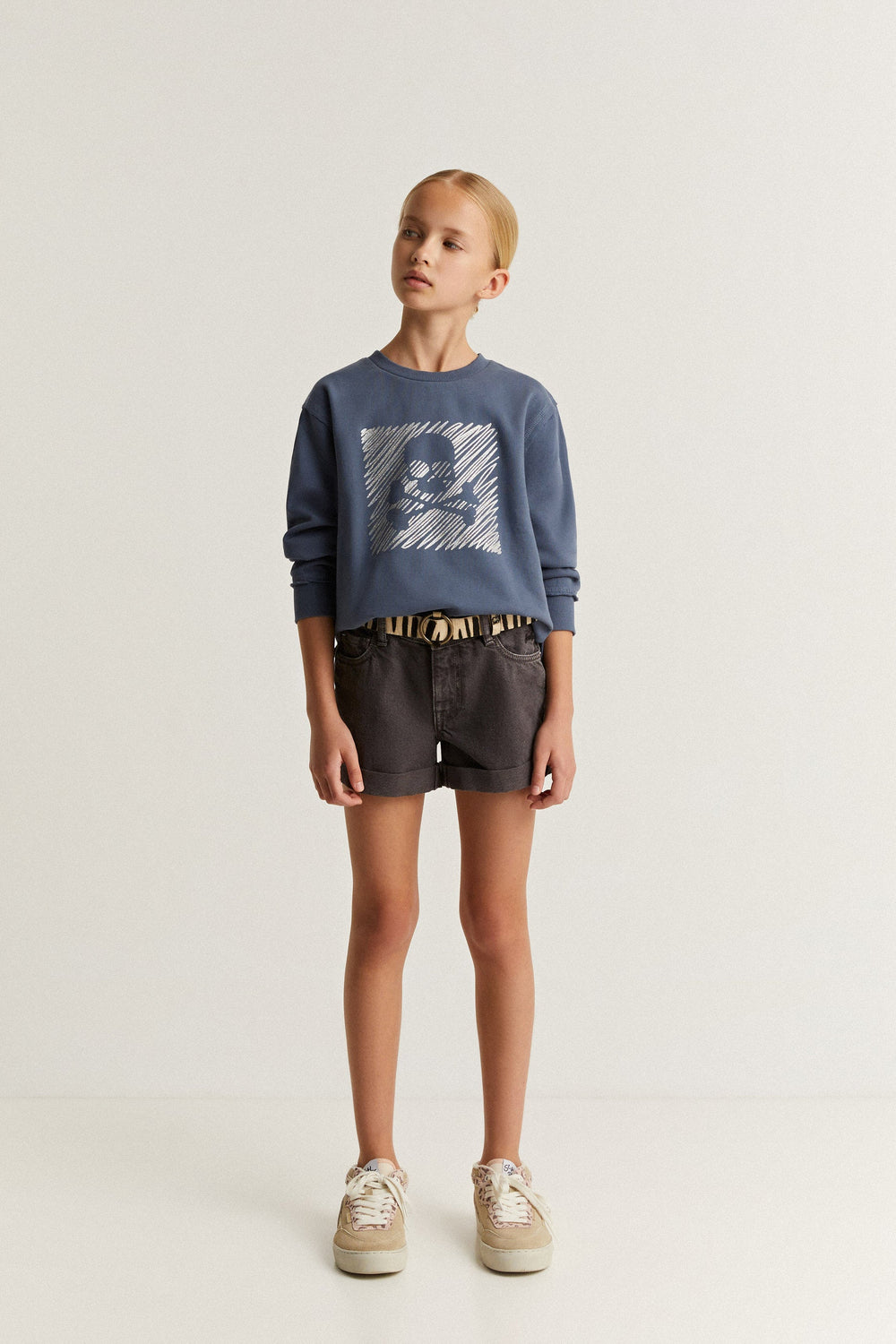 Sudadera con print frontal en glitter de calavera. Confeccionada en 100% Algodón BCI. Corte Regular fit. Cuello redondo. Manga larga. Acabados en rib. Detalle de bajo desflecado.