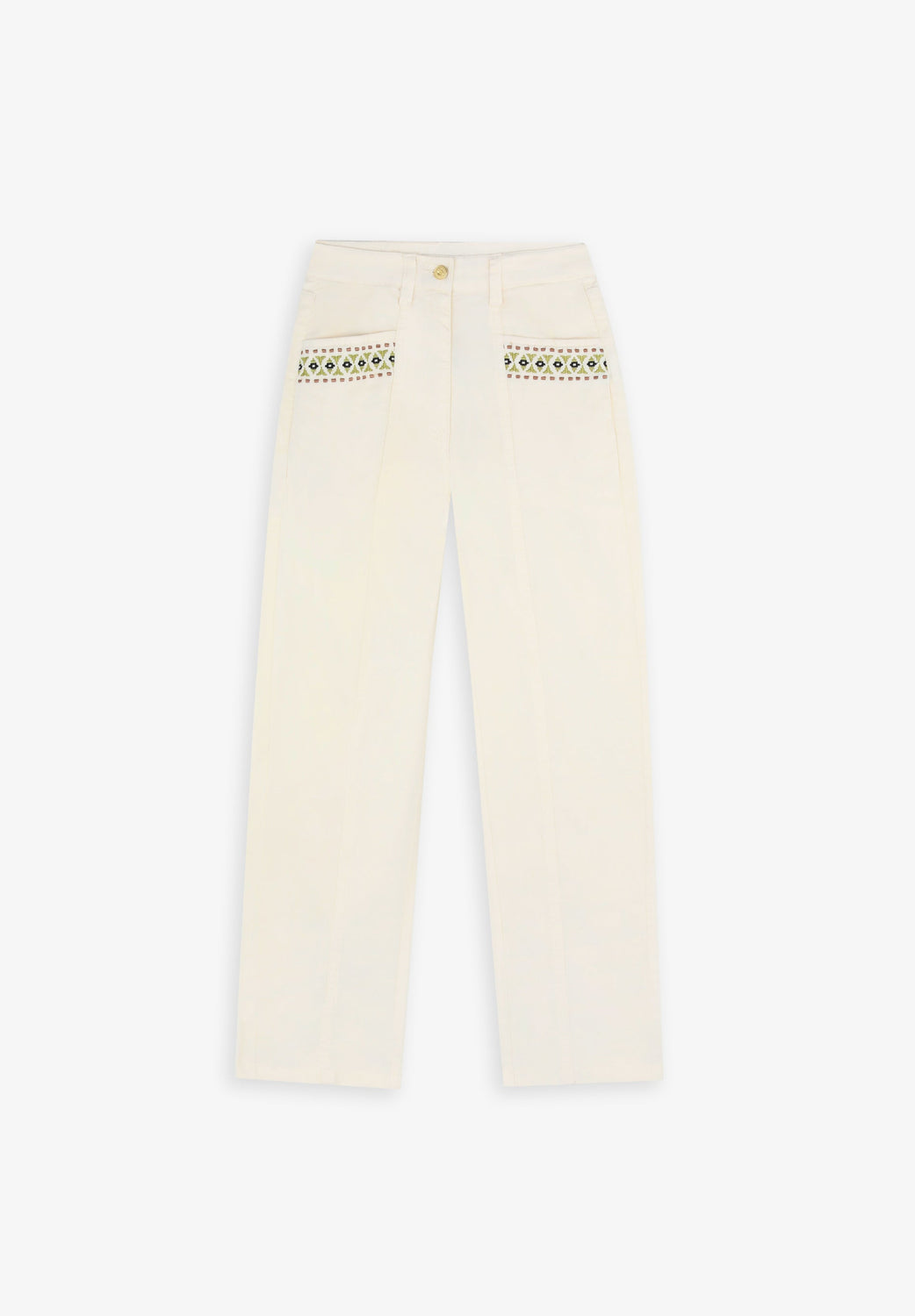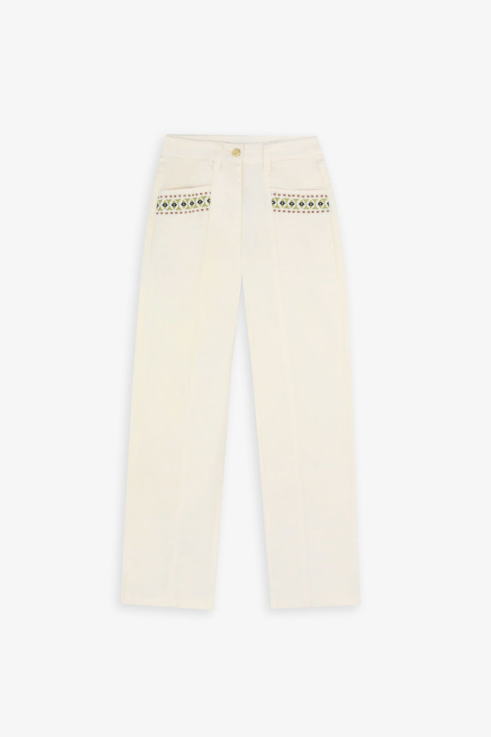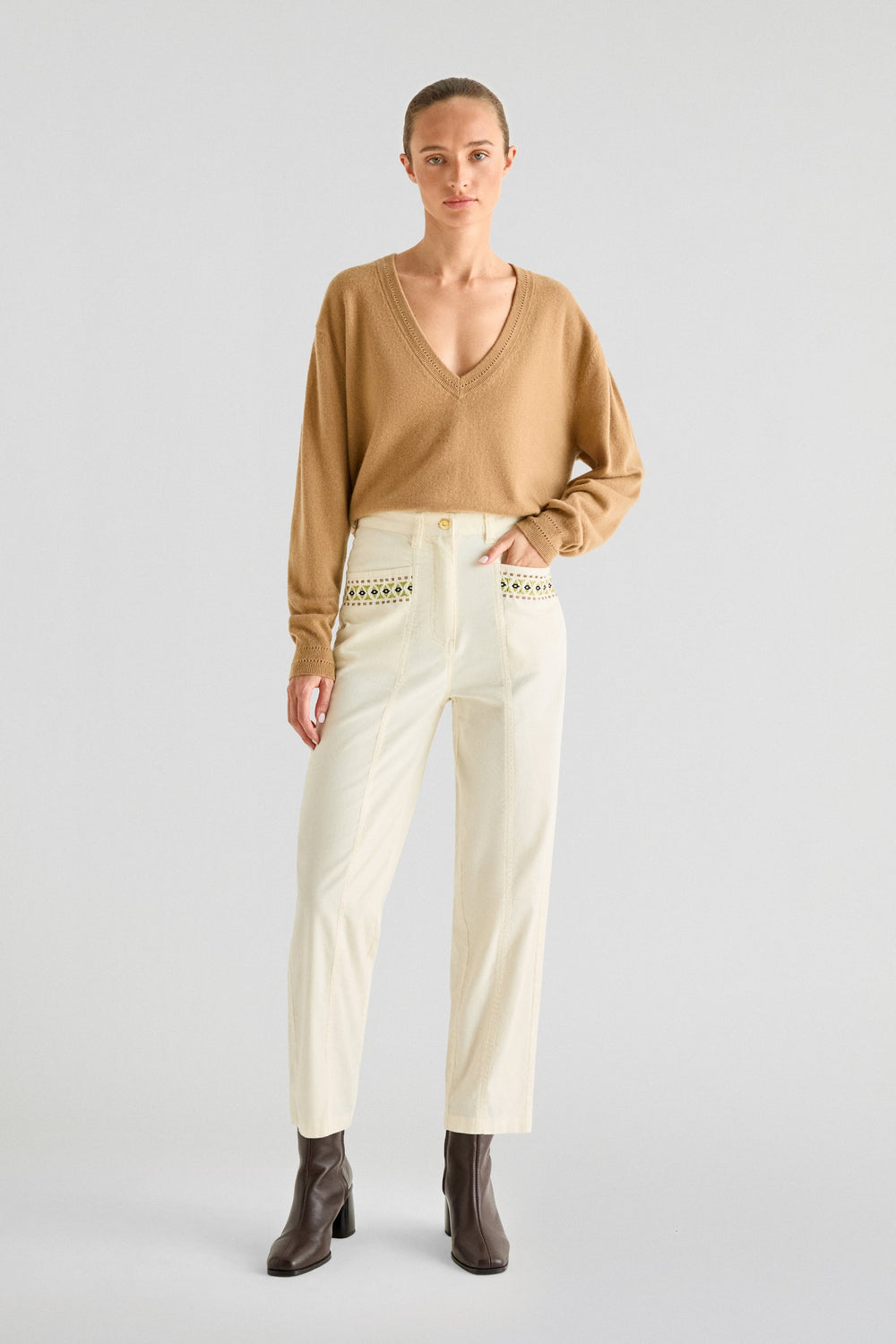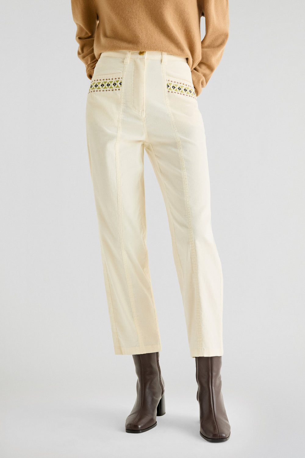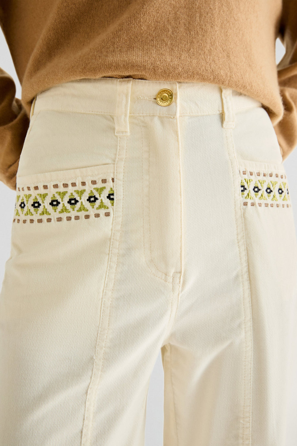 Pantalón chino confeccionado en algodón ligeramenta elástico con acabado aterciopelado. Regular fit, cierre con botón y cremallera. Bolsillos frontales y traseros y trabillas en cintura. Detalle de bordados en bolsillo.
