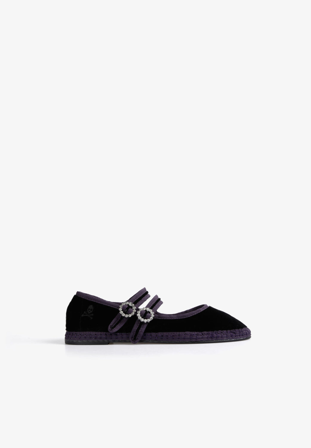 Slippers confeccionadas en terciopelo. Cierre con doble tira con hebilla joya y suela de goma. Calavera lateral.