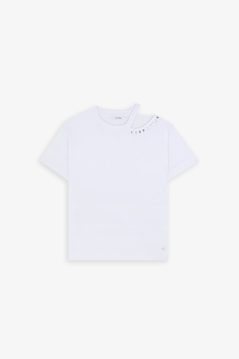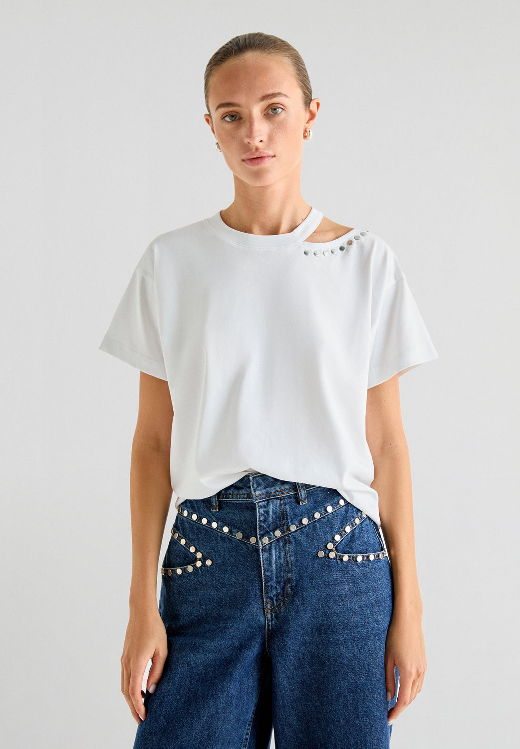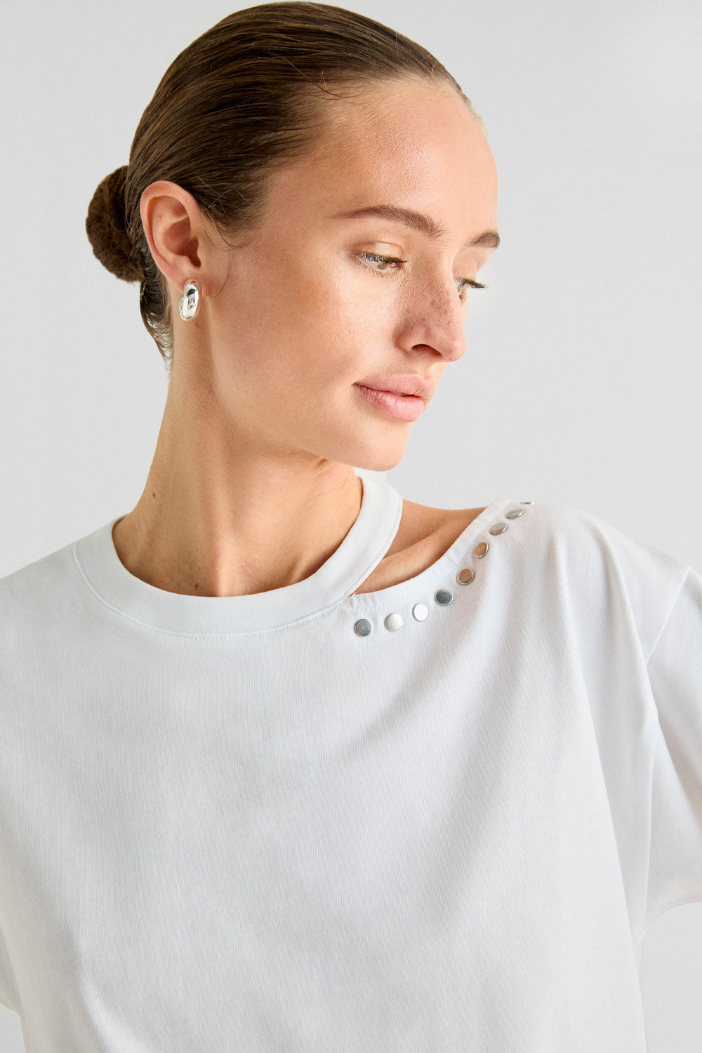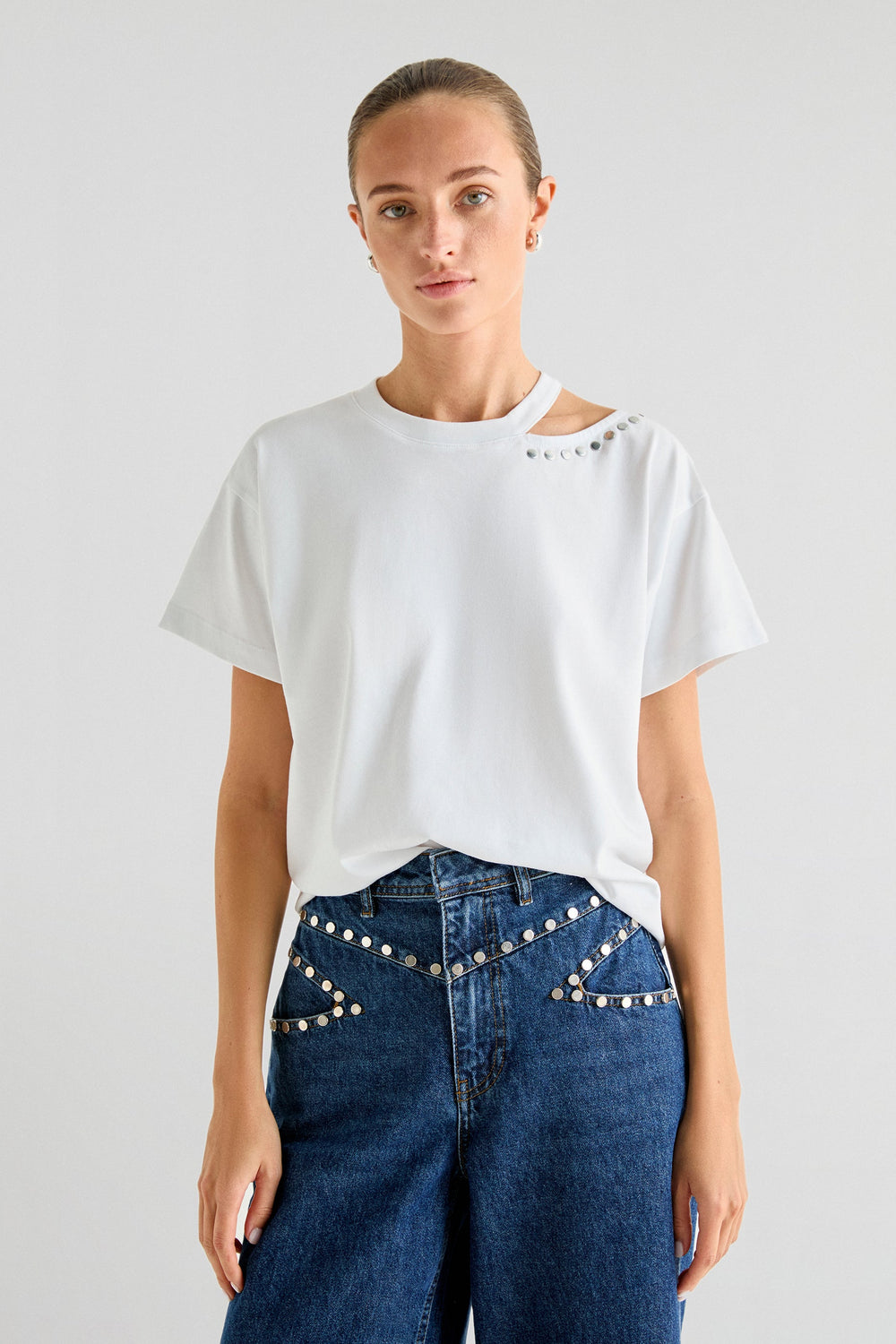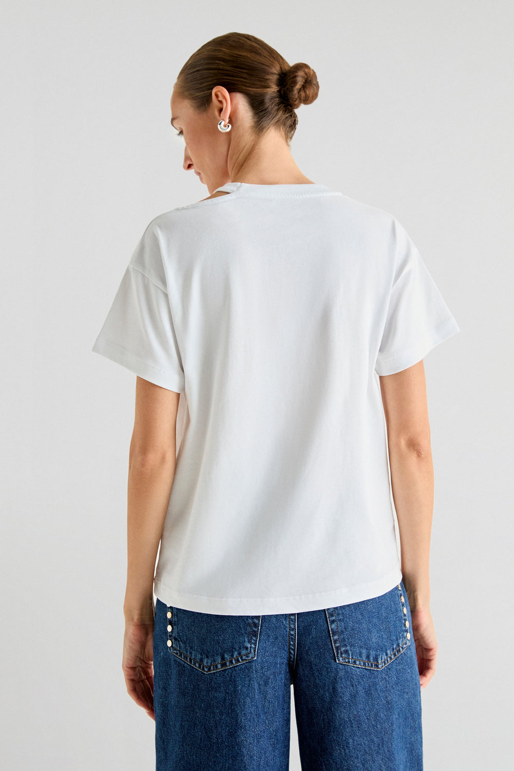 Camiseta confeccionada en 100% algodón BCI. Regular fit, cuello redondo con detalle de cut out y manga corta.