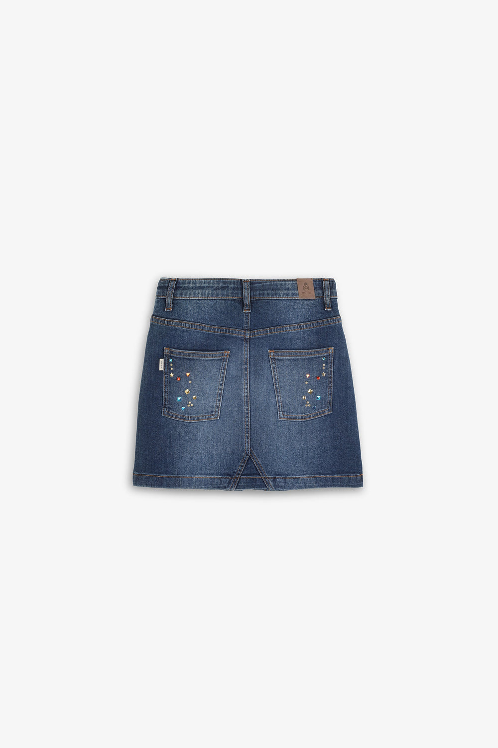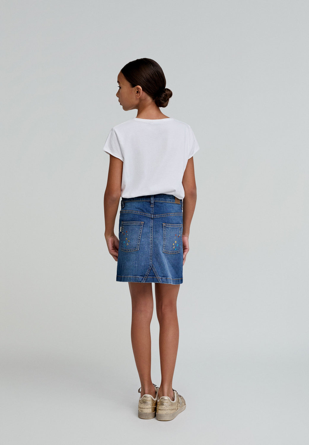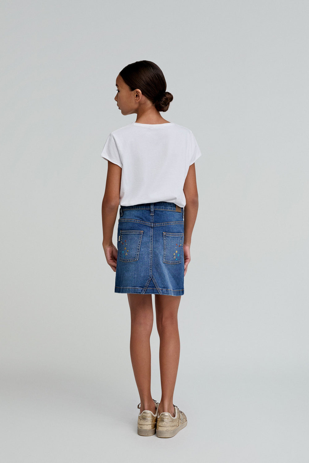 Falda mini denim confeccionada en algodón ligeramente elástico. Regular fit, cierre con botón y cremallera y bolsillos laterales y traseros. Trabillas en cintura.