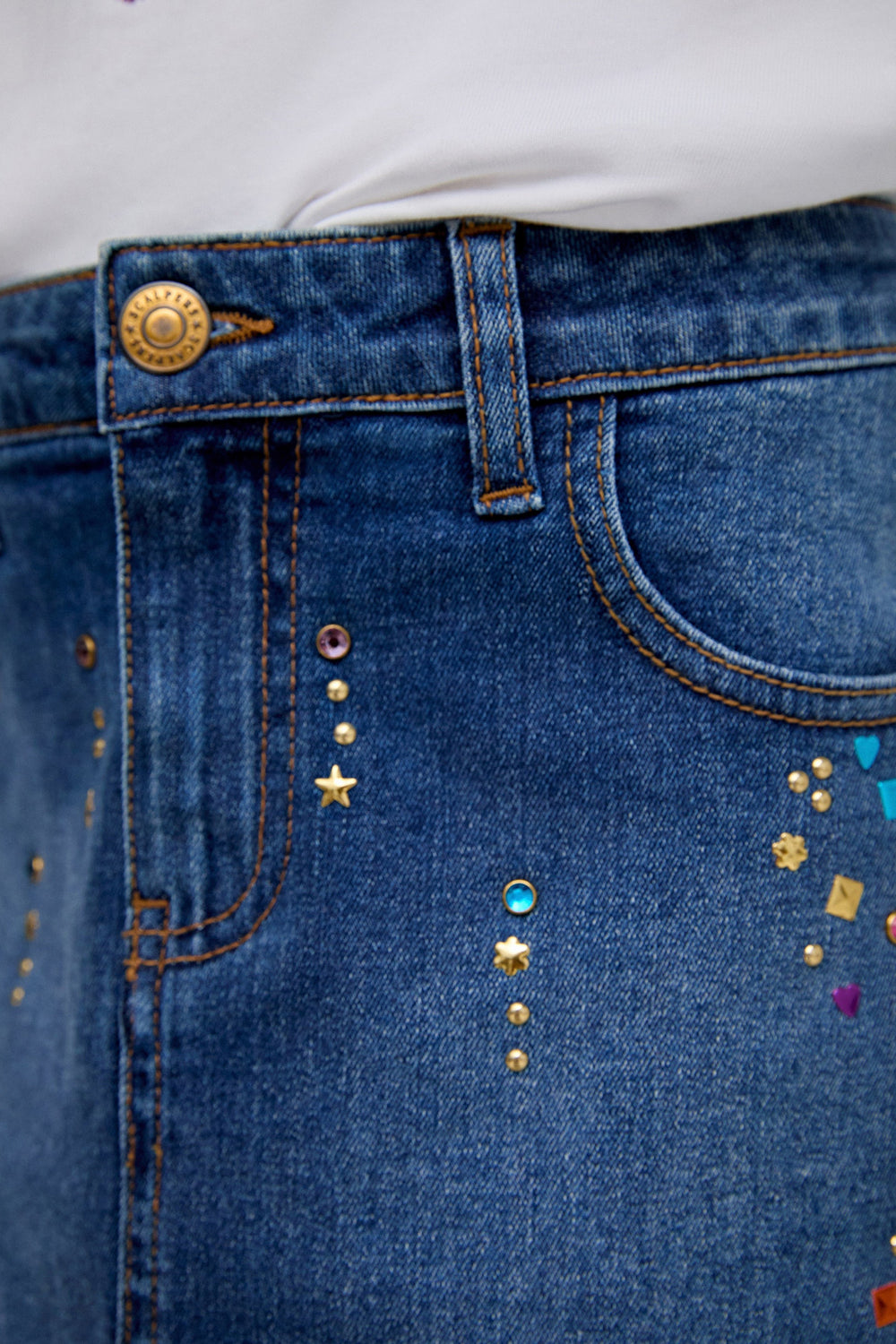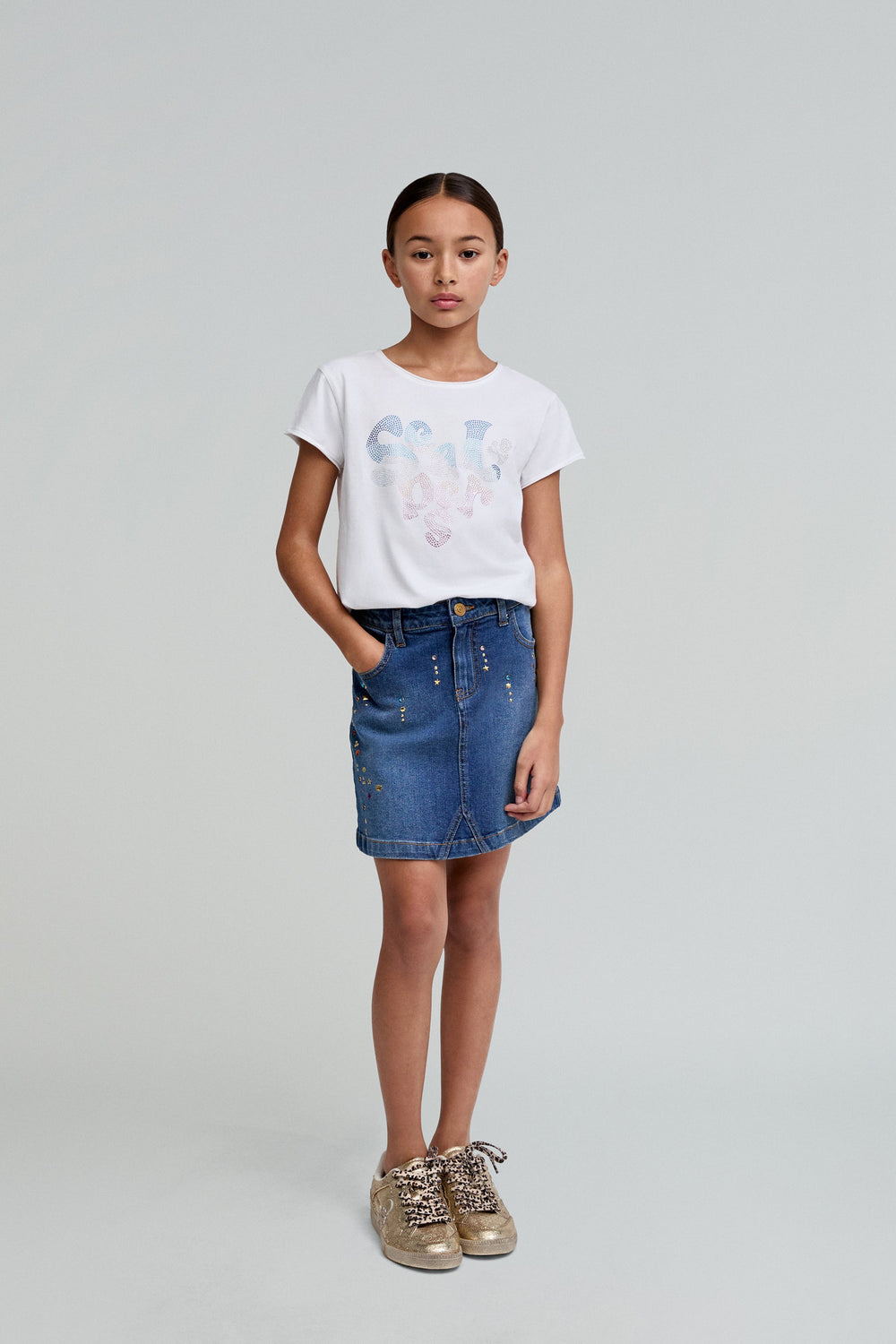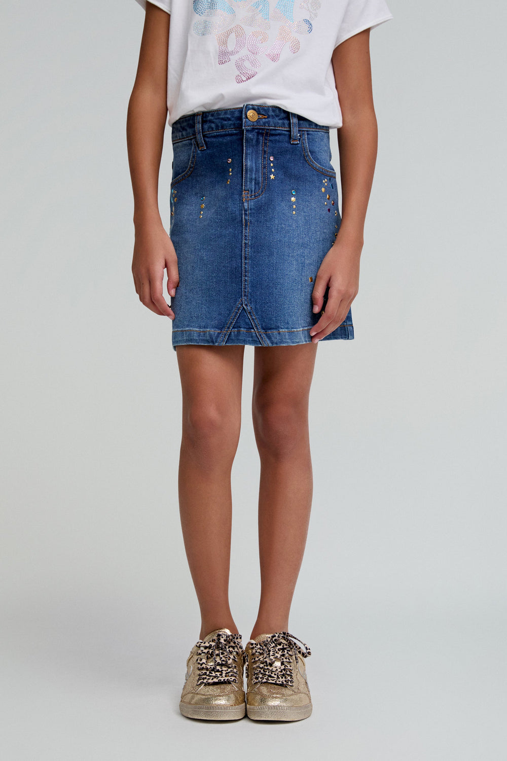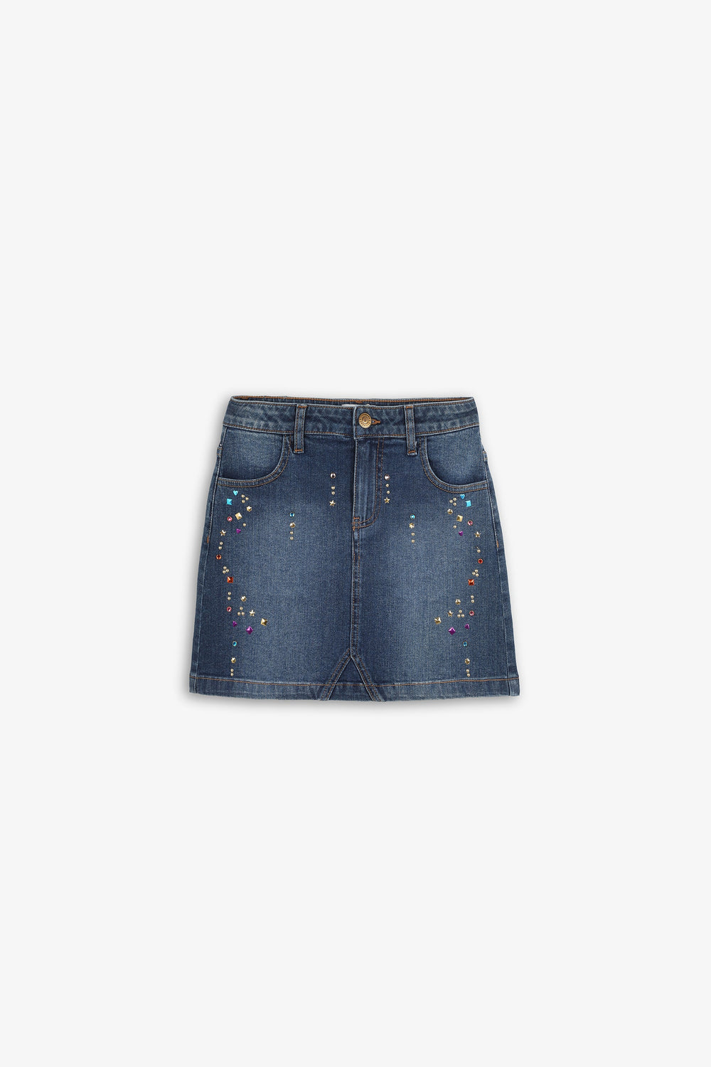 Falda mini denim confeccionada en algodón ligeramente elástico. Regular fit, cierre con botón y cremallera y bolsillos laterales y traseros. Trabillas en cintura.