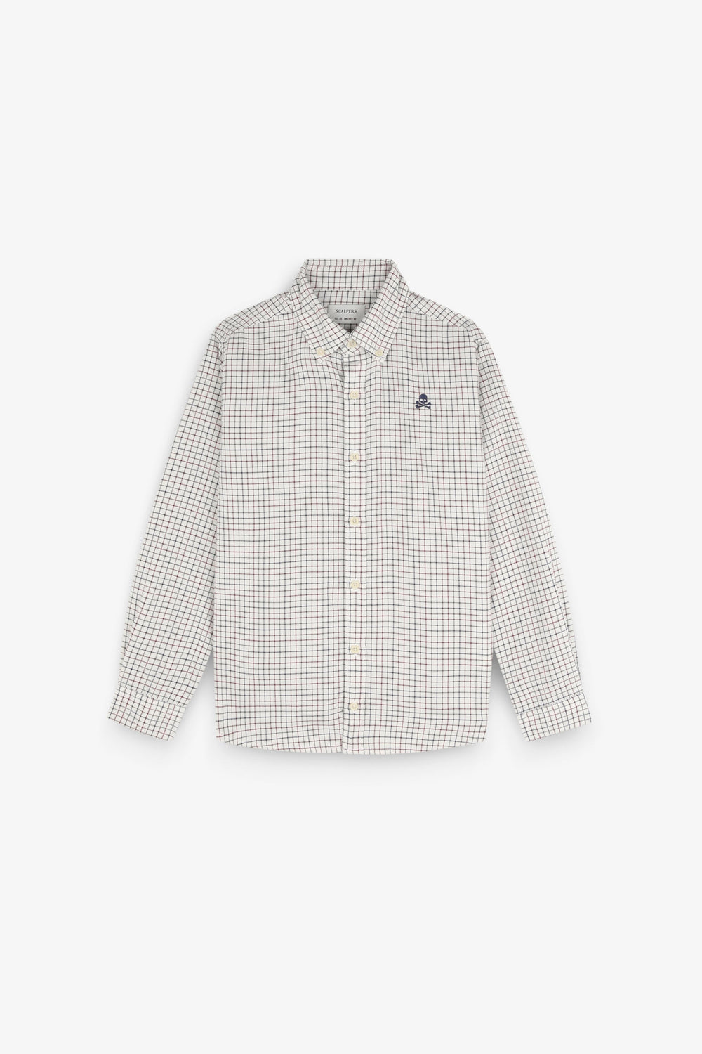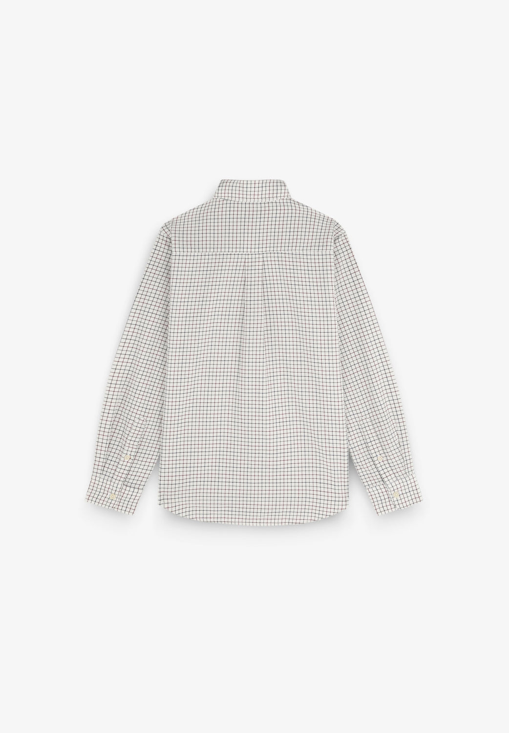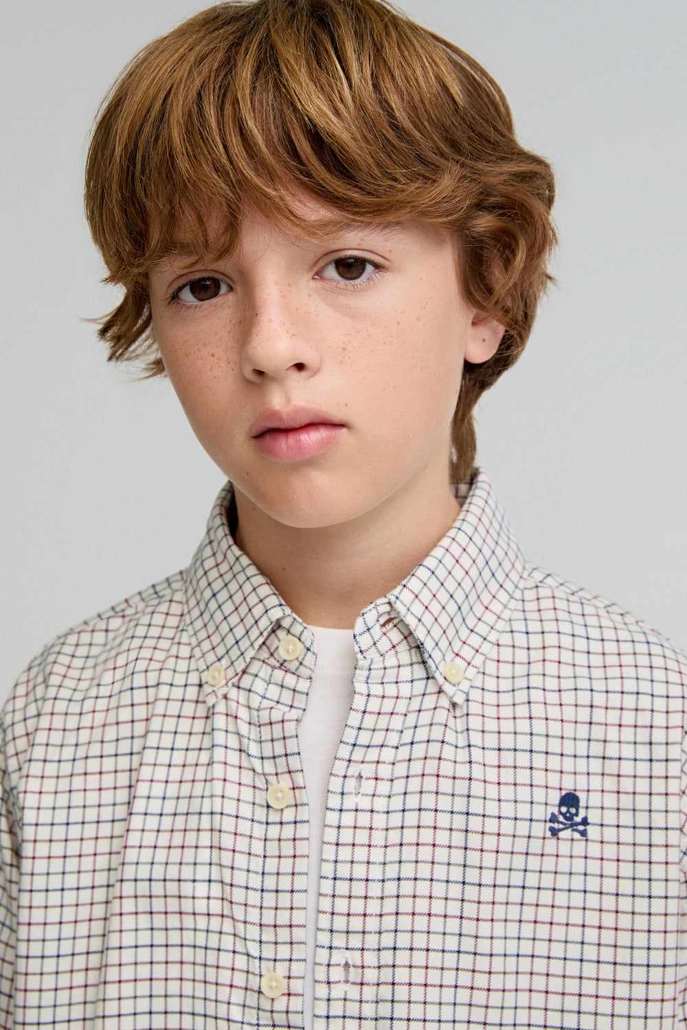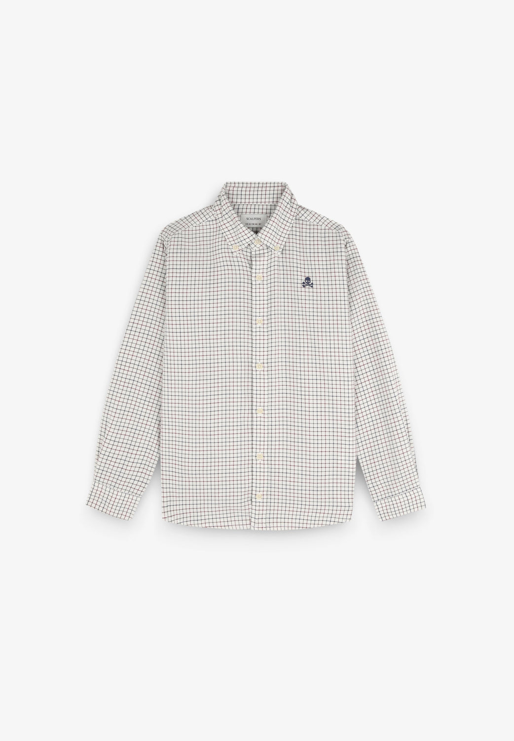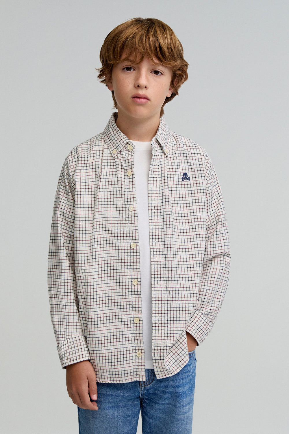 Camisa de cuadros confeccionada en 100% algodón BCI. Regular fit, cuello con botones y cierre con botones. Manga larga terminada en puño con botones y calavera bordada a contraste.