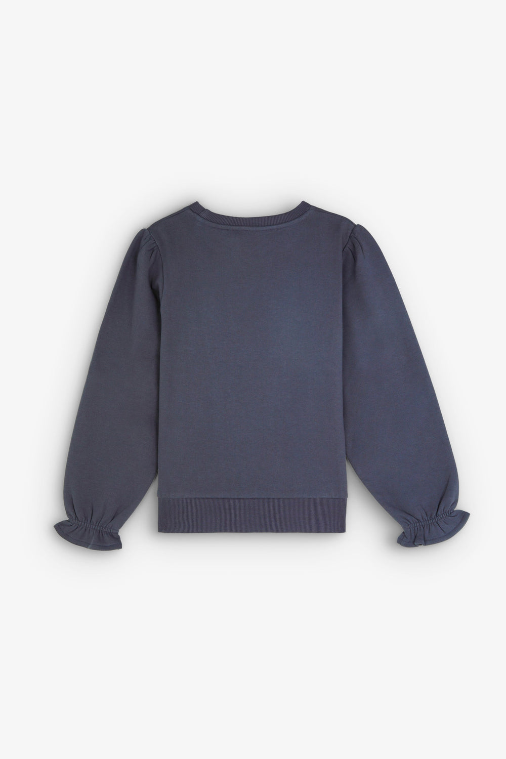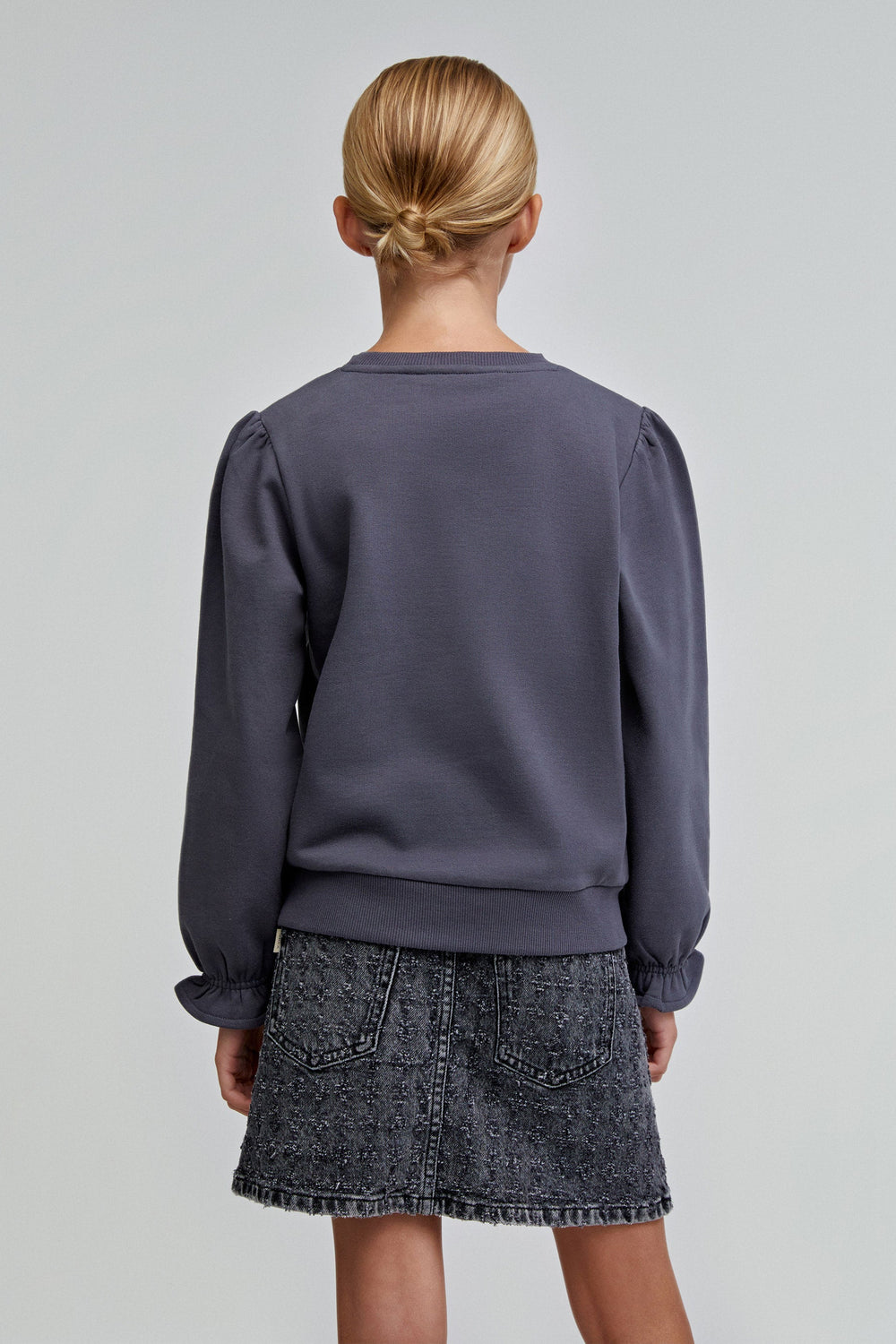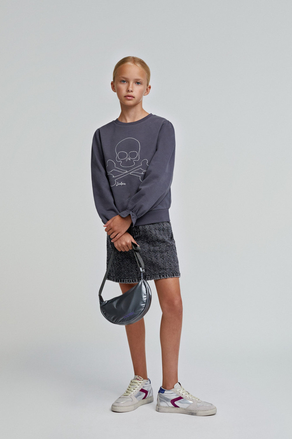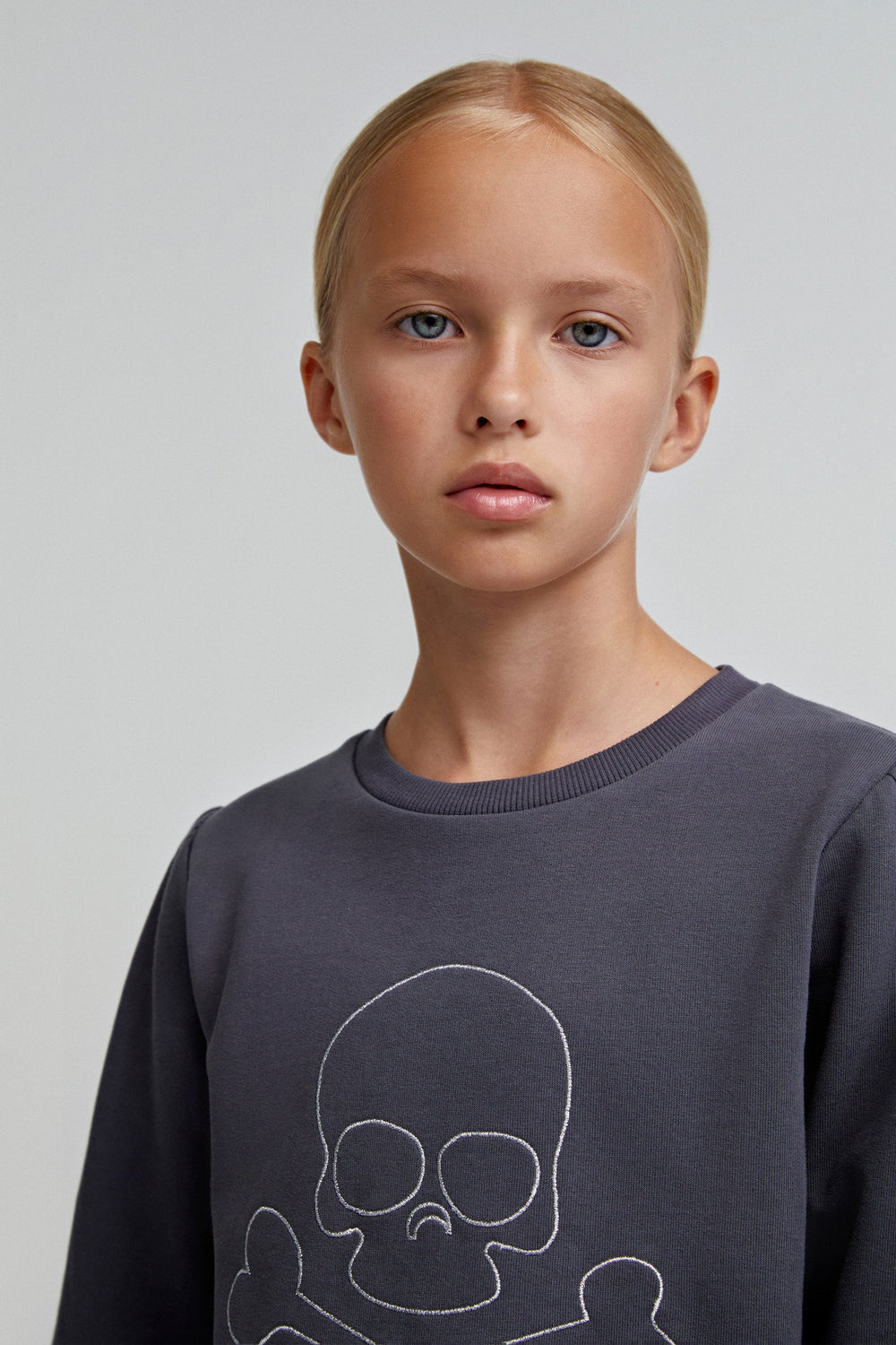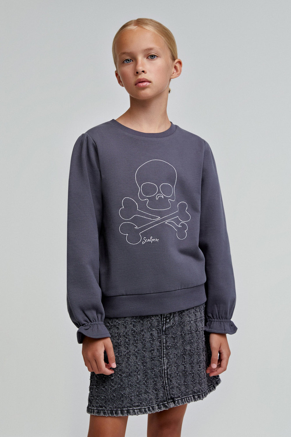 Sudadera con print calavera frontal. Confeccionada en 100% Algodón BCI. Corte Regular fit. Cuello redondo acabado en rib. Manga larga abullonada terminada en frunce.