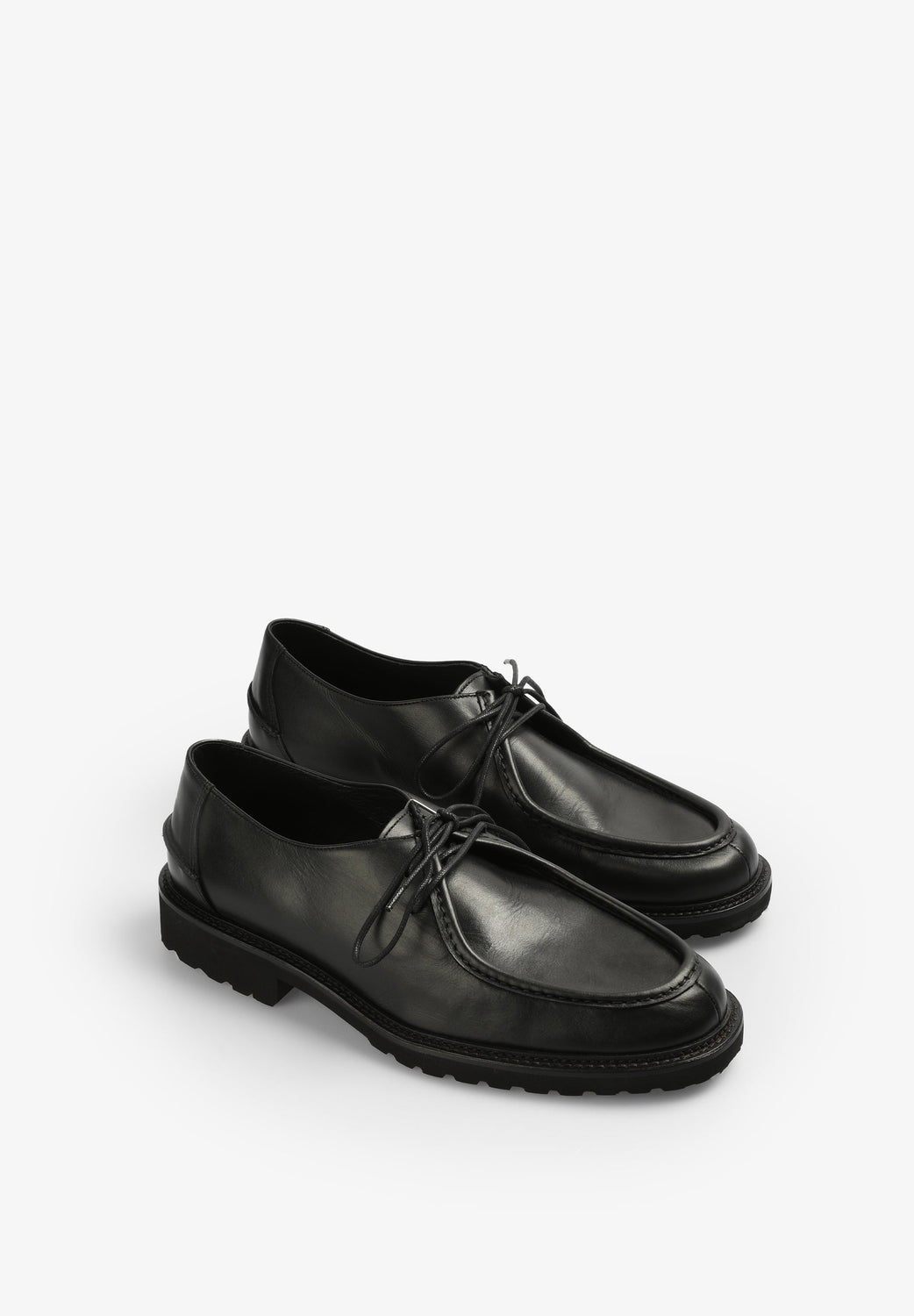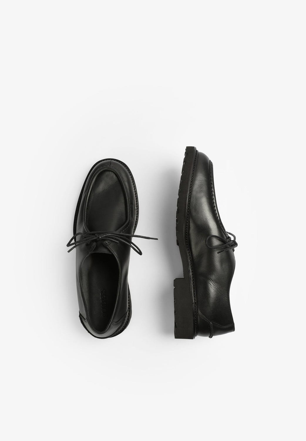 Zapatos tipo bordon confeccionados en 100% piel. Cierre con cordones y suela de goma dentada. Detalle de piping.