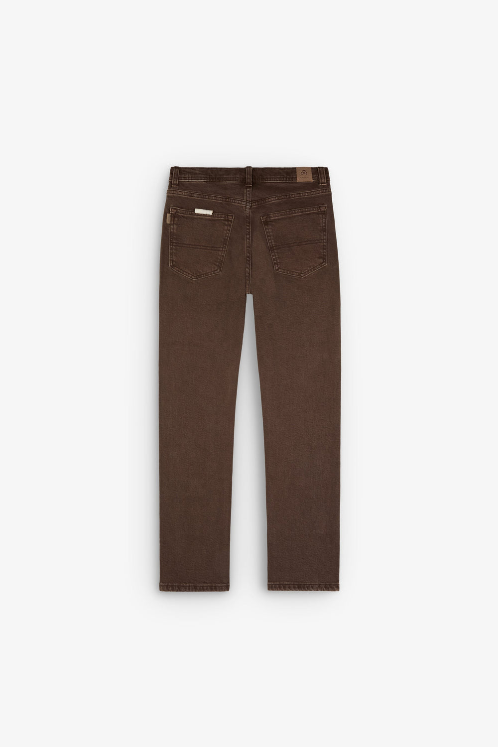 Pantalón recto lavado confeccionado en algodón ligeramente elástico. Corte recto, cerre con botón y cremallera, bolsillos delanteros y trasero.