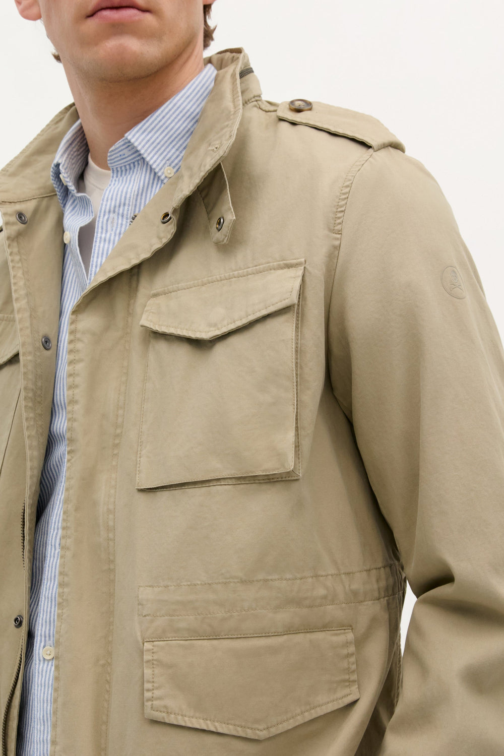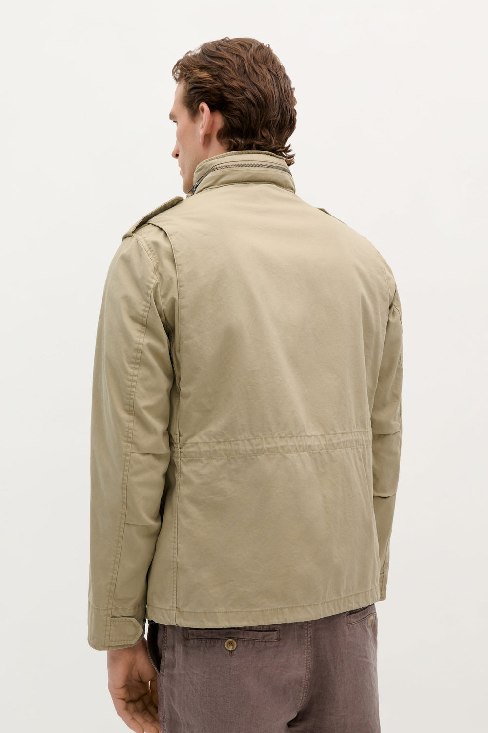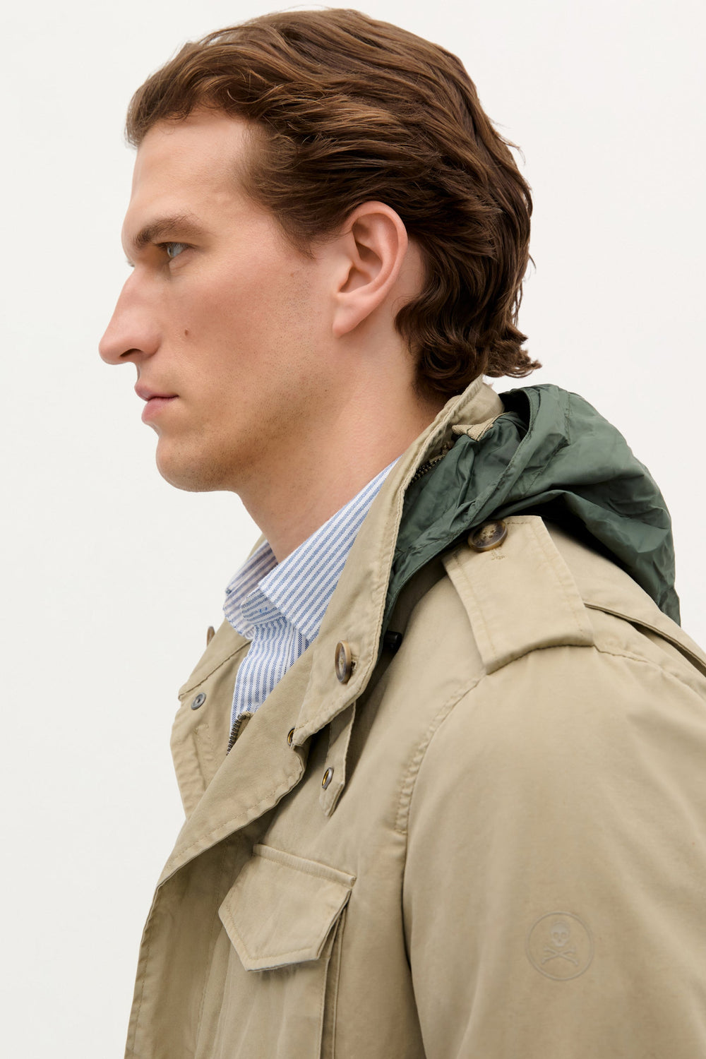 Chaqueta estilo militar confeccionada en 100% algodón BCI. Corte regular fit, cuello con capucha desmontable con cremallera. Cierre con cremallera de doble carro y snaps. Manga larga terminada en puños con cierre de snap y fuelles en la parte trasera.