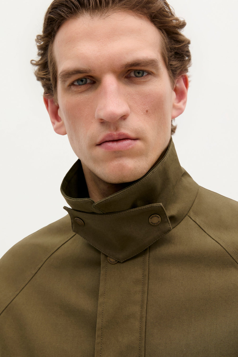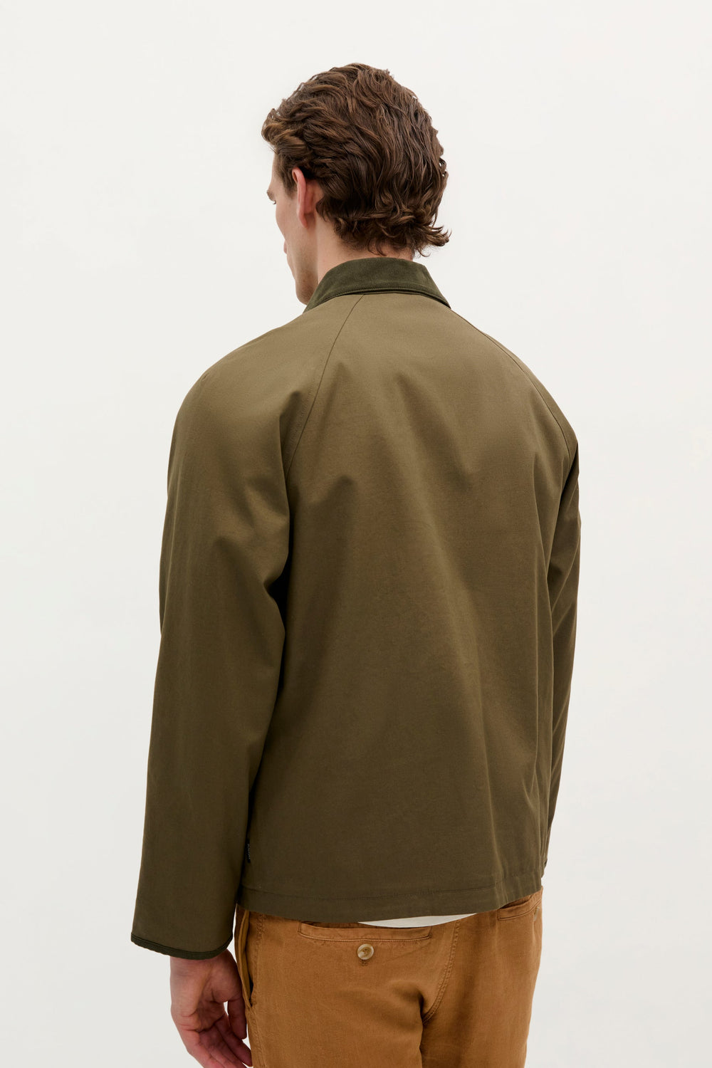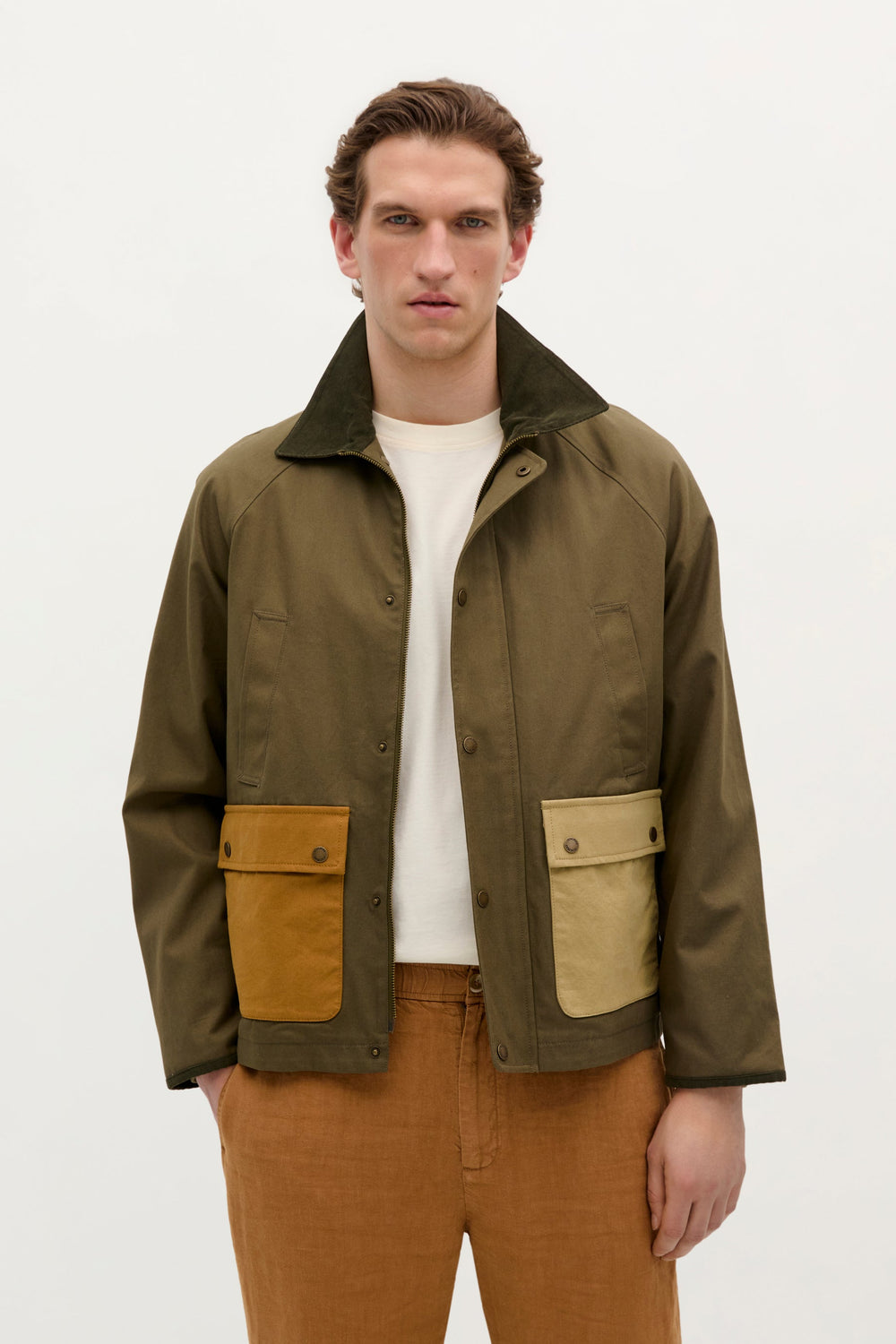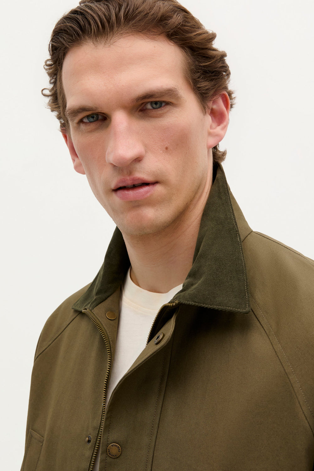 Parka ligera. Confeccionada en algodón 100% BCI con cuello camisero de pana y cierre con cremallera de doble carro y tapeta con snaps. Bolsillos frontales ocultos y bolsillos con cierre de tapeta con snaps bicolor. Acabado de rib en el puño.