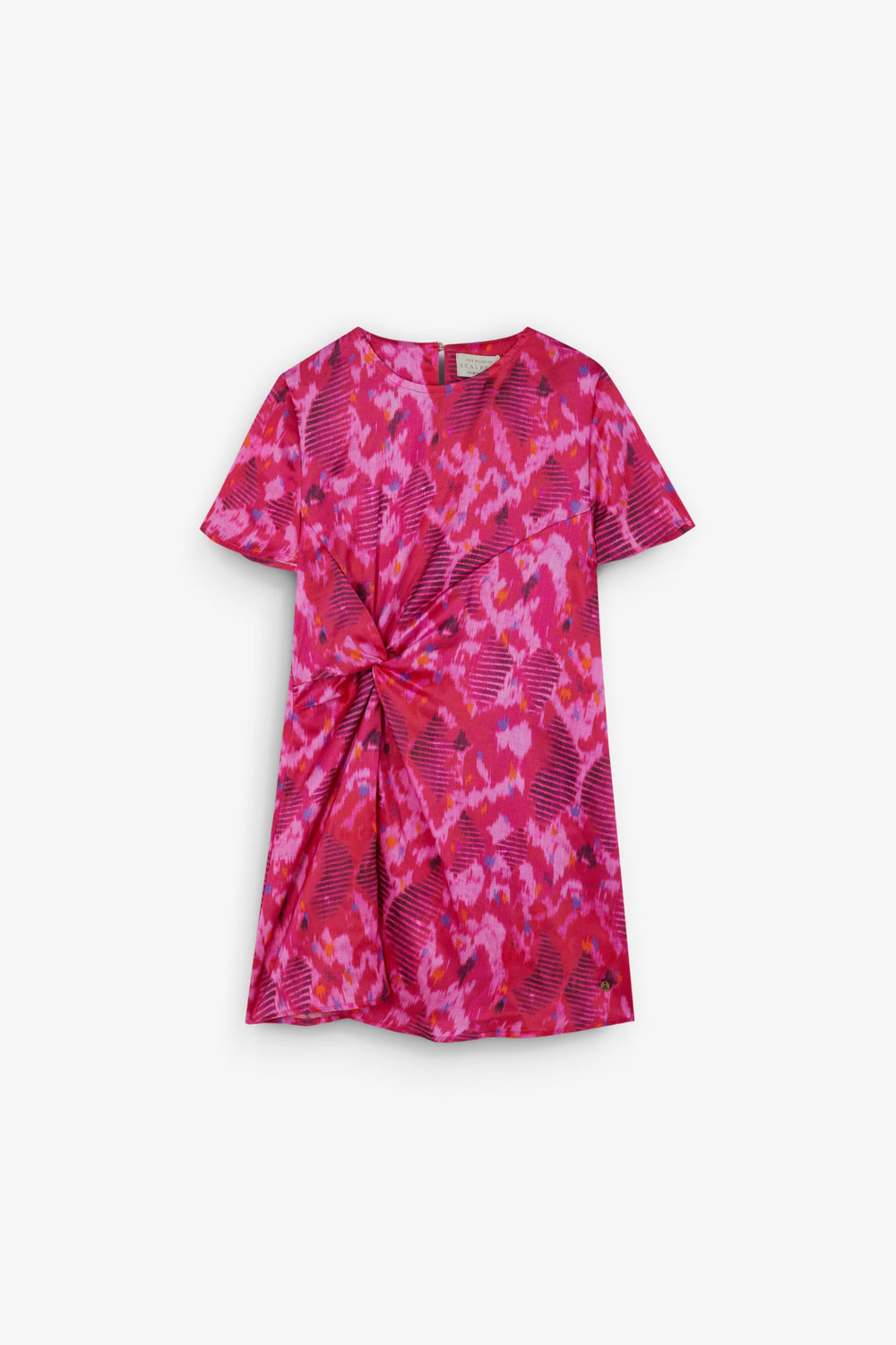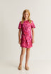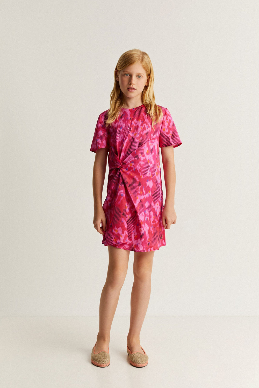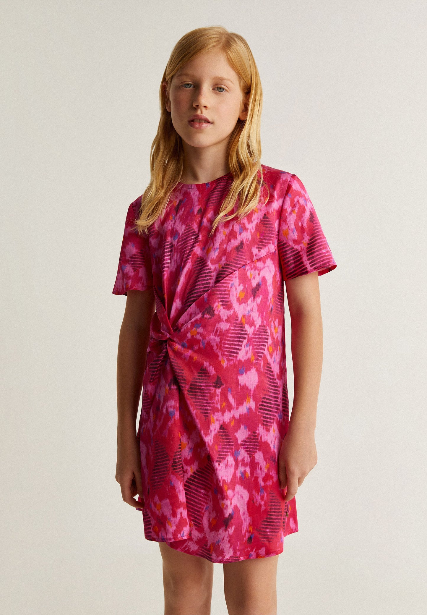 Vestido confeccionado en tejido fluido. Regular fit, cuello redondo y manga corta. Nudo lateral.