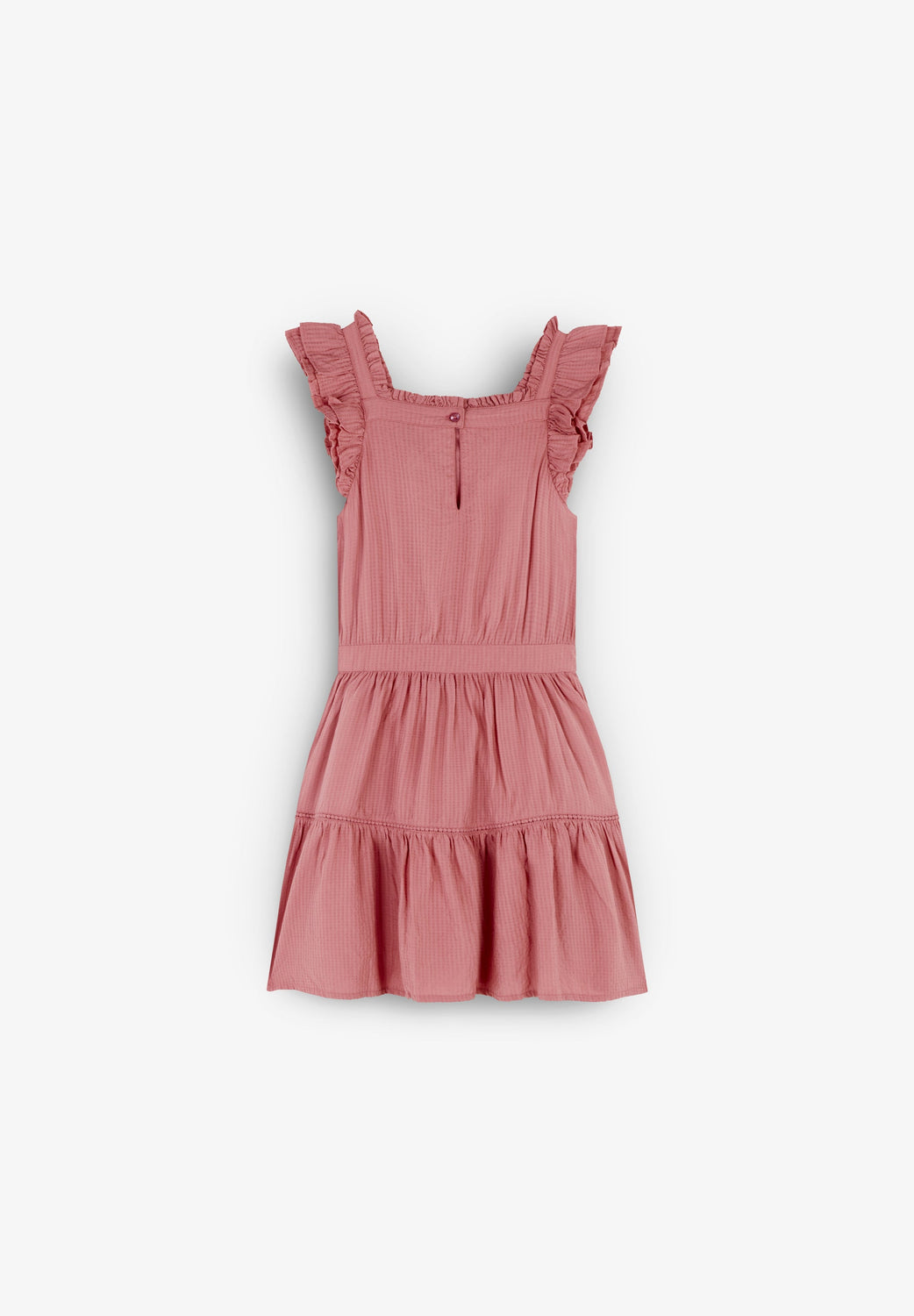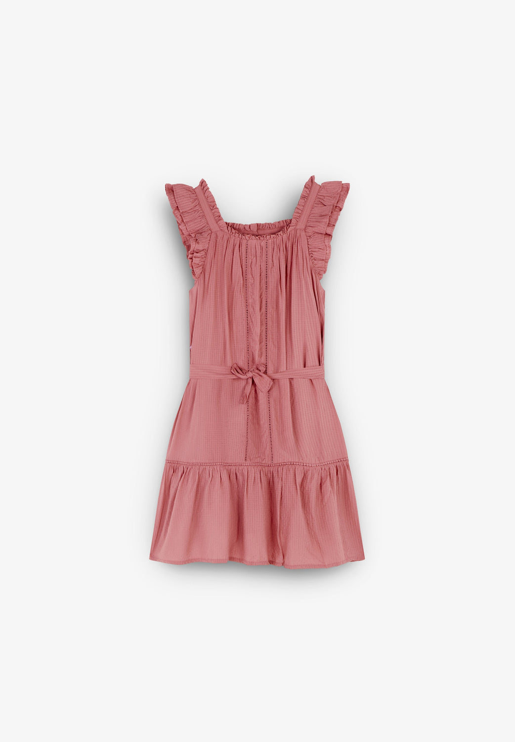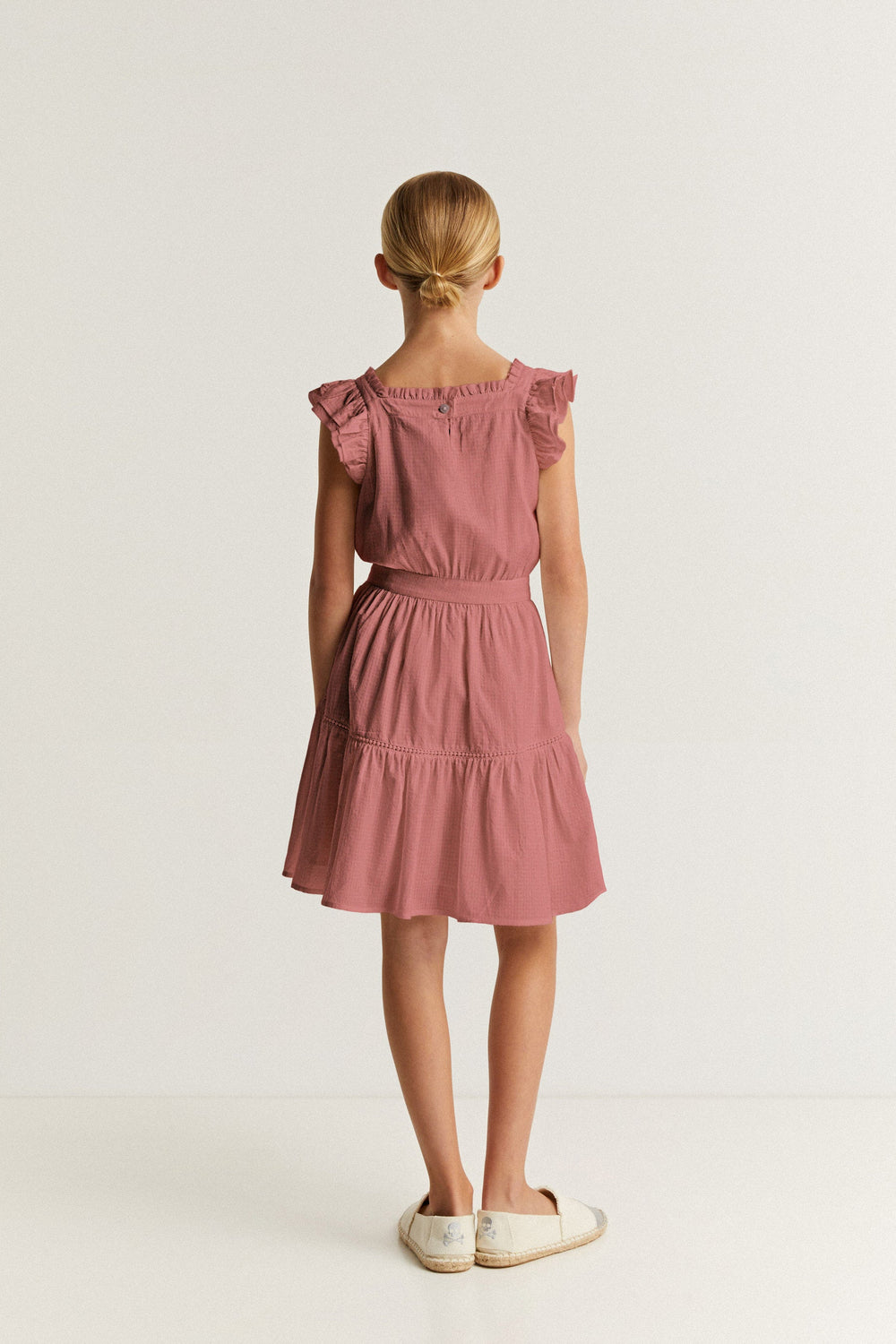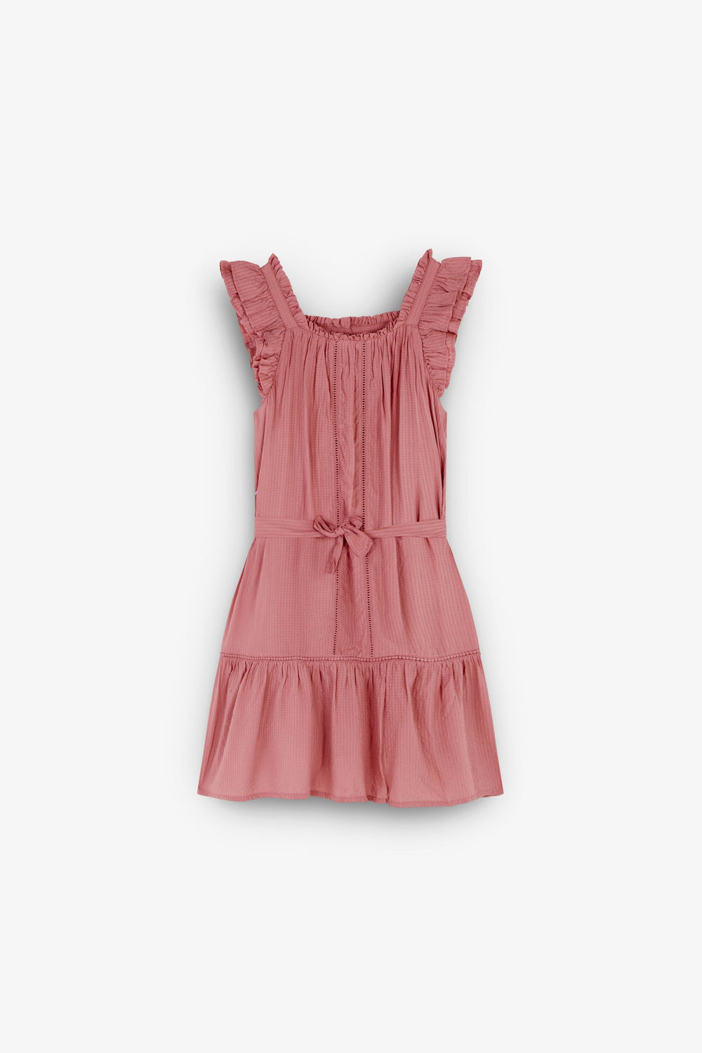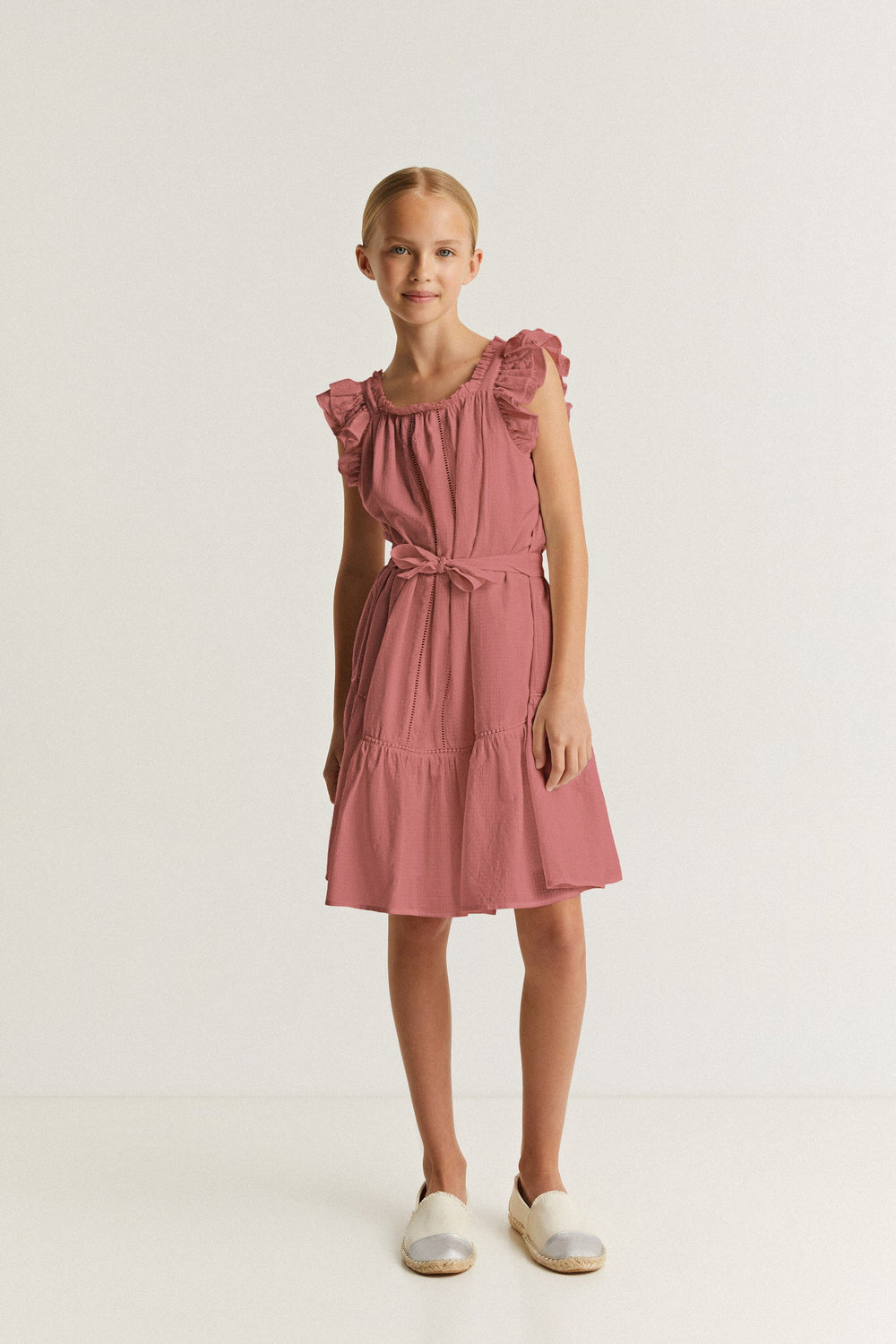 Vestido con volante y lazada en la cintura. Cuello redondo con frunce. Manga corta con detalle de volante. Confeccionado en 100% algodón. Corte Regular Fit.