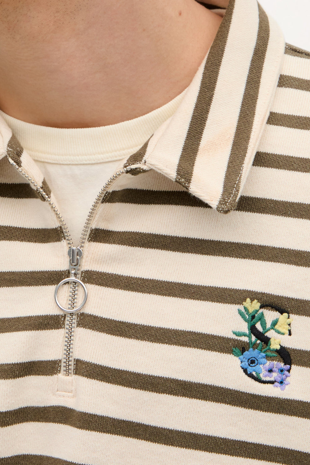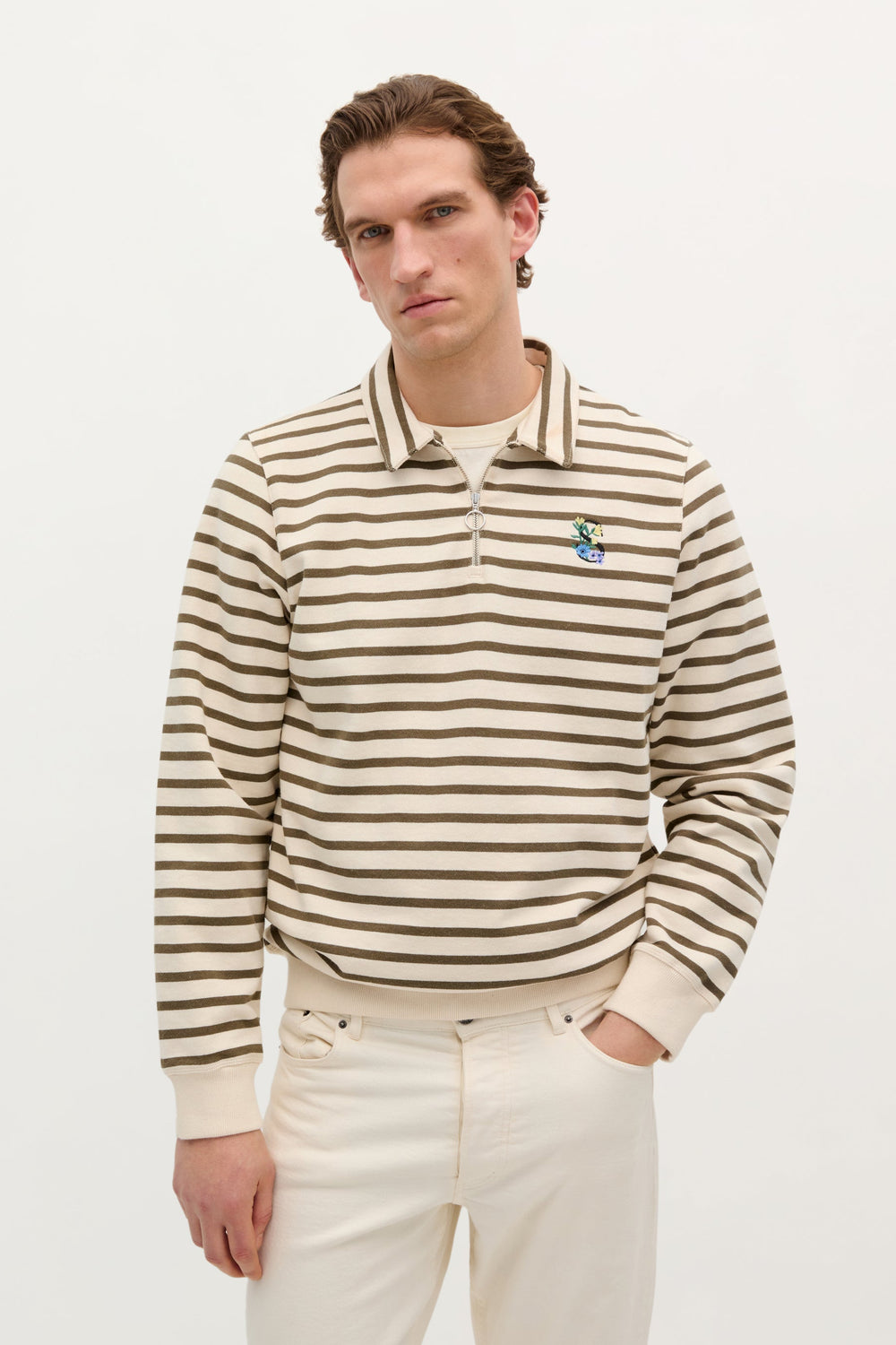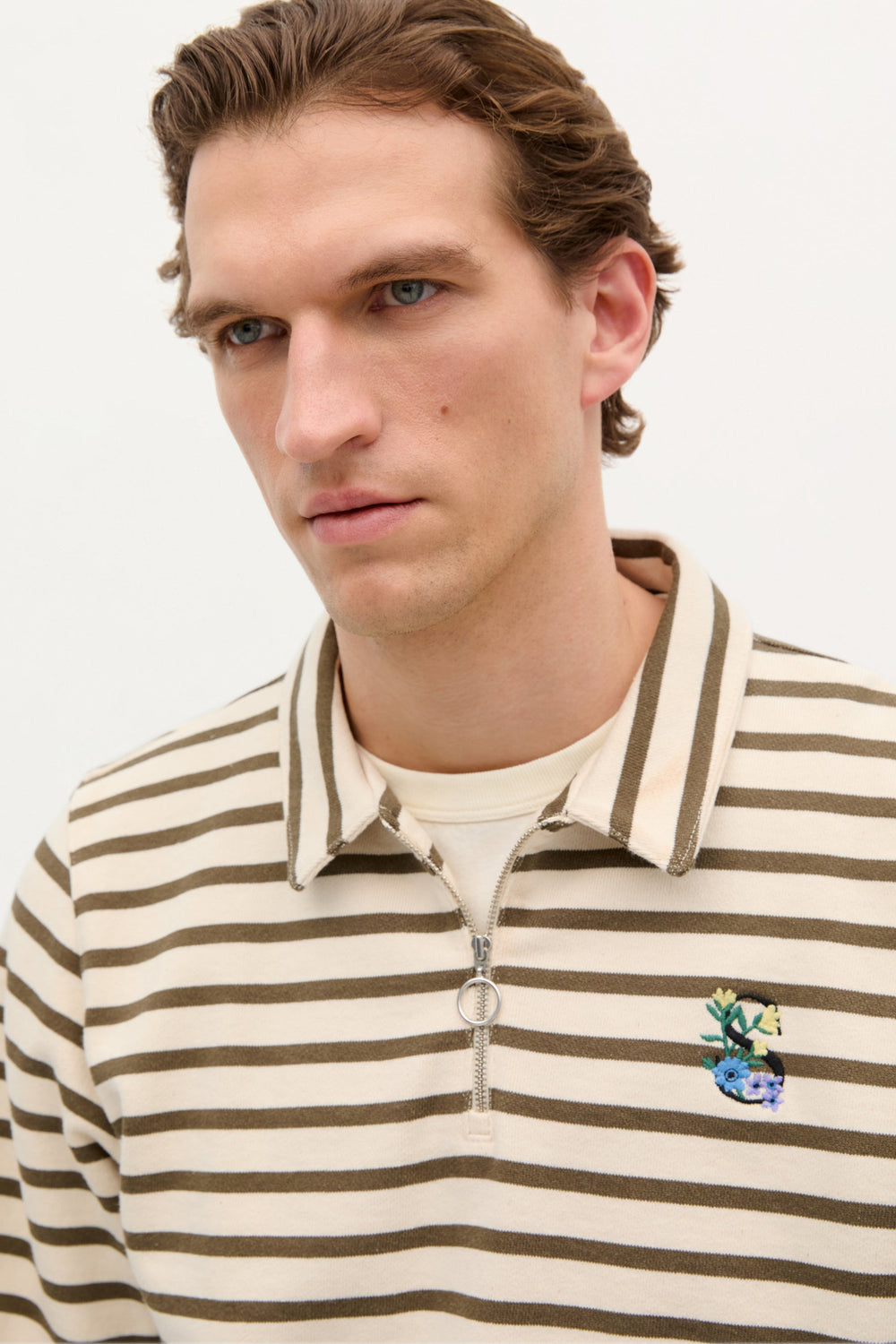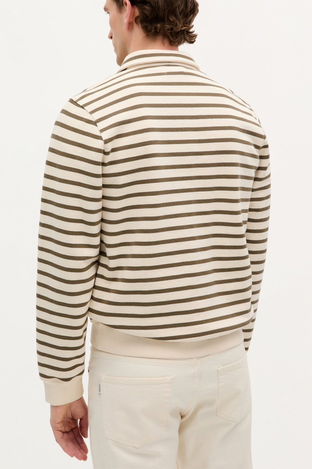 Sudadera de rayas confeccionada en 100% algodón BCI. Cuello polo con media cremallera. Corete Regular Fit, manga larga y bordado logo en pecho. Acabado de puños en rib.