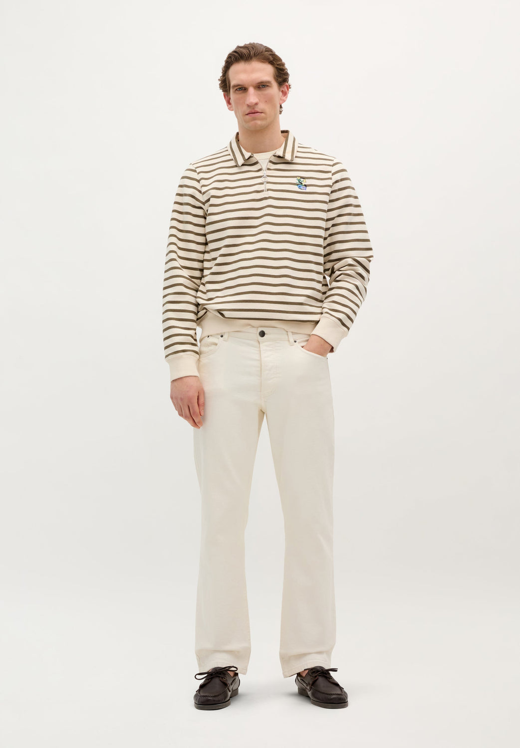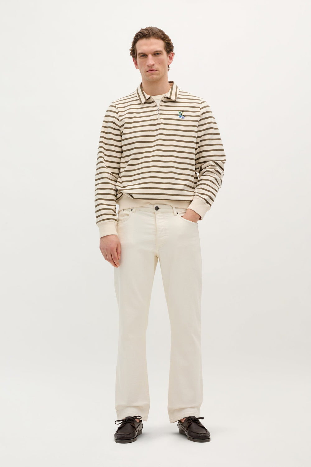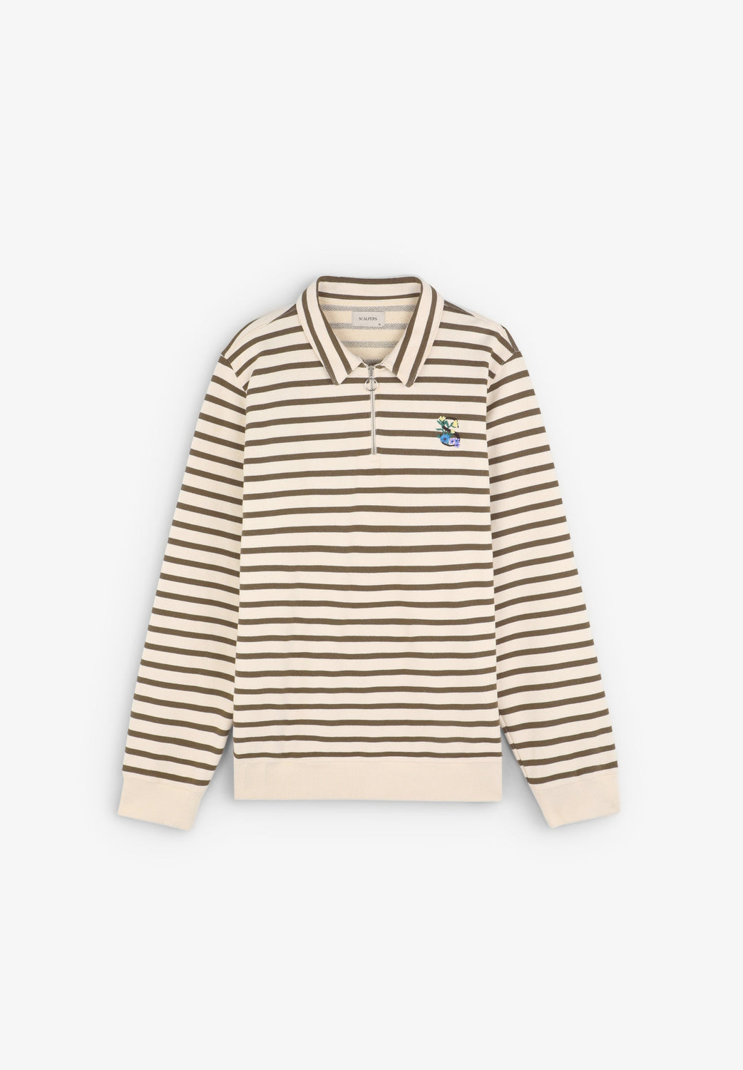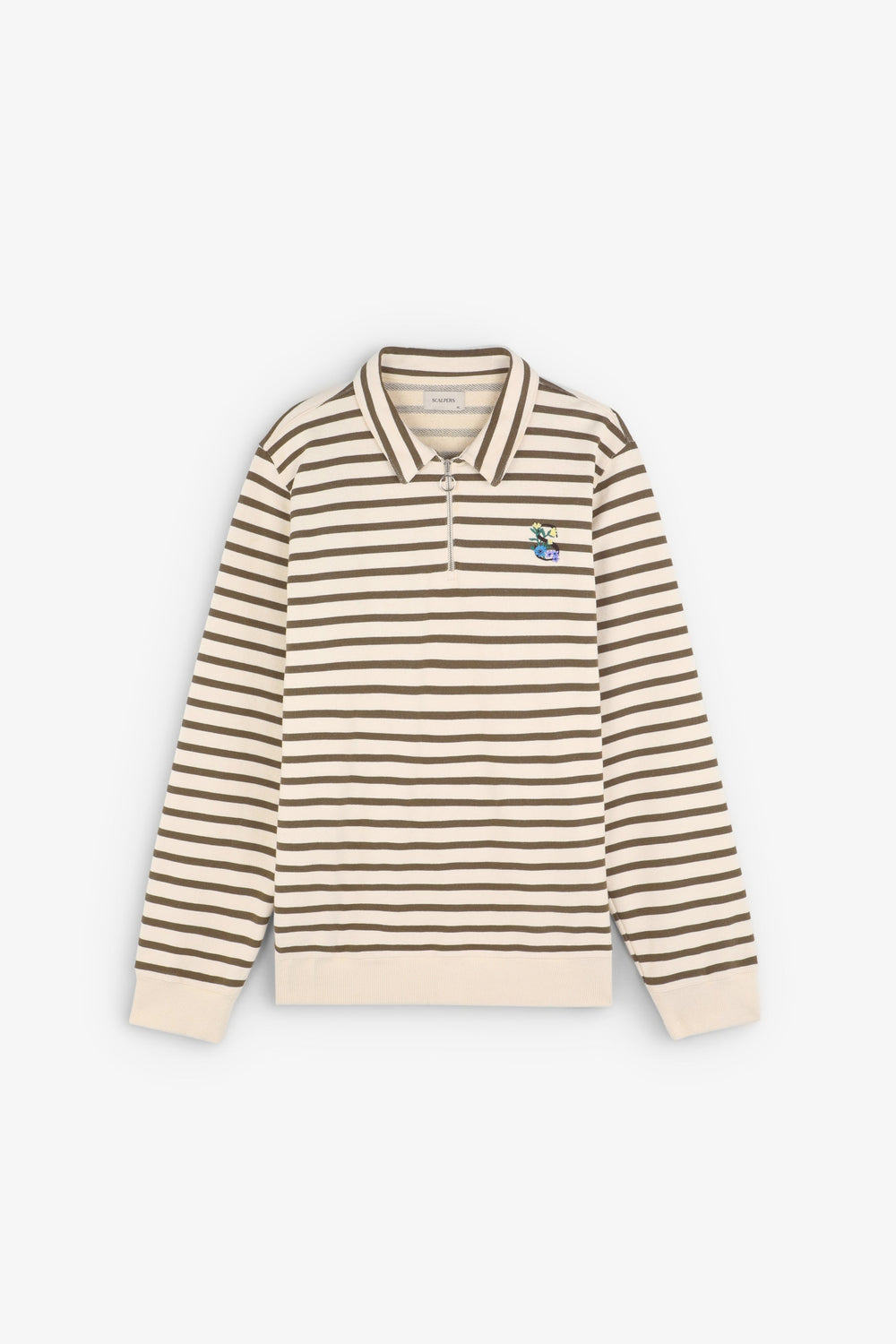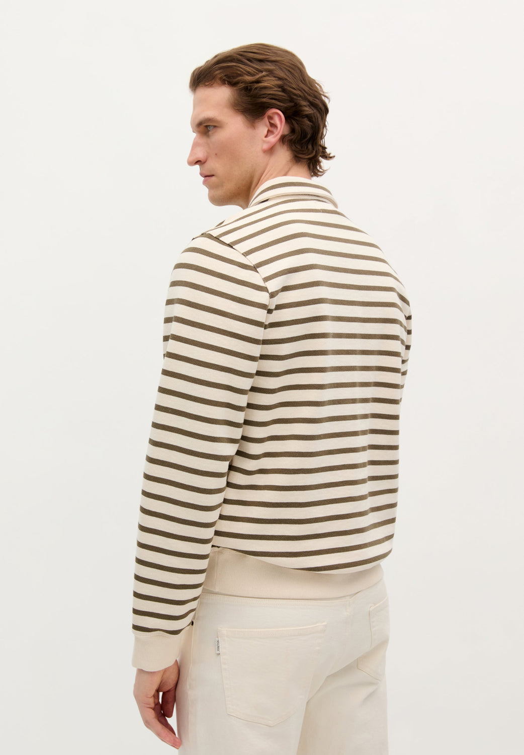 Sudadera de rayas confeccionada en 100% algodón BCI. Cuello polo con media cremallera. Corete Regular Fit, manga larga y bordado logo en pecho. Acabado de puños en rib.