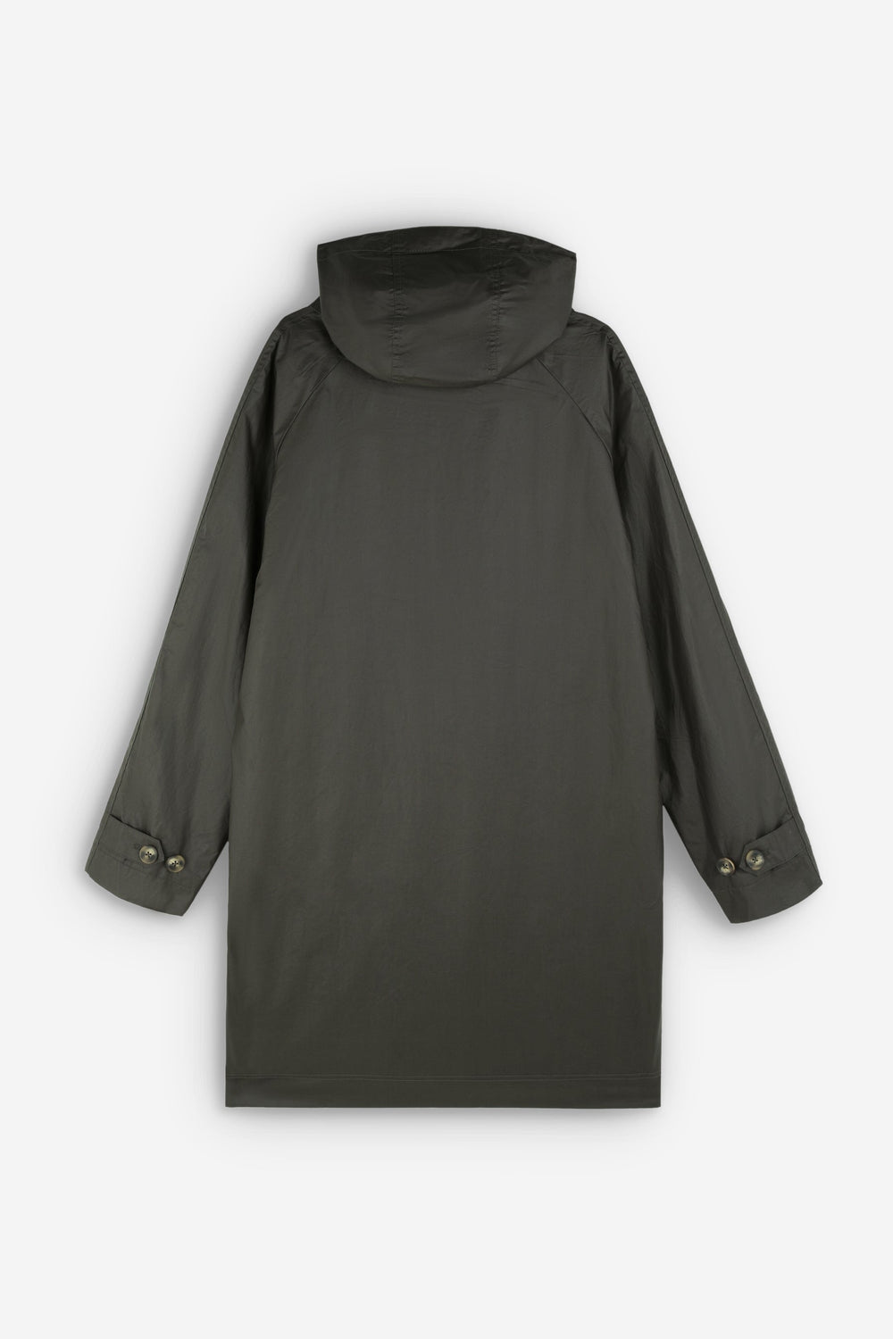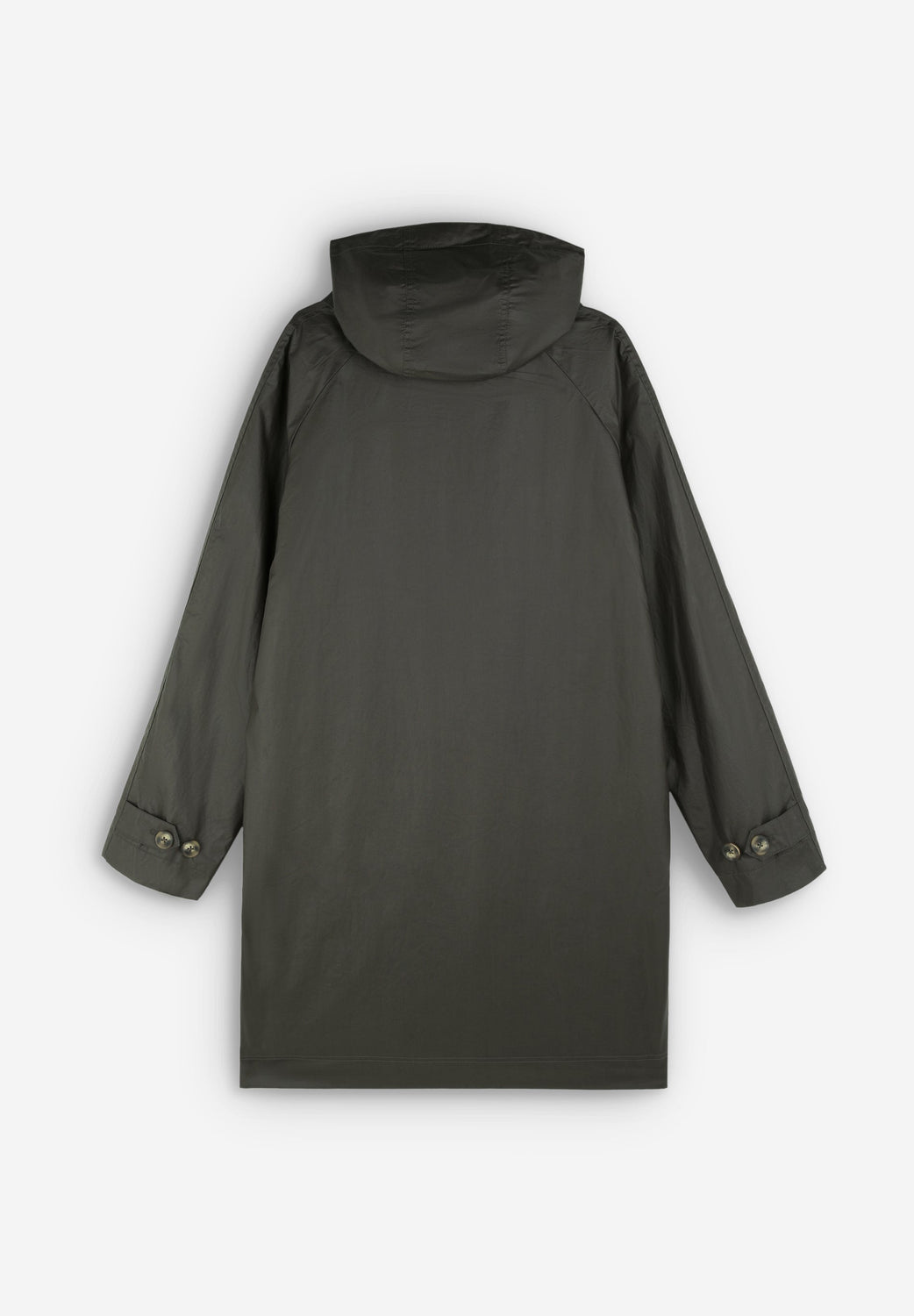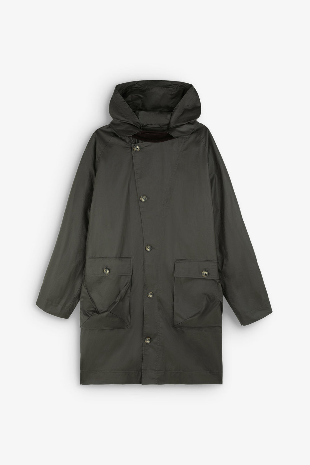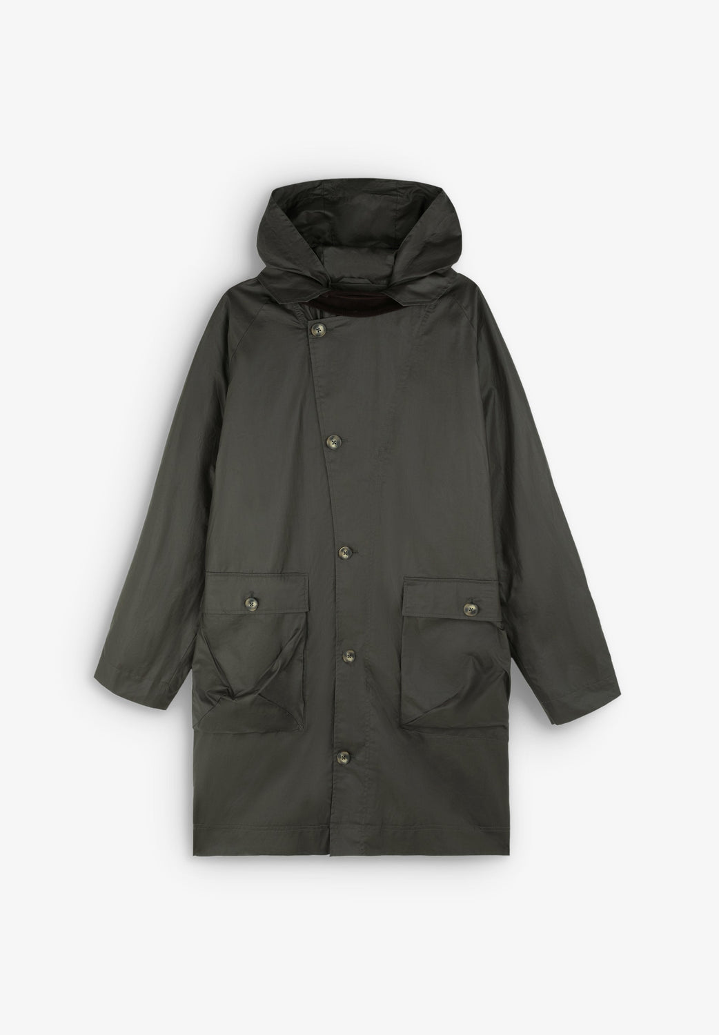 Parka larga premium ligera confeccionada en 100% algodón encerado. Regular fit, cuello con capucha y cierre con botones. Manga larga terminada en puño con botones.