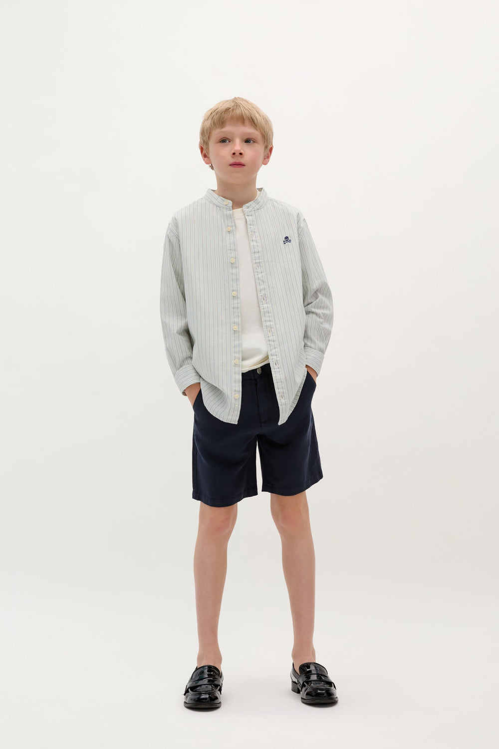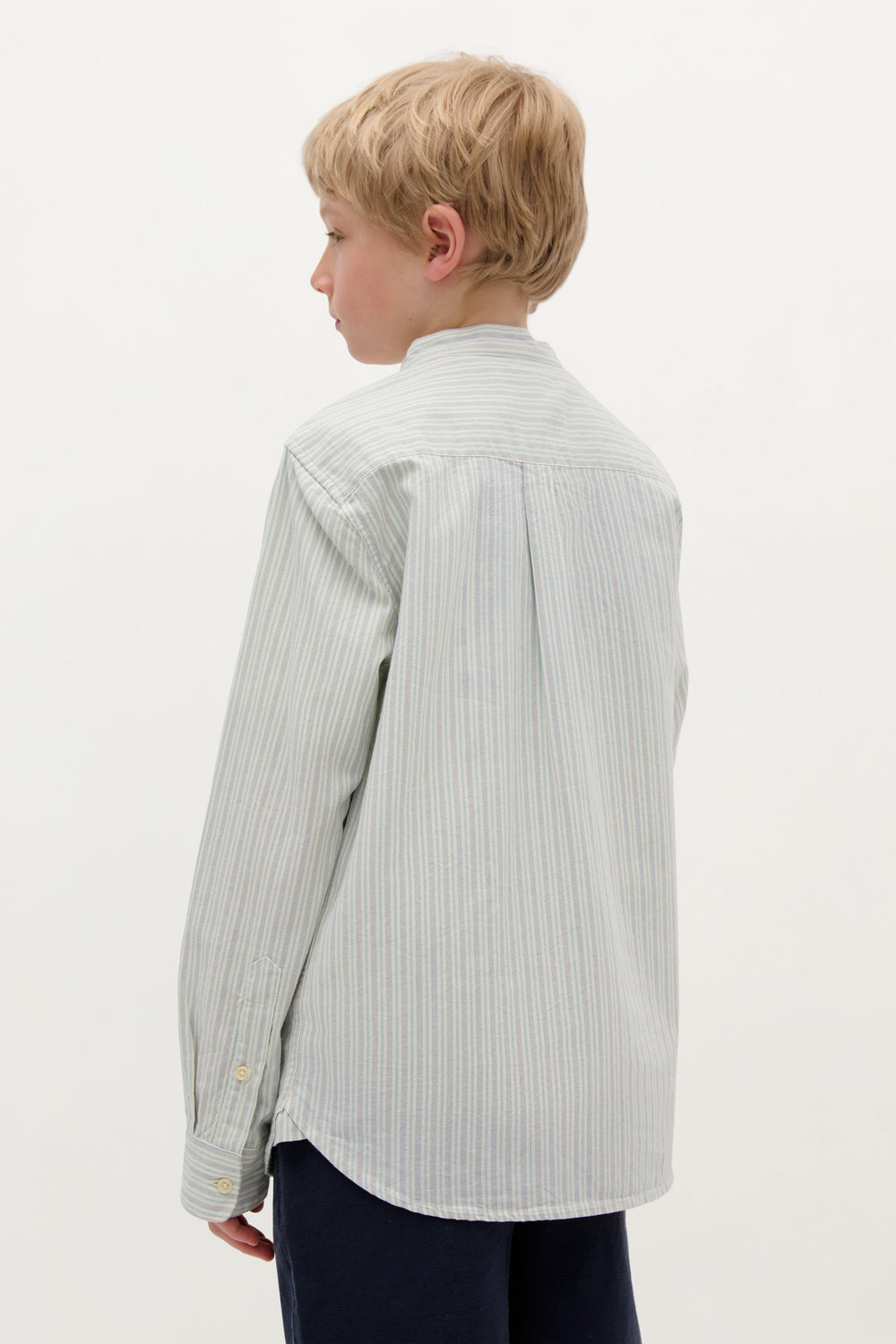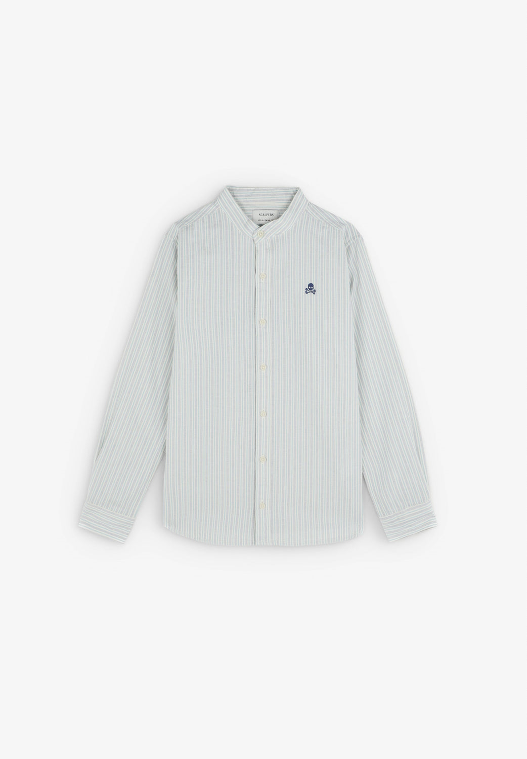 Camisa confeccionada en algodón 100% orgánico de rayas. Corte regular fit, cuello mao y manga larga con terminación en puño con botones. Cierre con botones. Logo bordado a contraste en pecho.