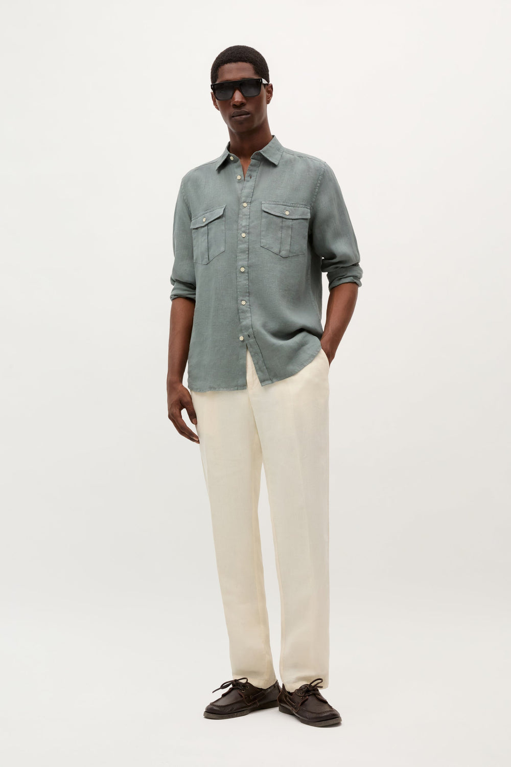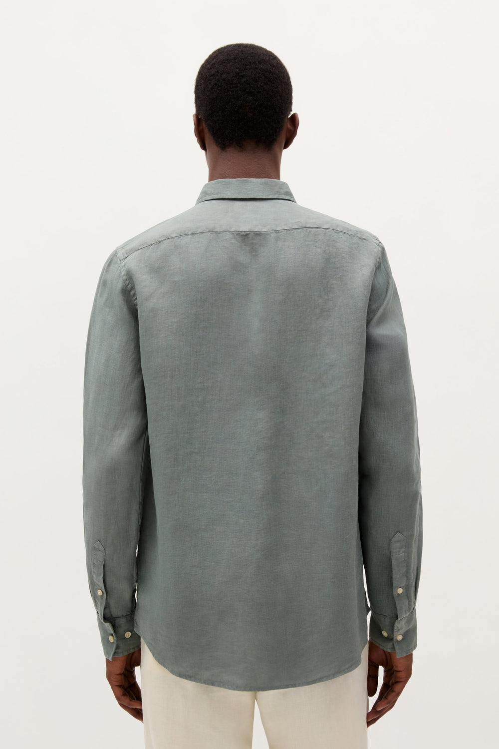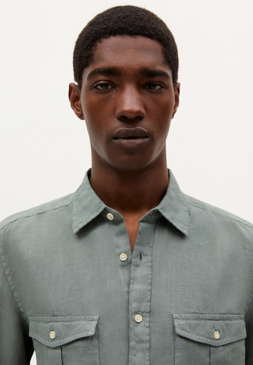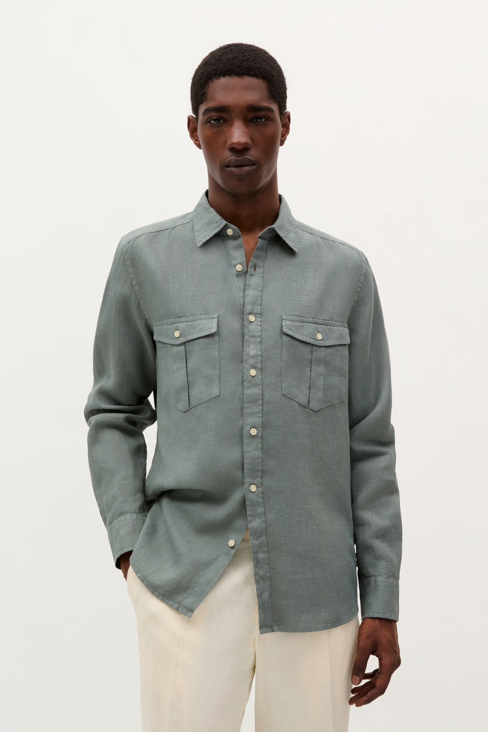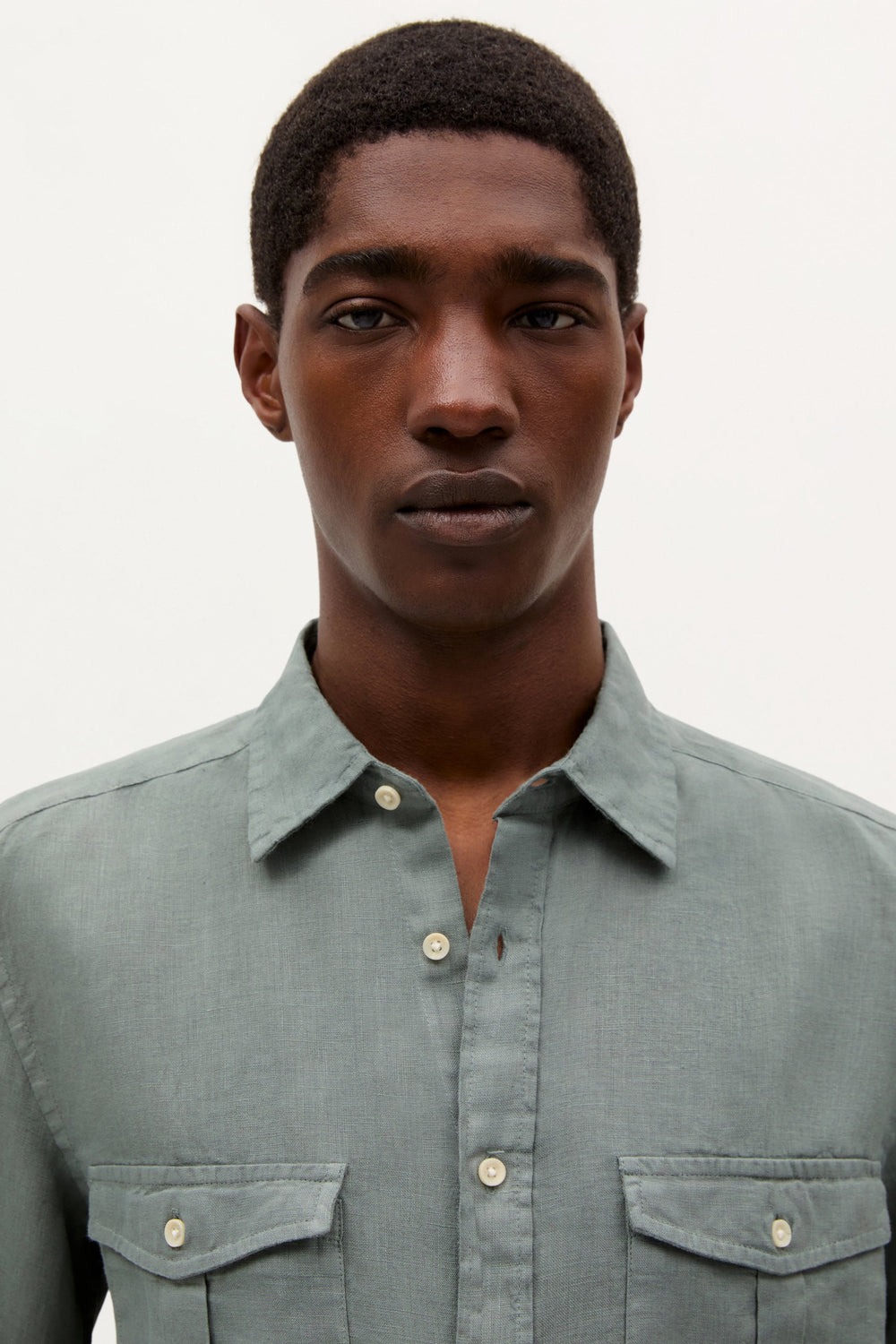 Camisa confeccionada en 100% Lino. Cuello solapa y manga larga acabada en puño con abotonadura. Bolsillos abotonados en pecho. Cierre frontal abotonado.