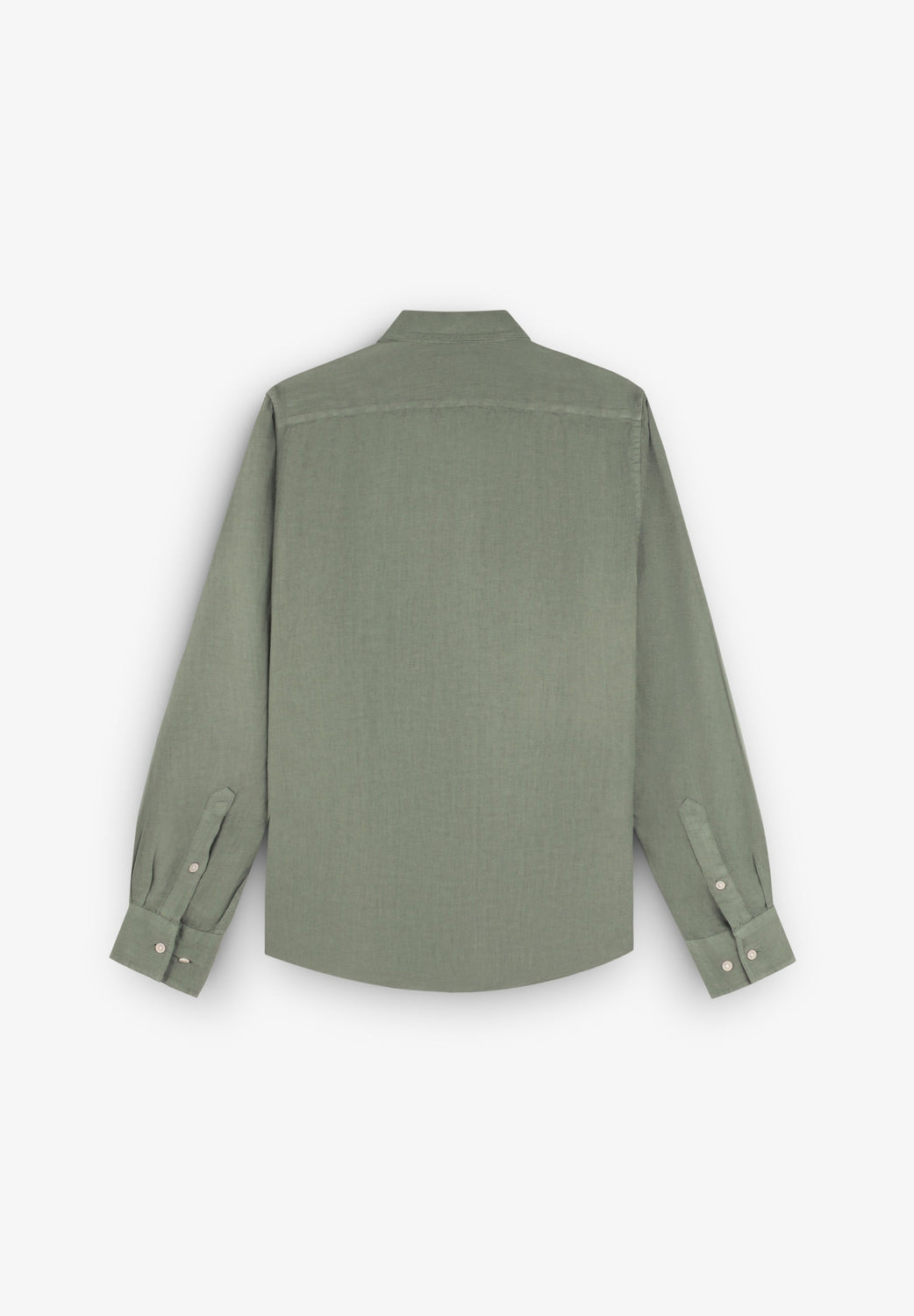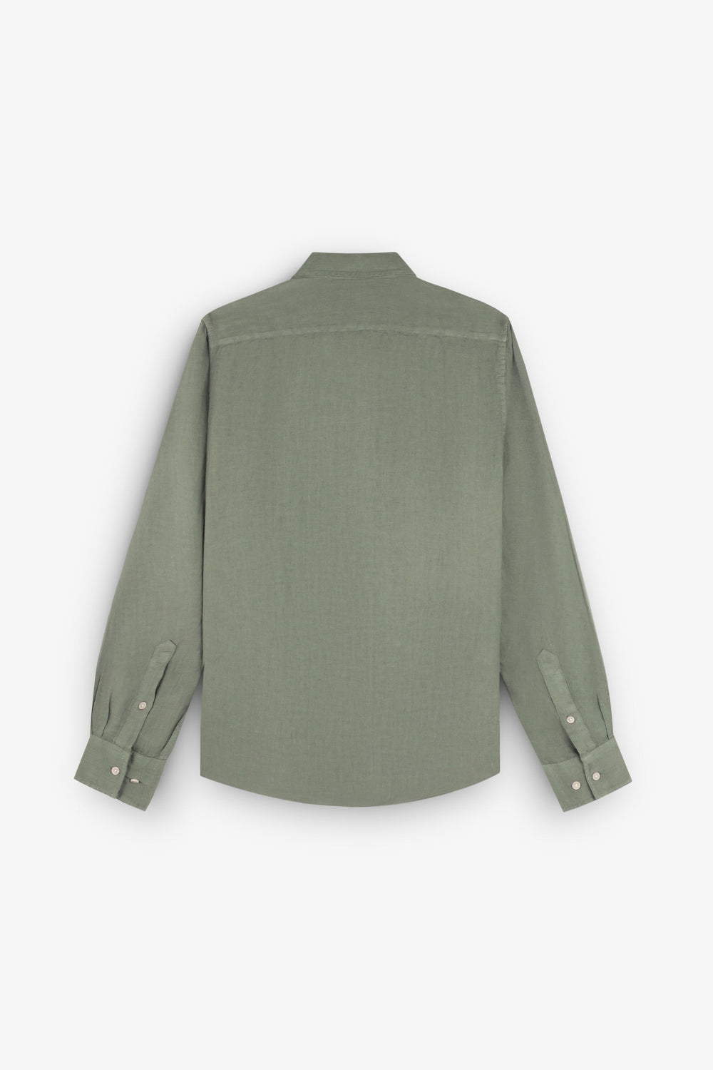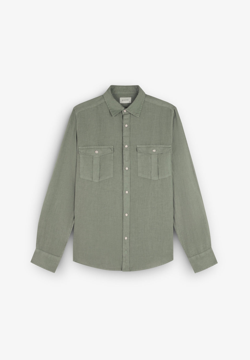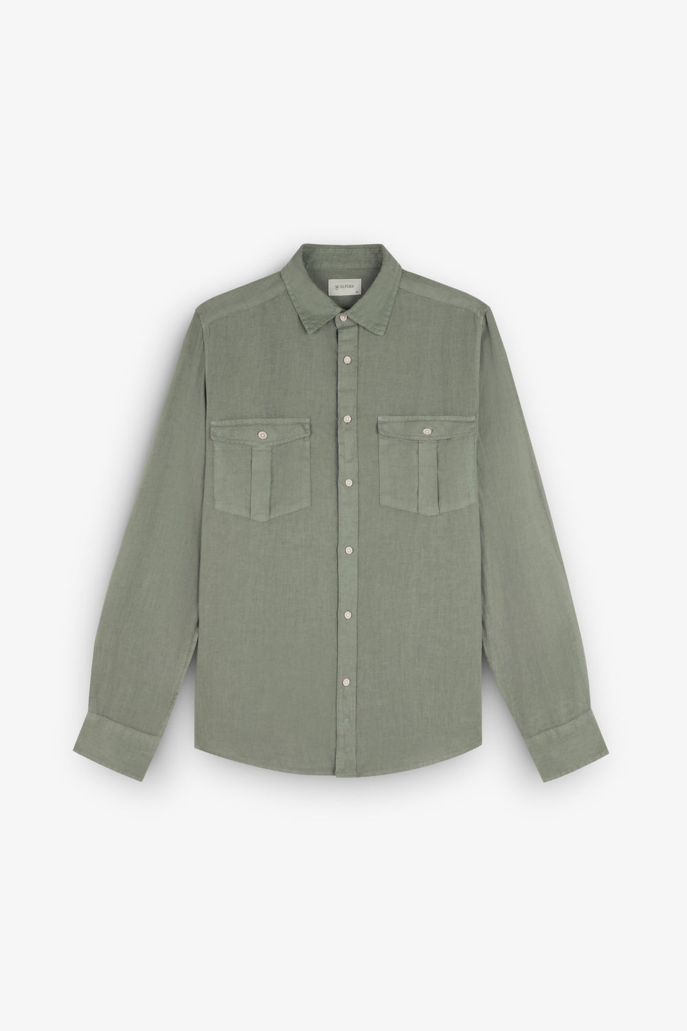 Camisa confeccionada en 100% Lino. Cuello solapa y manga larga acabada en puño con abotonadura. Bolsillos abotonados en pecho. Cierre frontal abotonado.
