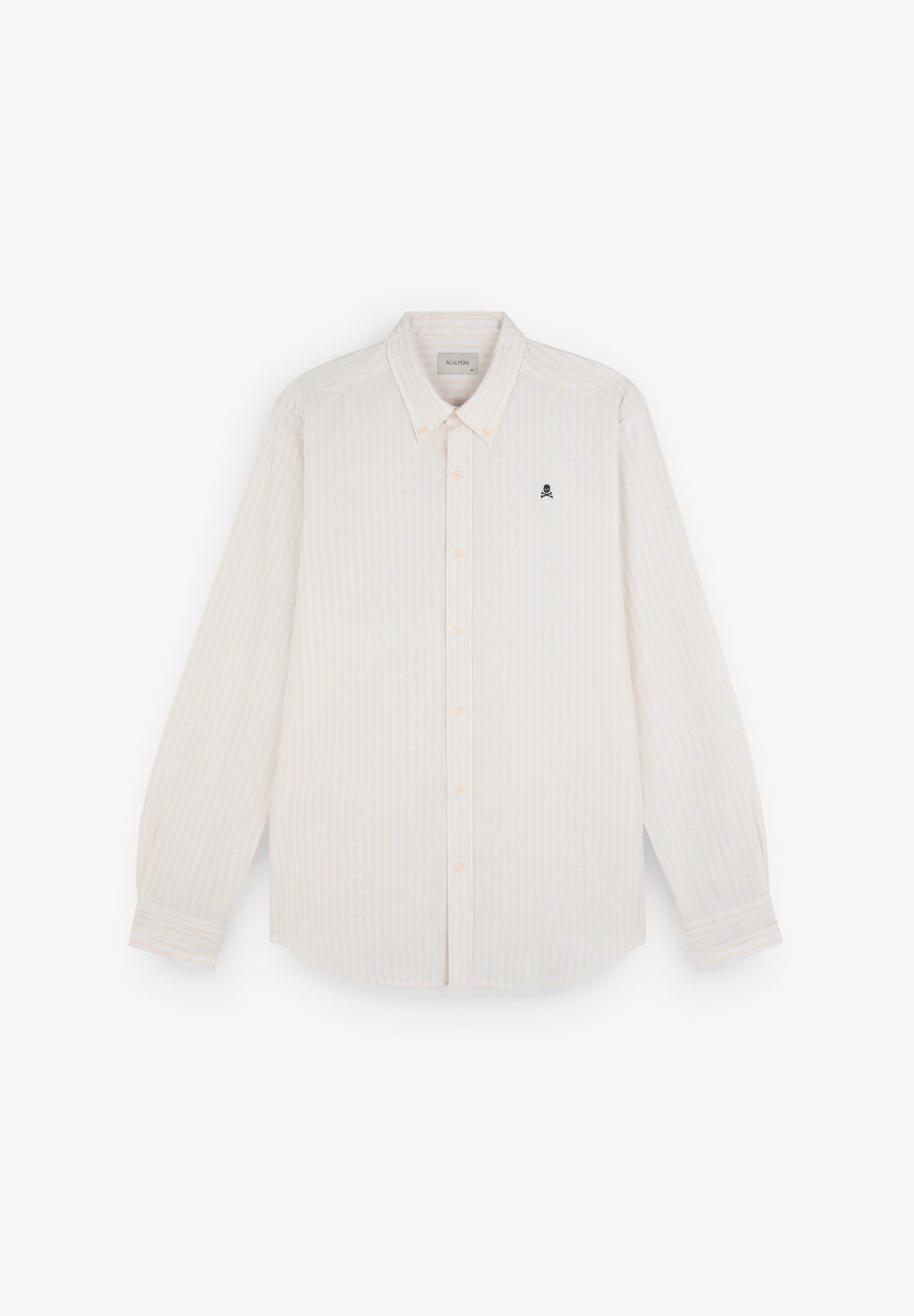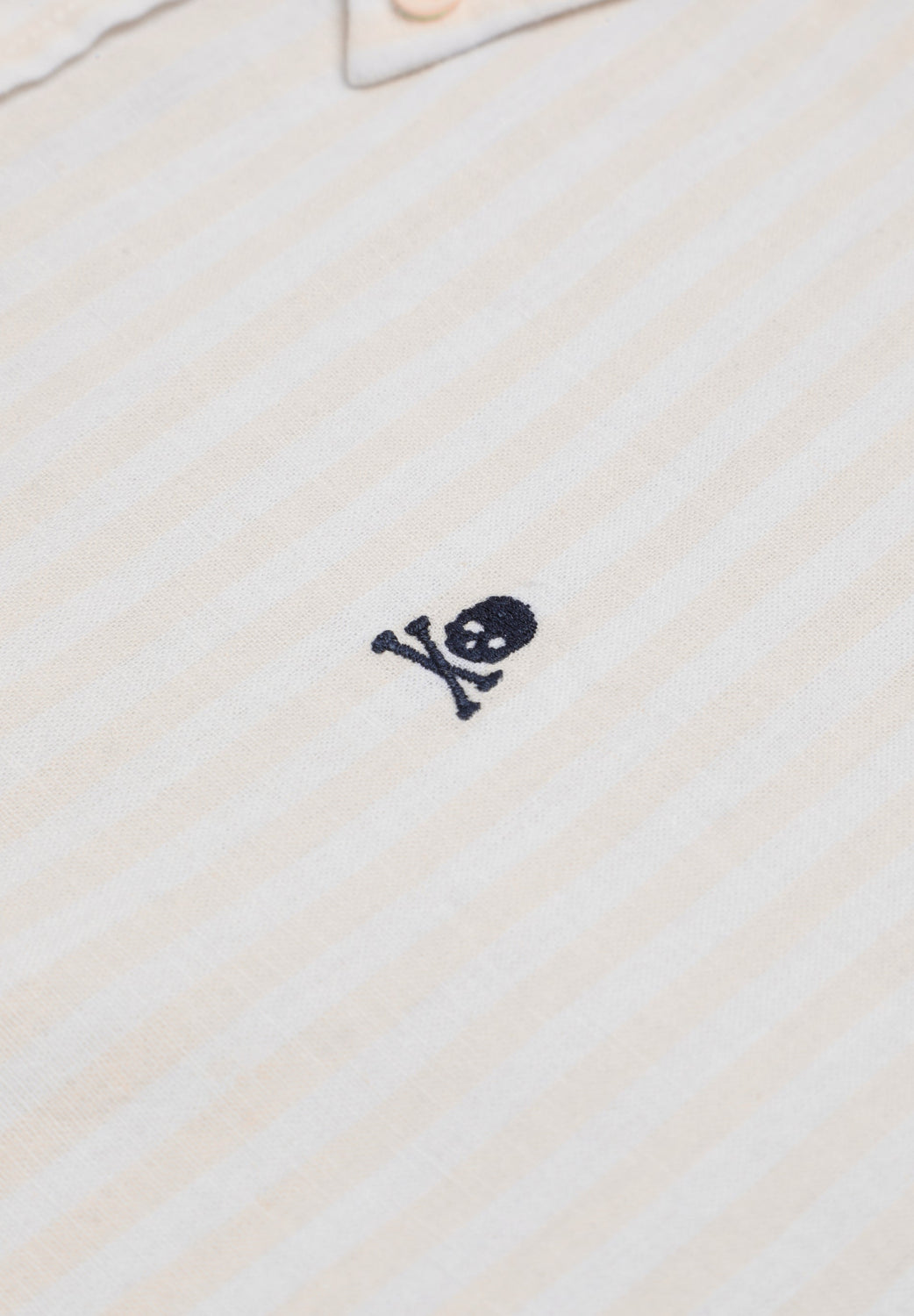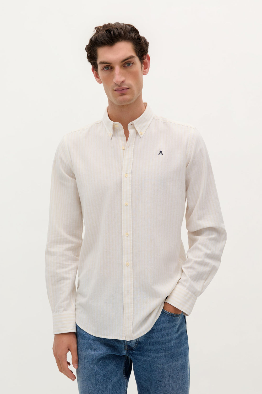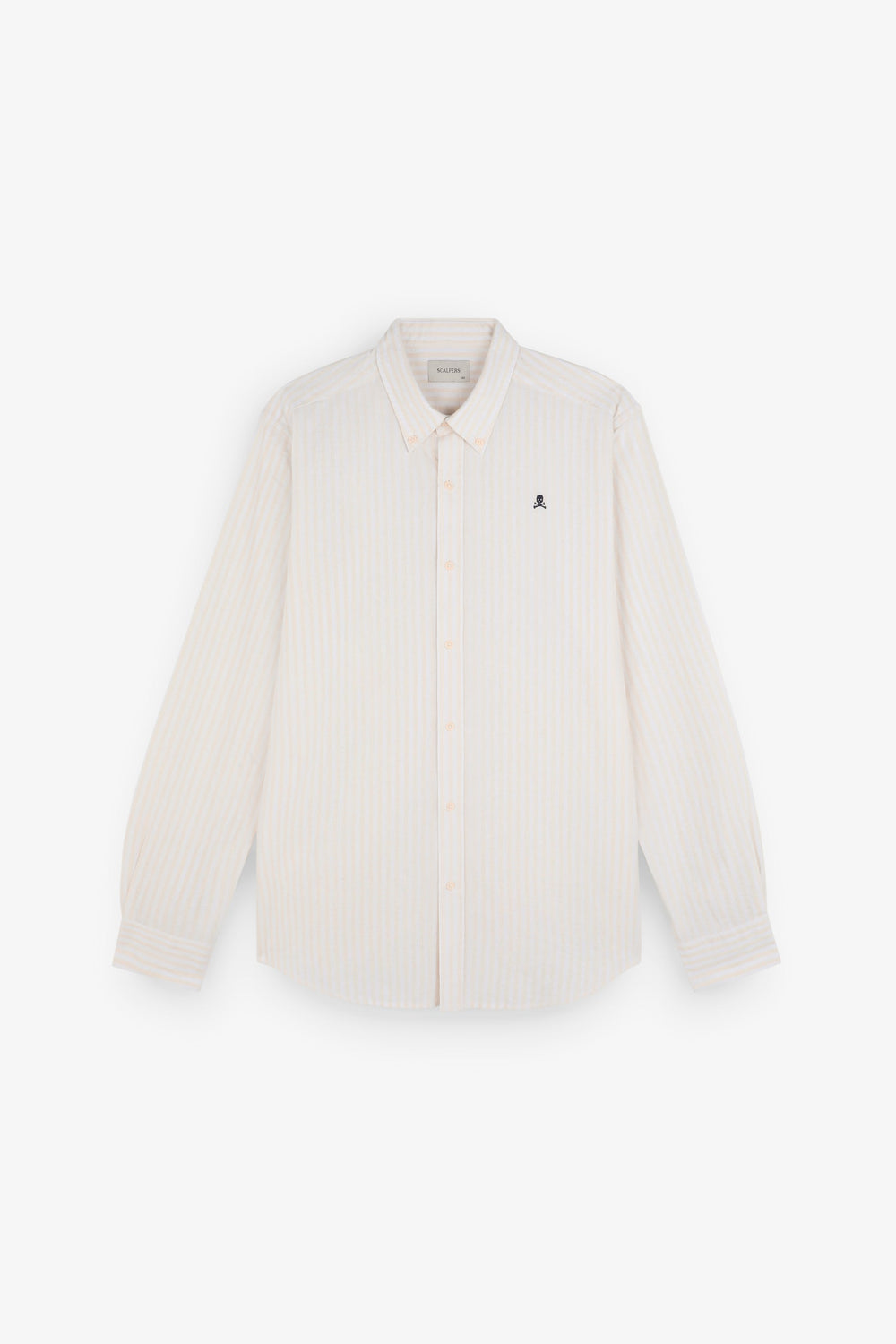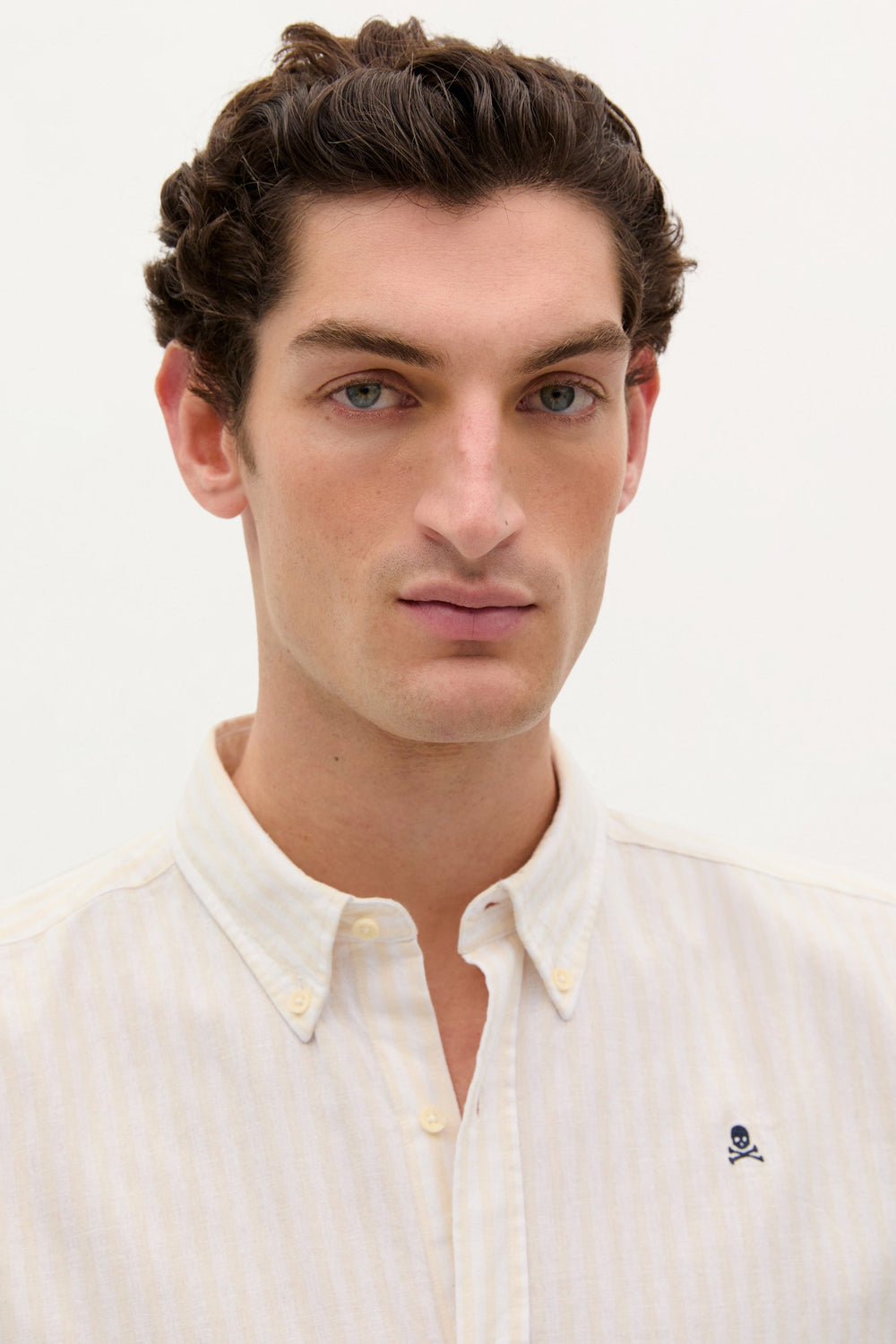 Camisa de rayas con calavera bordada a contraste en pecho. Confeccionada en mezcla de algodón y lino. Corte Regular fit. Cuello con botones. Cierre frontal con botones. Manga larga terminada en puño con botones.