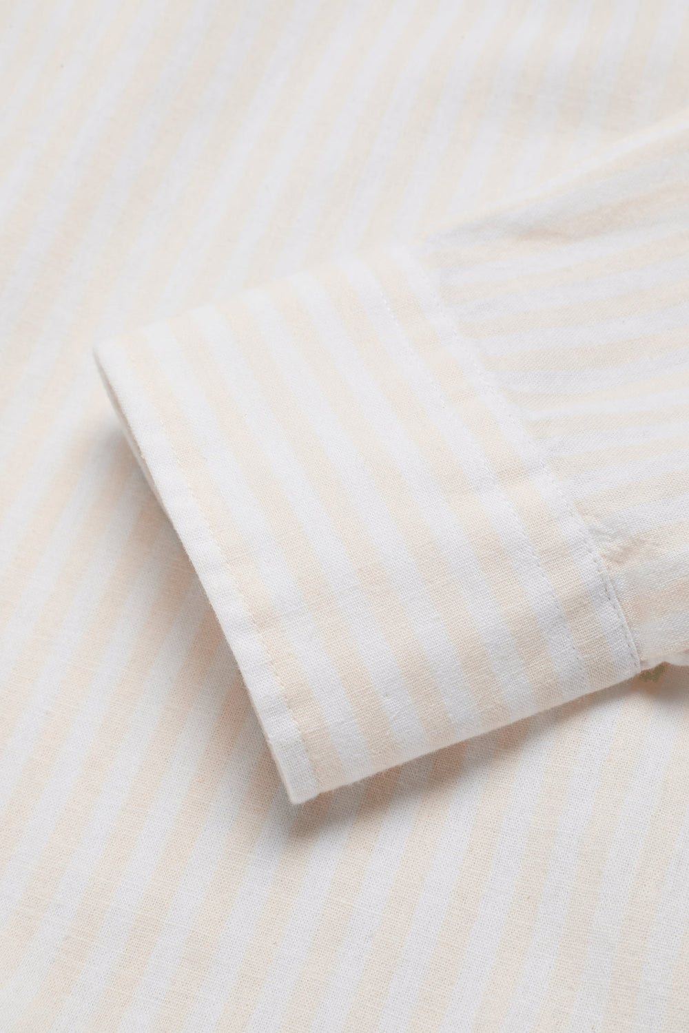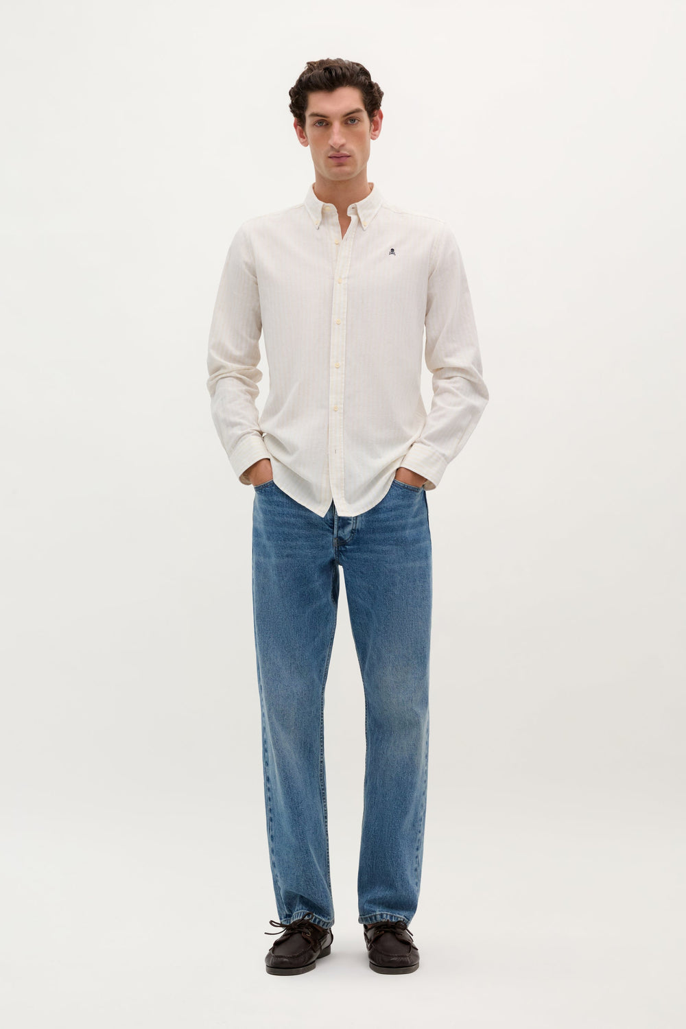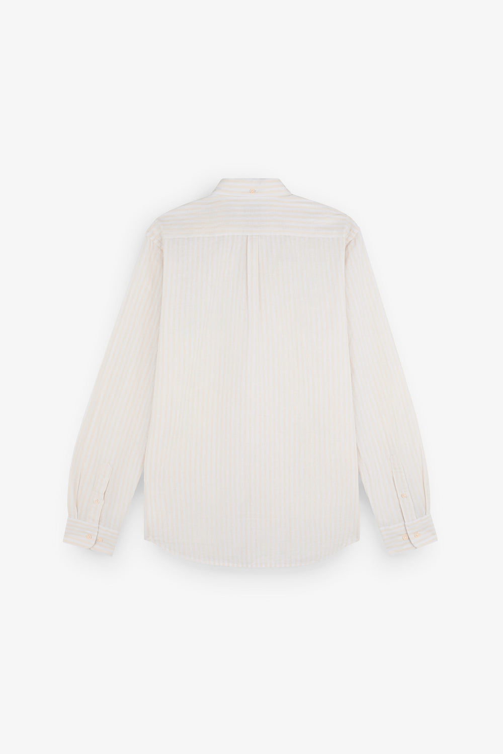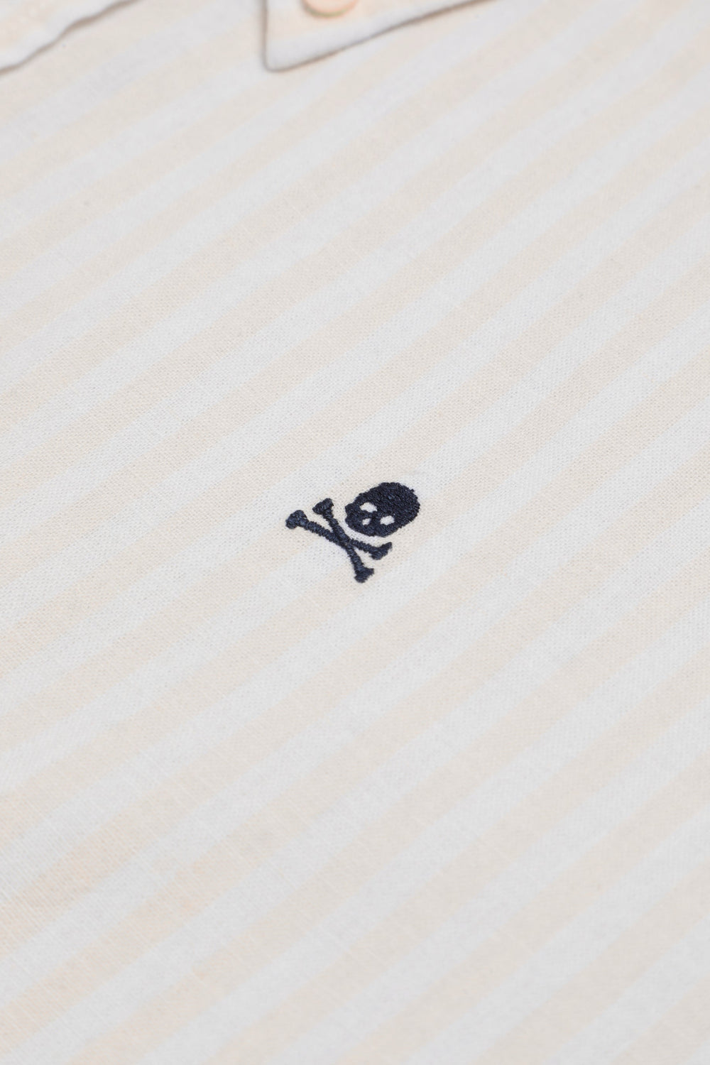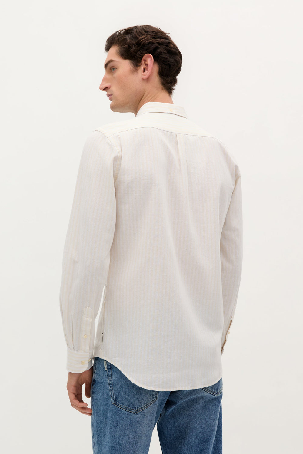 Camisa de rayas con calavera bordada a contraste en pecho. Confeccionada en mezcla de algodón y lino. Corte Regular fit. Cuello con botones. Cierre frontal con botones. Manga larga terminada en puño con botones.