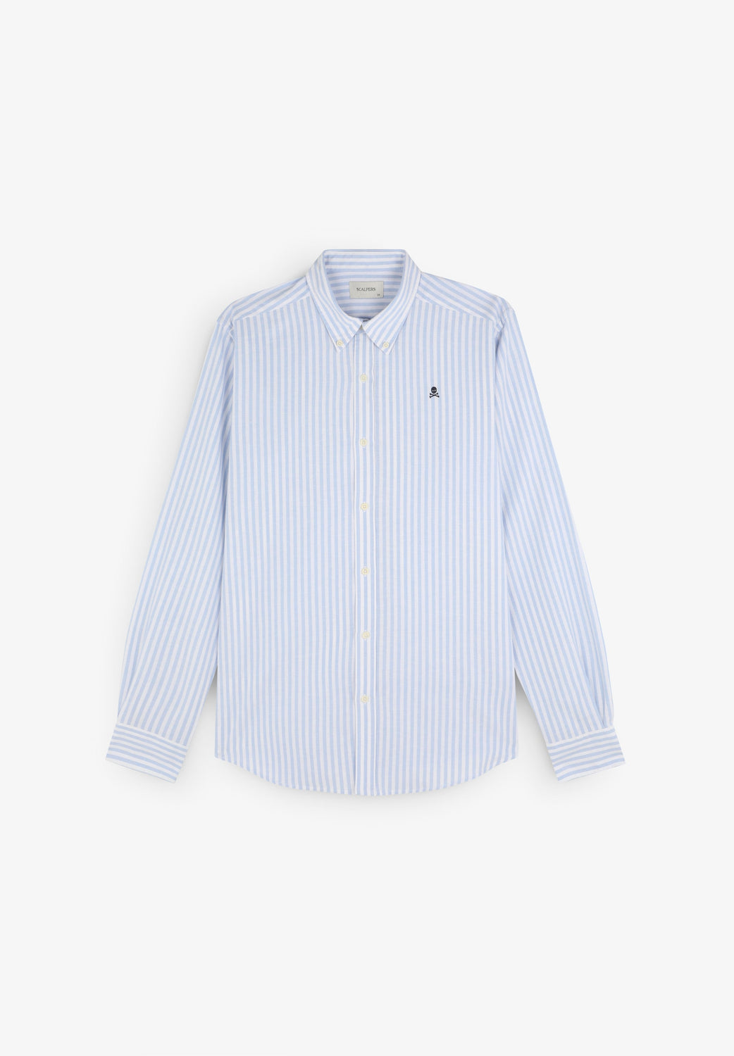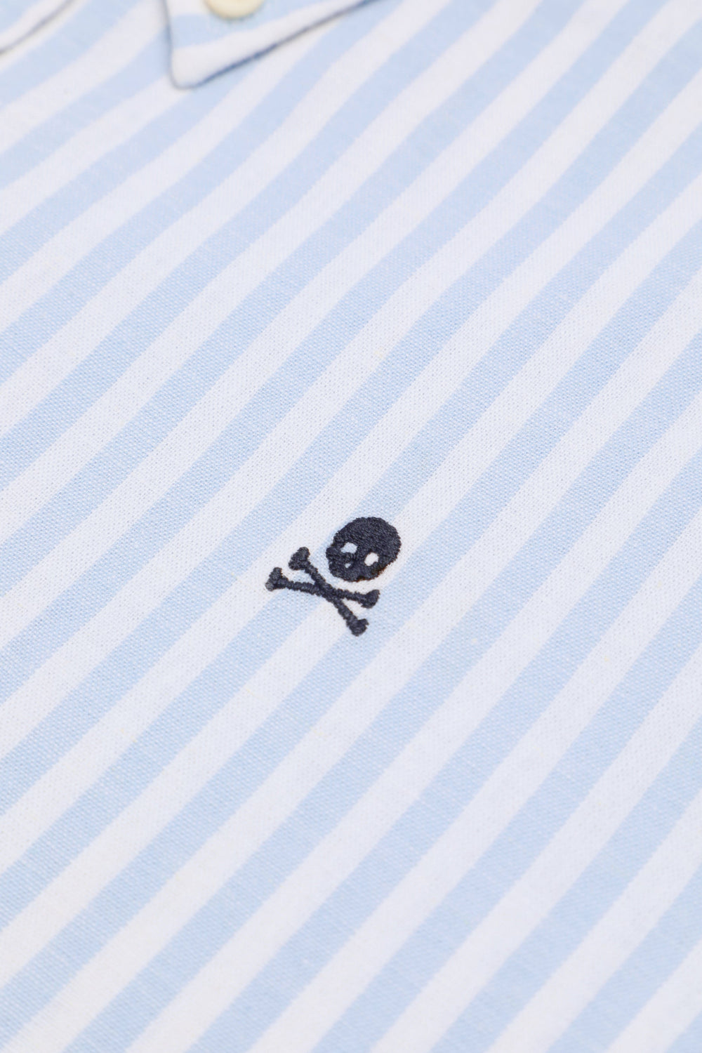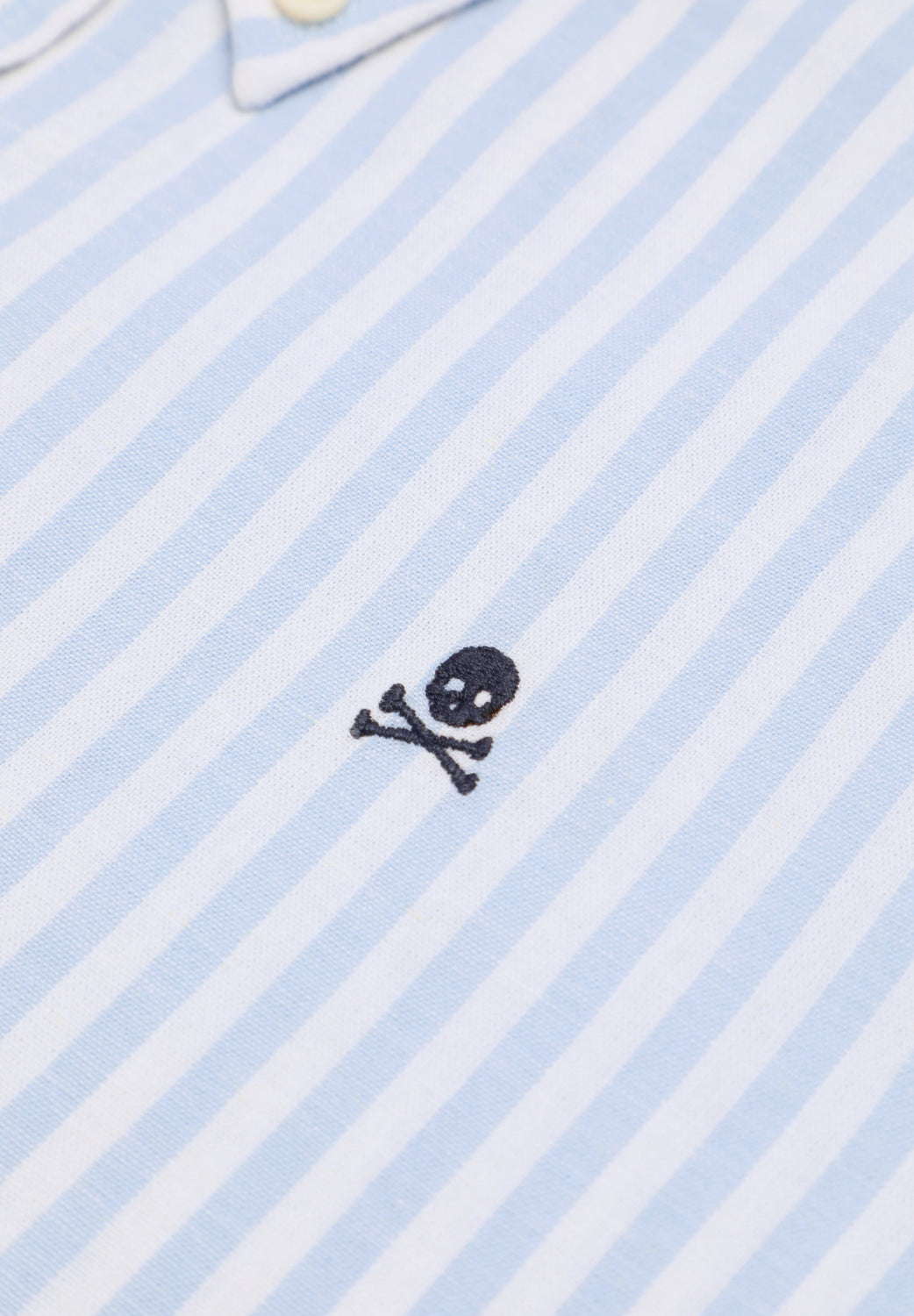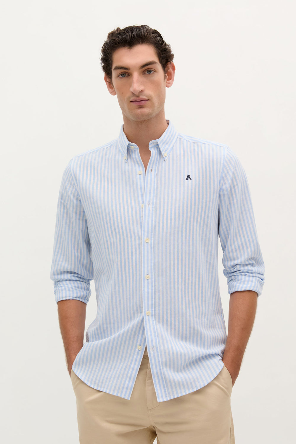 Camisa de rayas con calavera bordada a contraste en pecho. Confeccionada en mezcla de algodón y lino. Corte Regular fit. Cuello con botones. Cierre frontal con botones. Manga larga terminada en puño con botones.