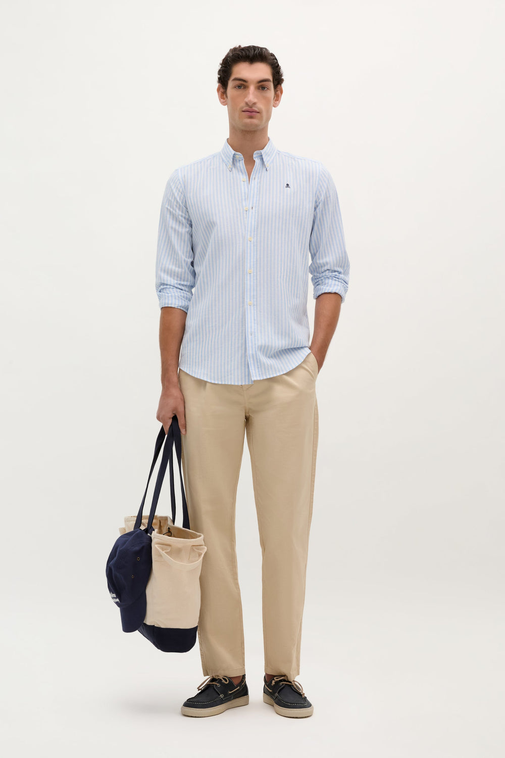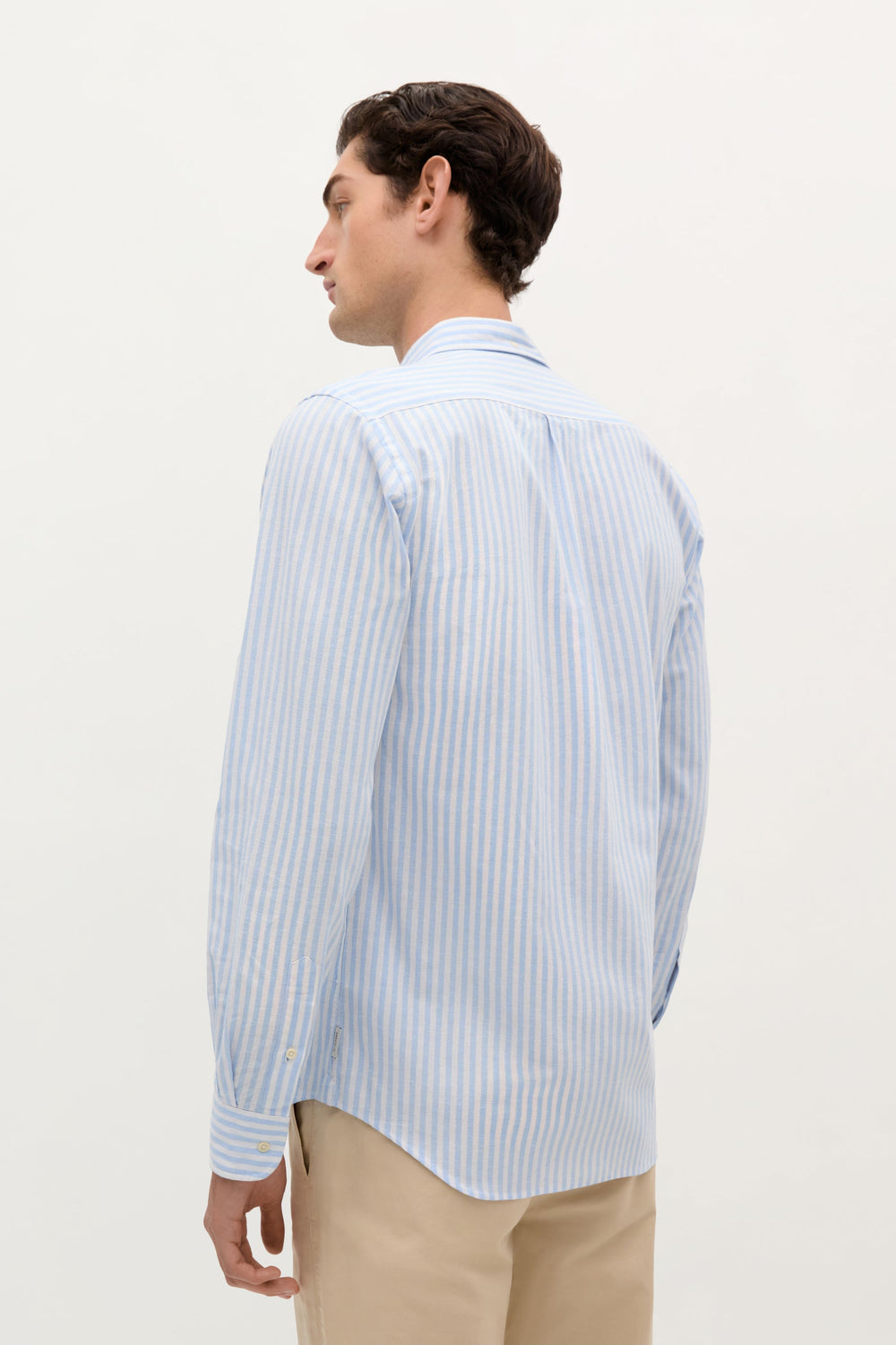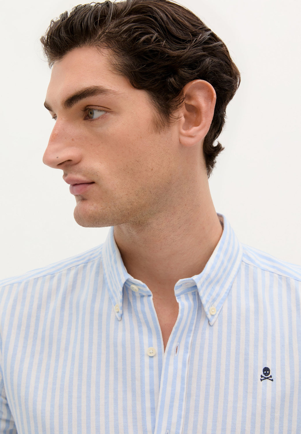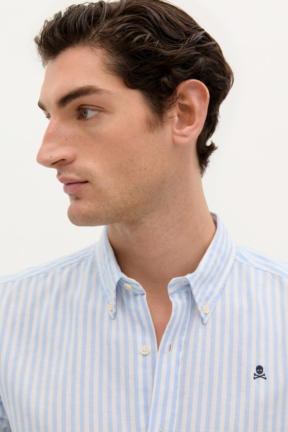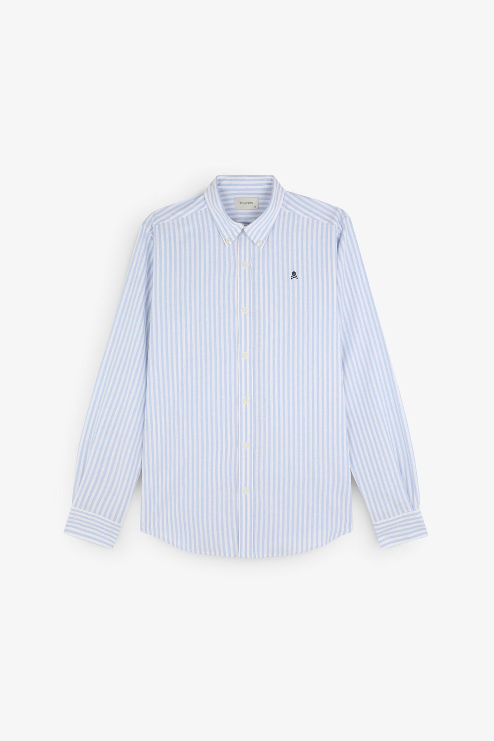 Camisa de rayas con calavera bordada a contraste en pecho. Confeccionada en mezcla de algodón y lino. Corte Regular fit. Cuello con botones. Cierre frontal con botones. Manga larga terminada en puño con botones.