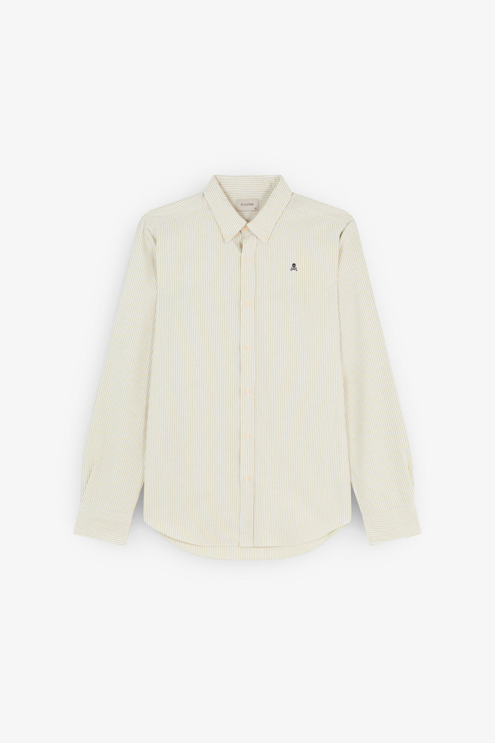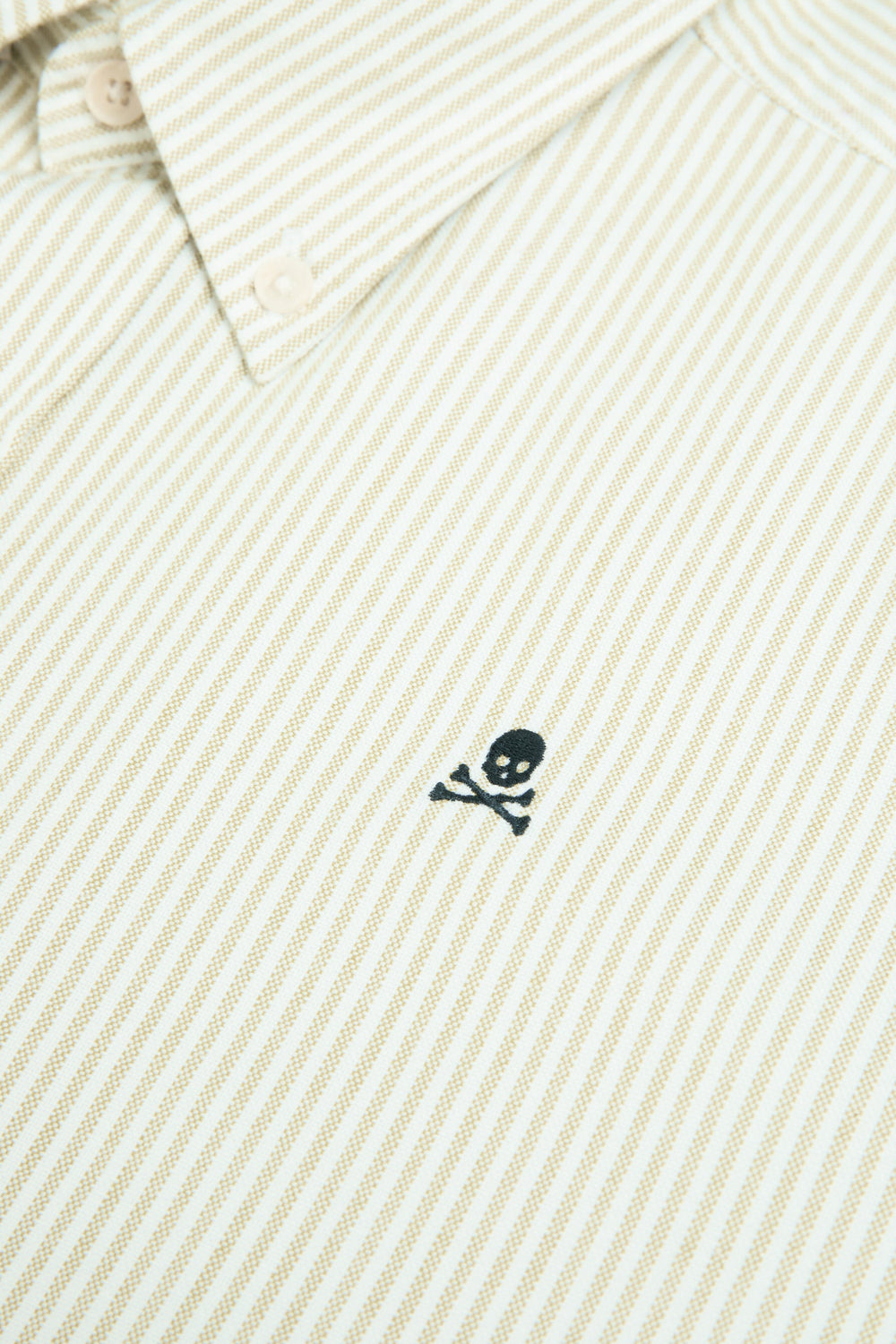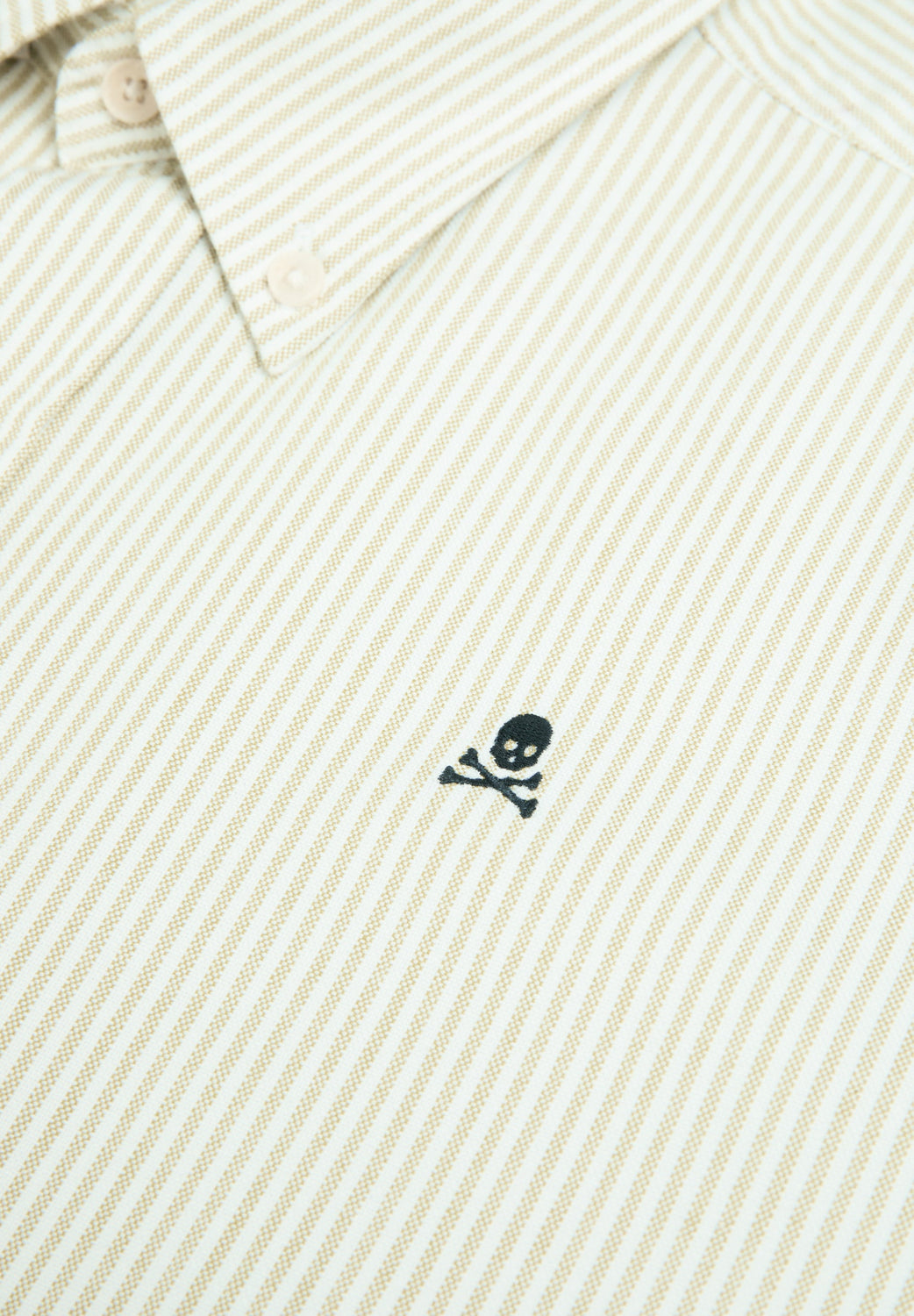 Camisa confeccionada en 100% algodón BCI. Regular fit, cuello con botones y cierre con botones. Manga larga terminada en puño con botones y calavera bordada a contraste.