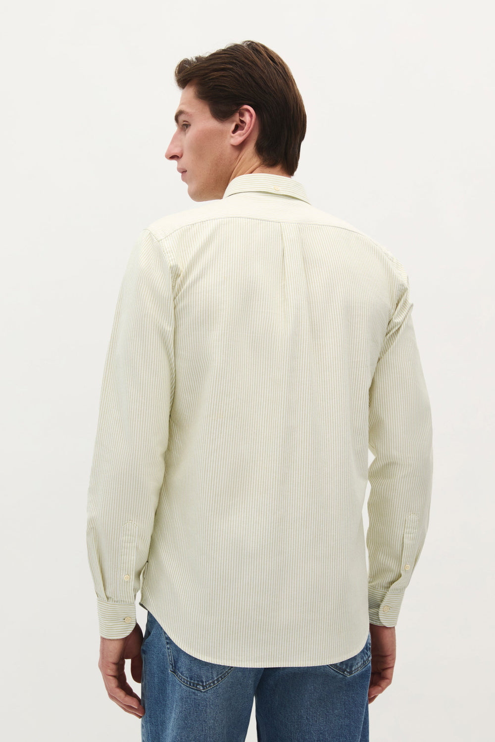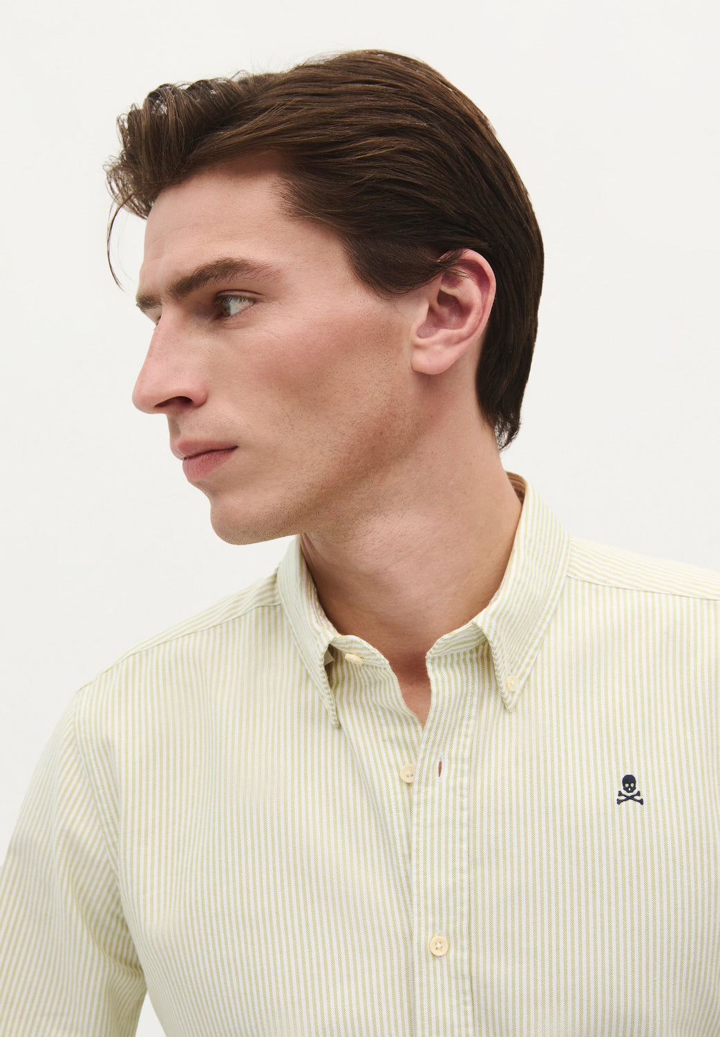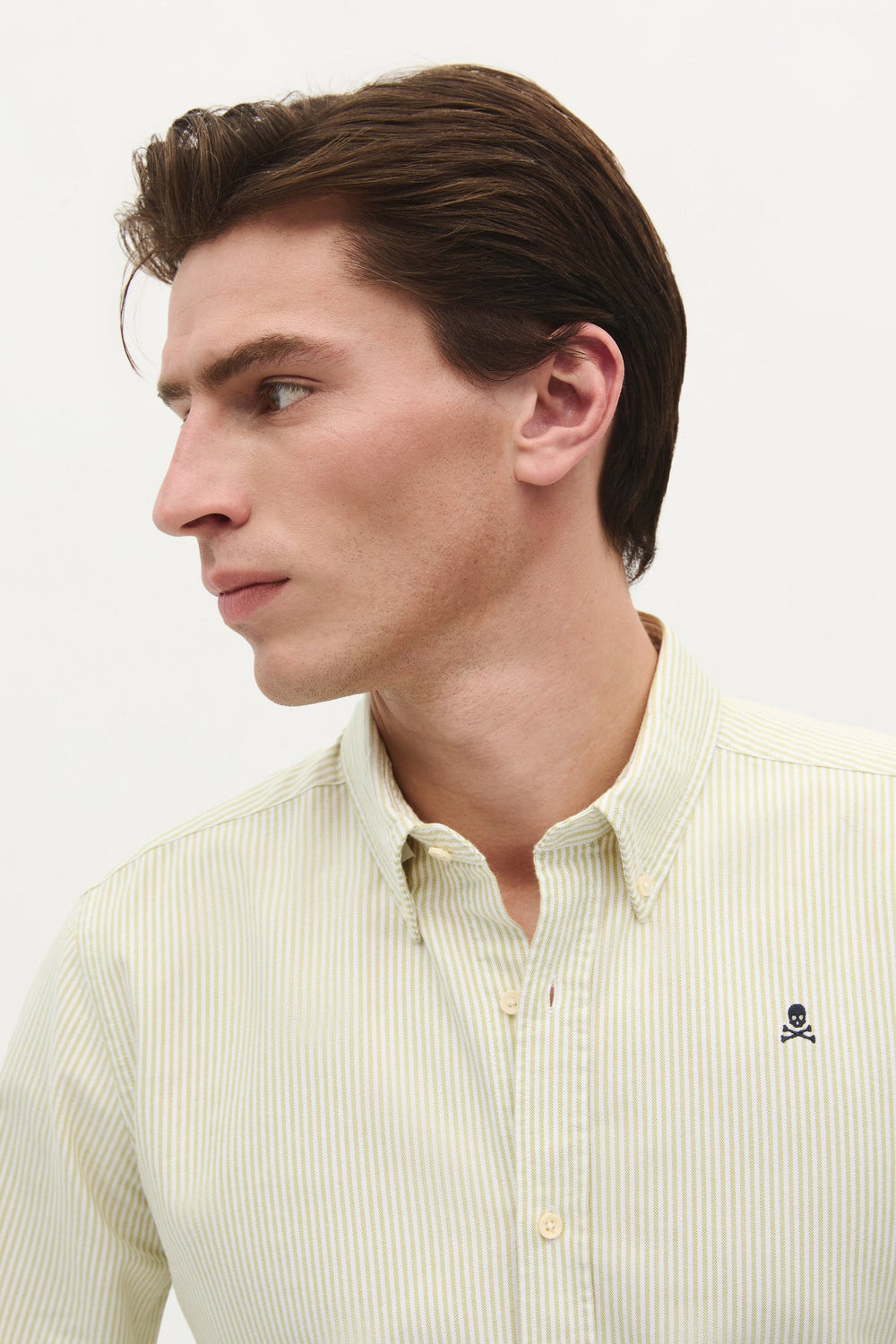 Camisa confeccionada en 100% algodón BCI. Regular fit, cuello con botones y cierre con botones. Manga larga terminada en puño con botones y calavera bordada a contraste.