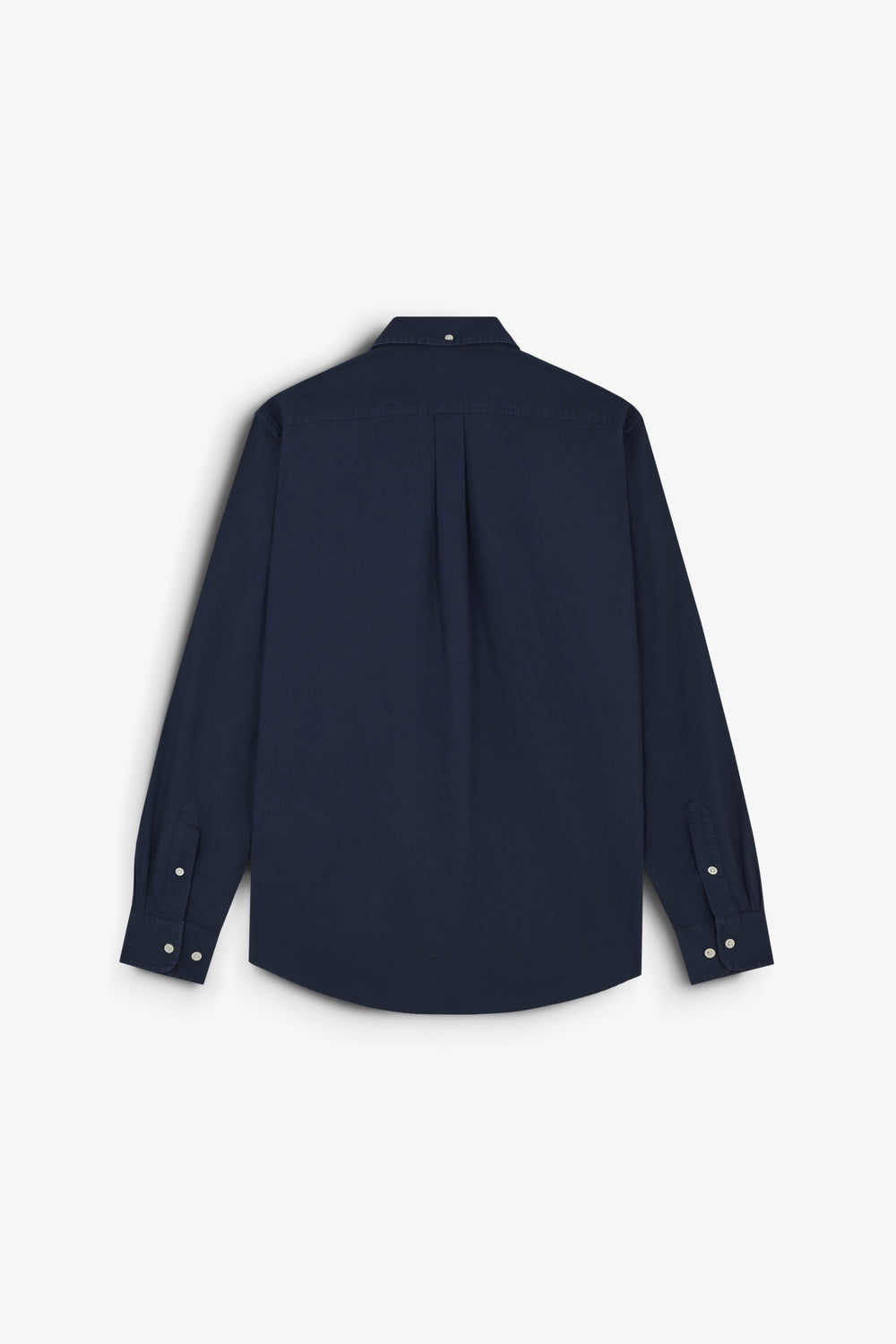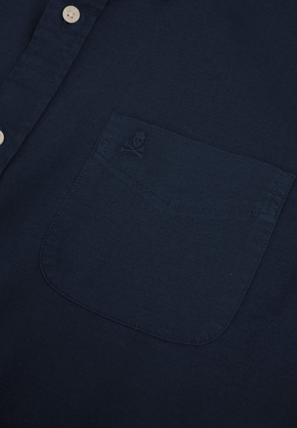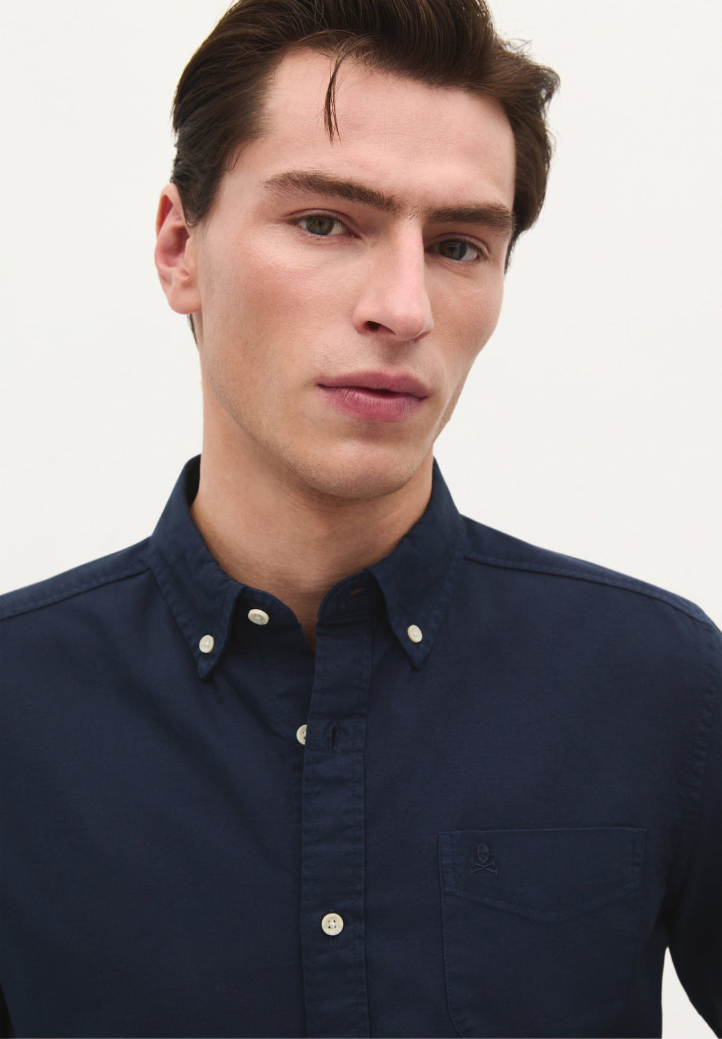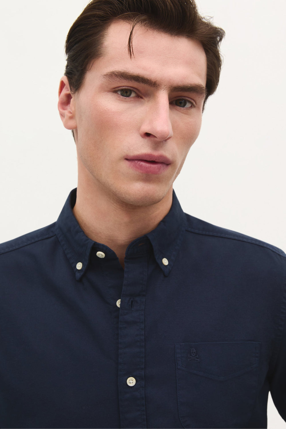 Camisa confeccionada en 100% algodón BCI. Regular fit, cuello con botones y cierre con botones. Manga larga terminada en puño con botones y calavera bordada a contraste.