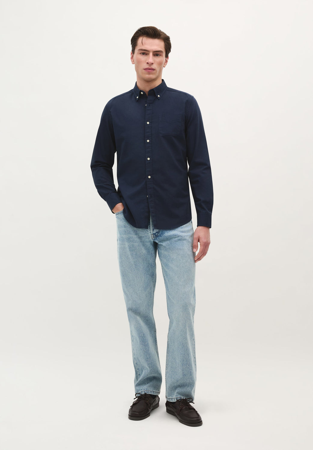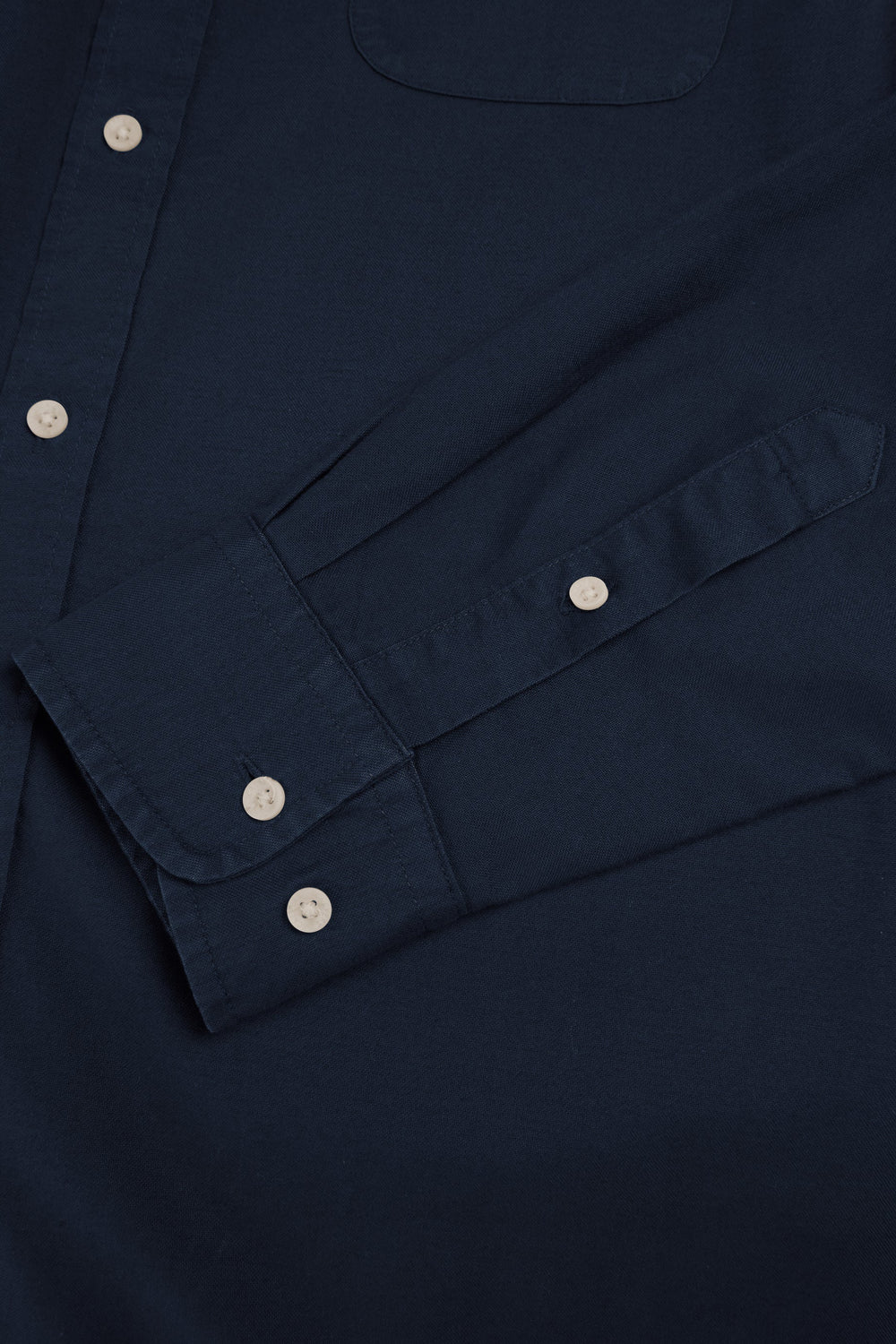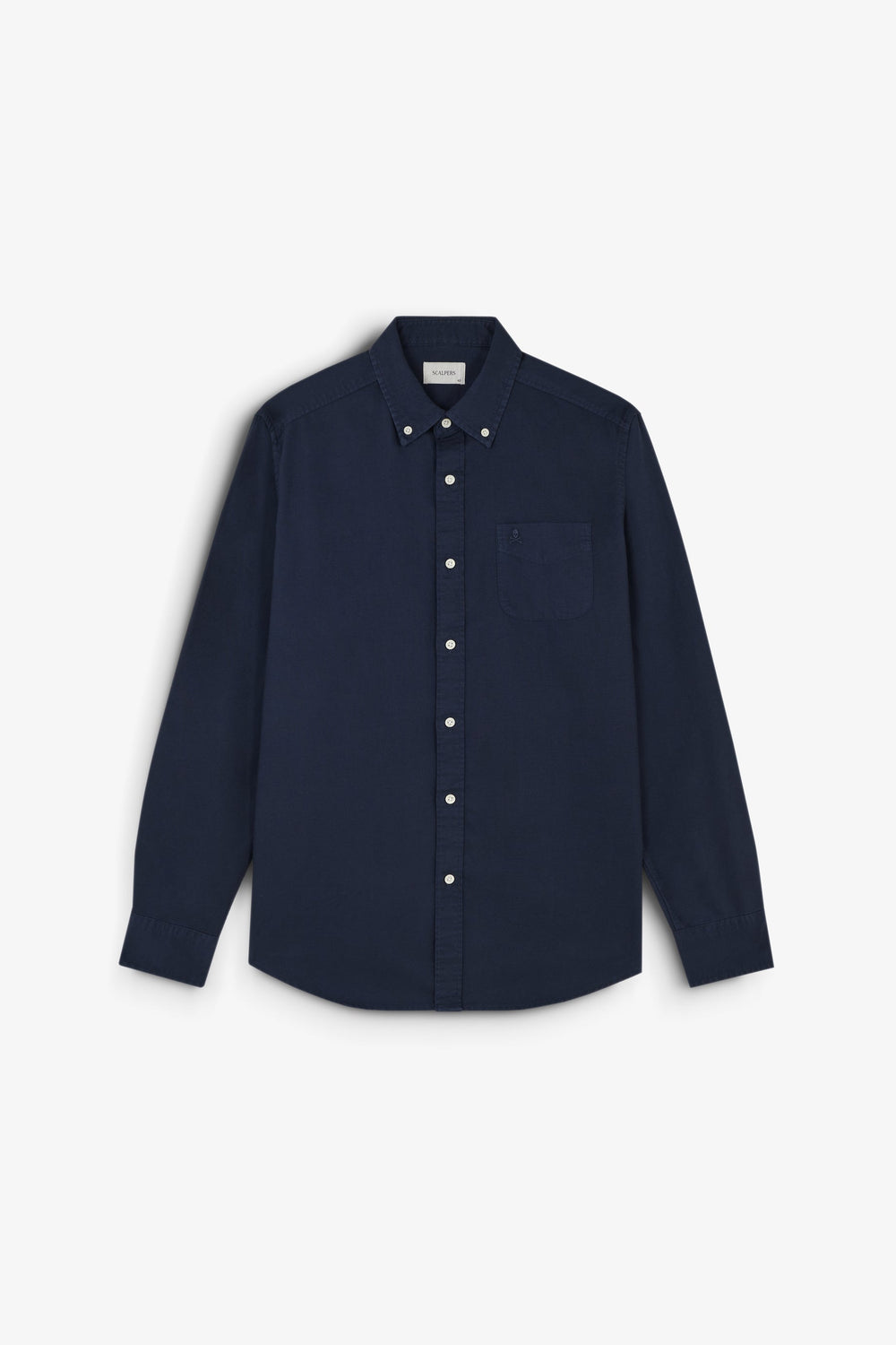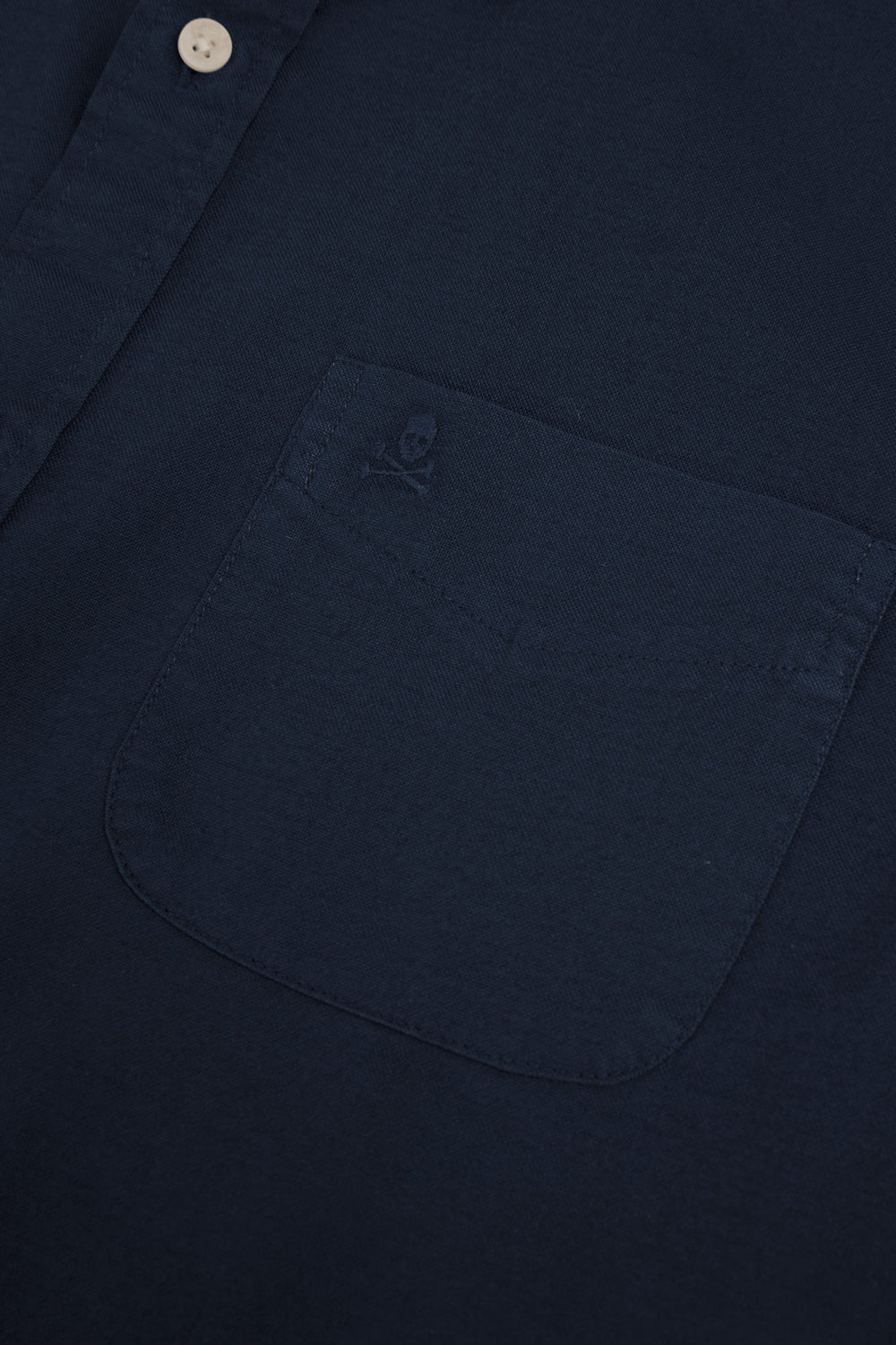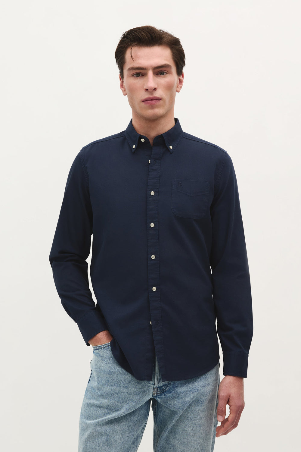 Camisa confeccionada en 100% algodón BCI. Regular fit, cuello con botones y cierre con botones. Manga larga terminada en puño con botones y calavera bordada a contraste.