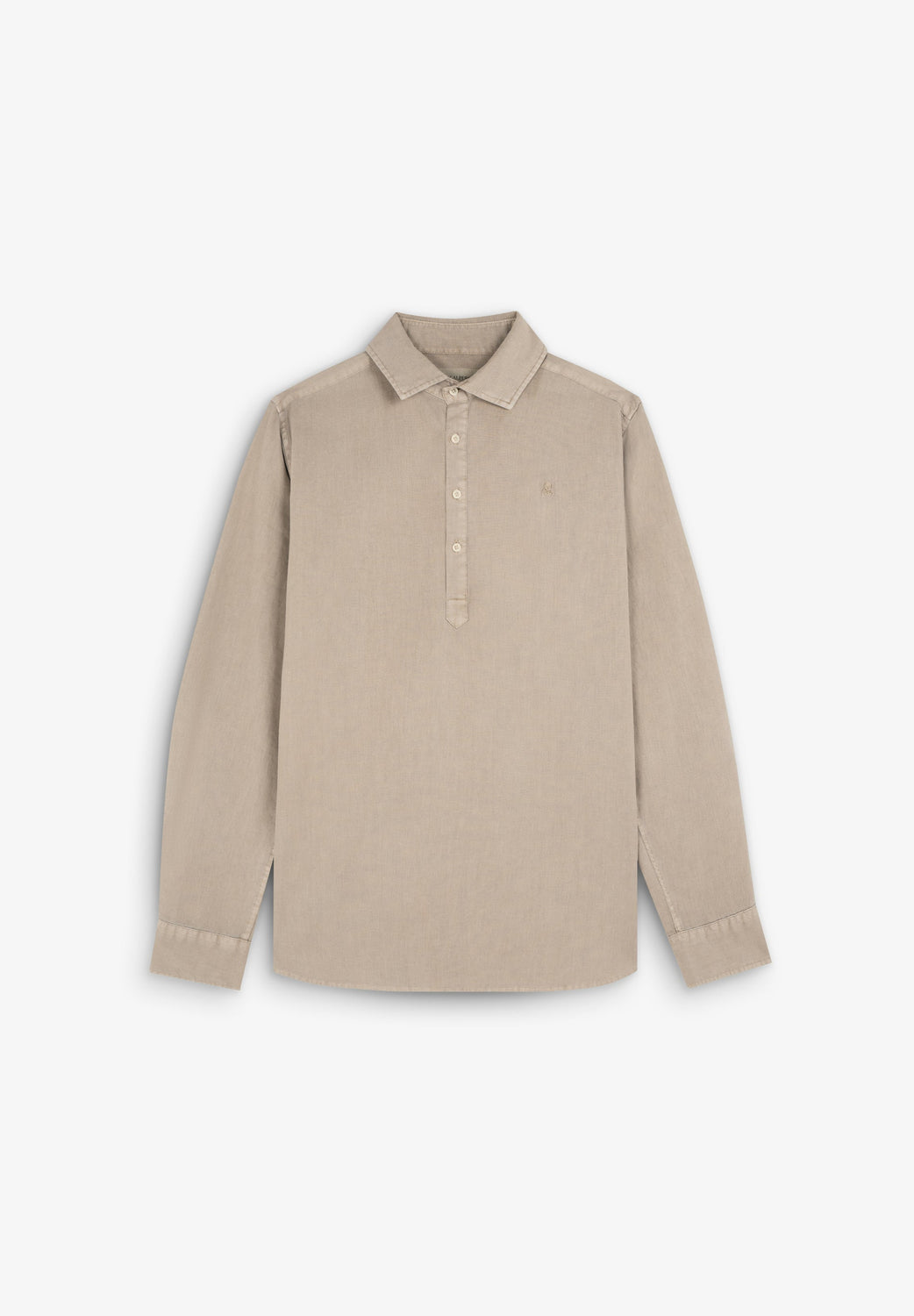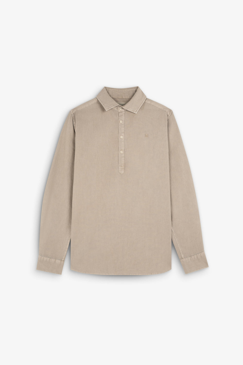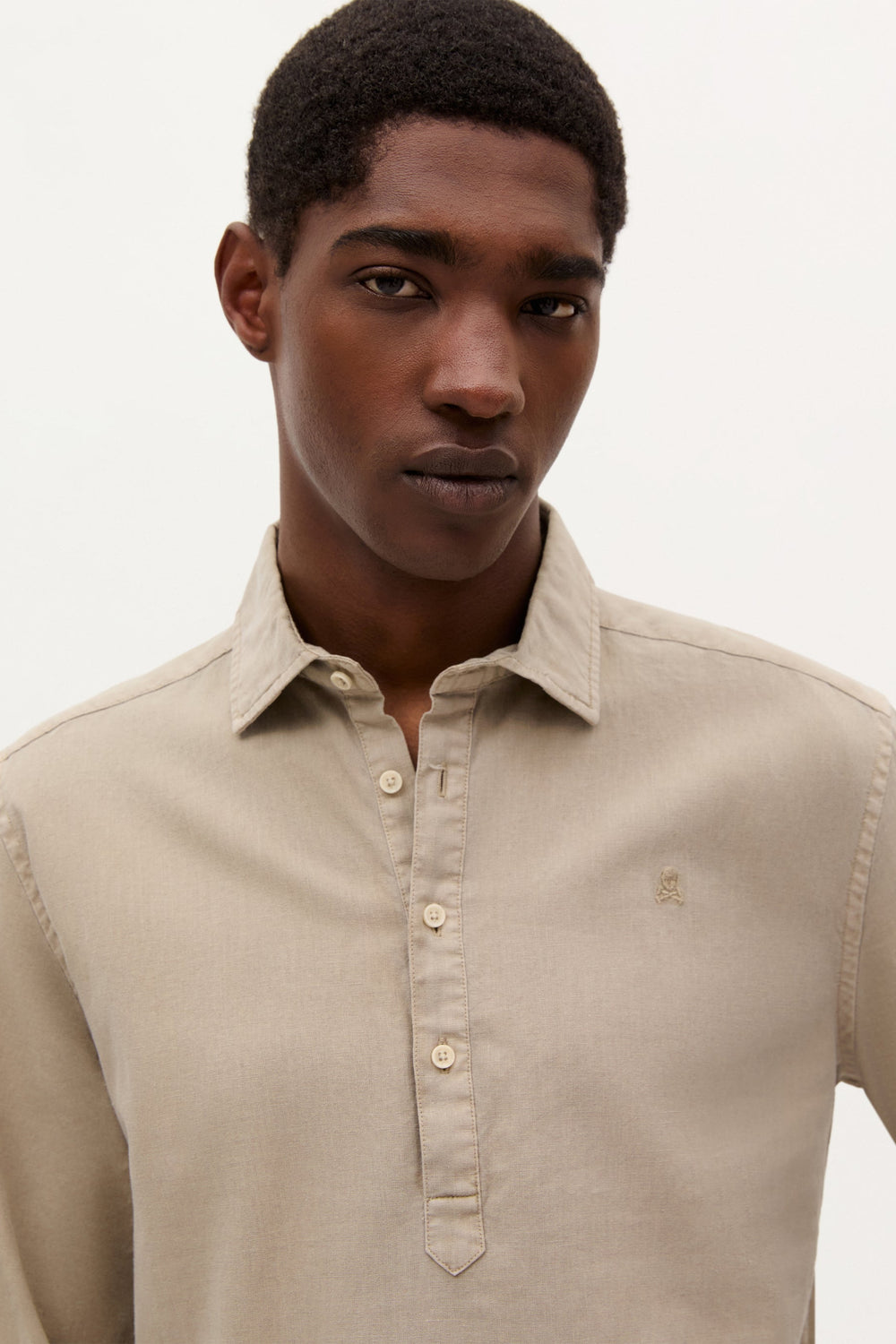 Camisa confeccionada en Algodón y Lino. Cerradura abotonada estilo polo. Manga Larga. Cierre en puños ajustable mediante botón. Monograma bordado a tono en parte frontal.