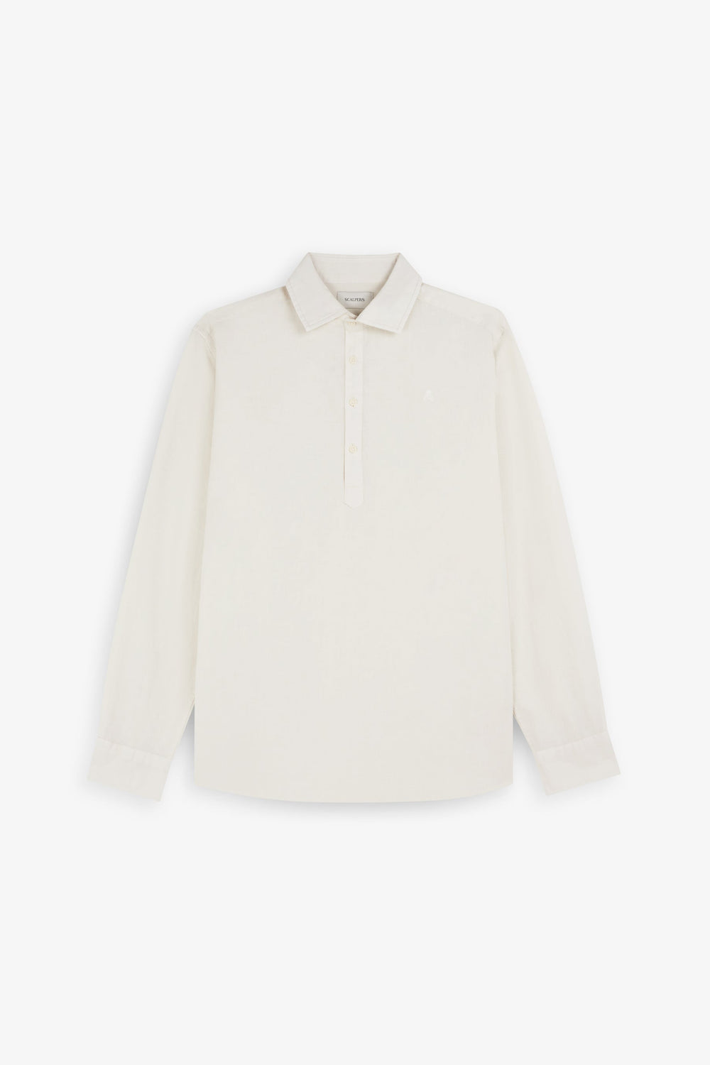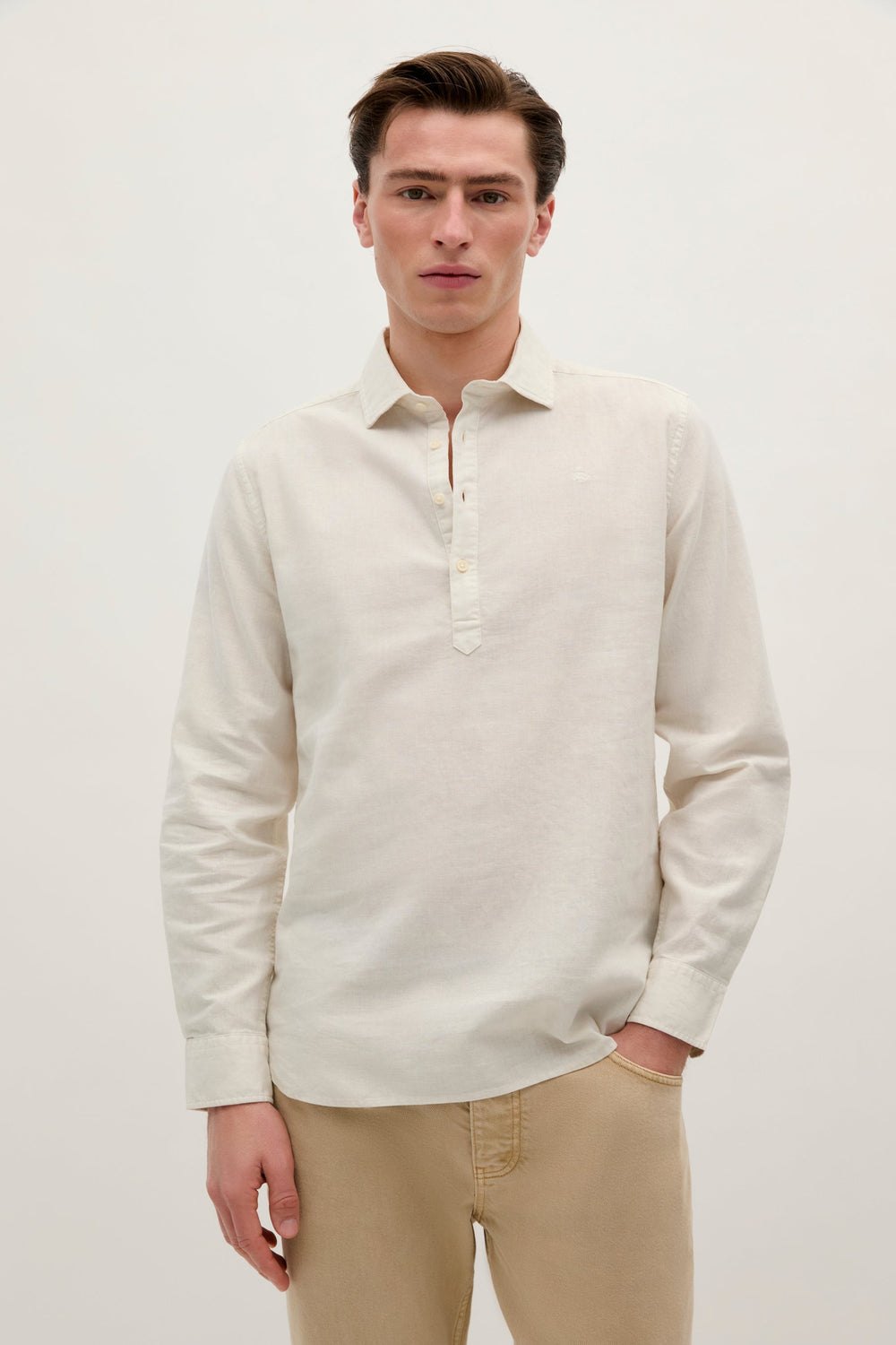 Camisa confeccionada en Algodón y Lino. Cerradura abotonada estilo polo. Manga Larga. Cierre en puños ajustable mediante botón. Monograma bordado a tono en parte frontal.