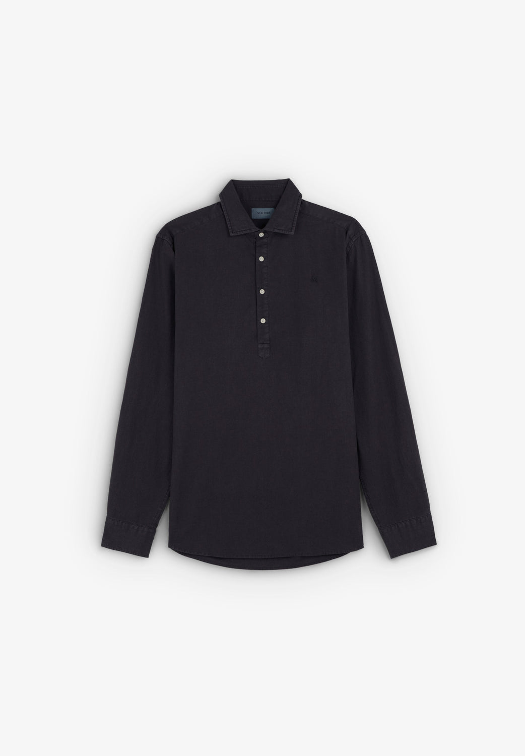 Camisa confeccionada en Algodón y Lino. Cerradura abotonada estilo polo. Manga Larga. Cierre en puños ajustable mediante botón. Monograma bordado a tono en parte frontal.