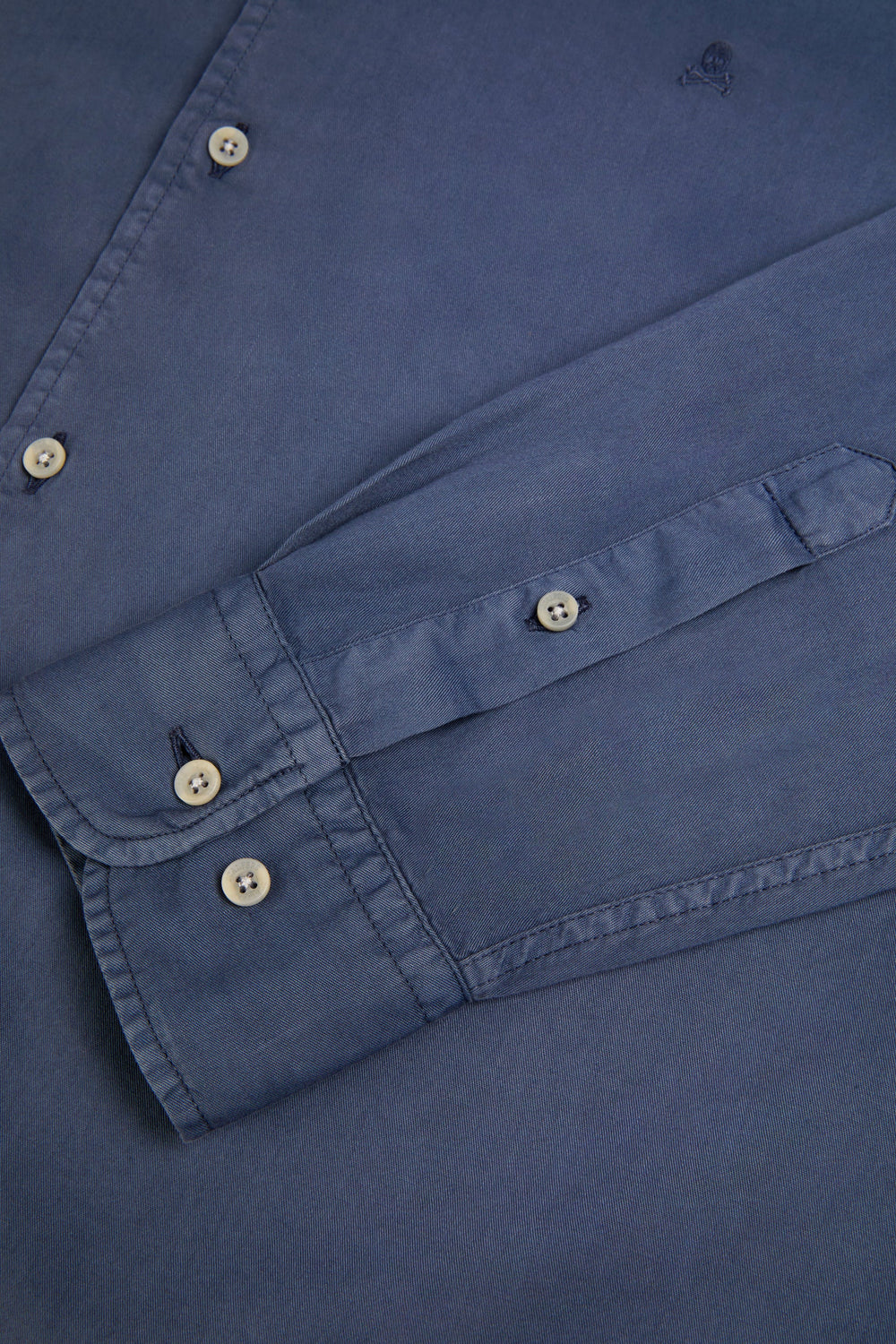 Camisa confeccionada en 100% algodón. Regular fit, cuello clásico y cierre con botones. Manga larga terminada en puño con botones y calavera bordada a tono.