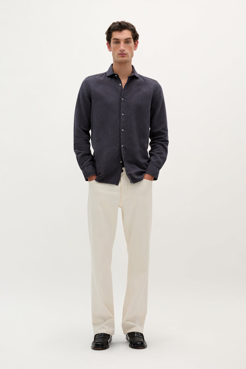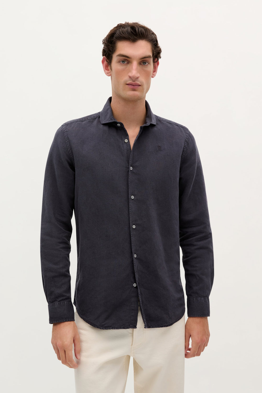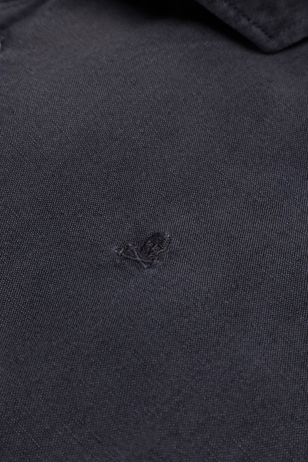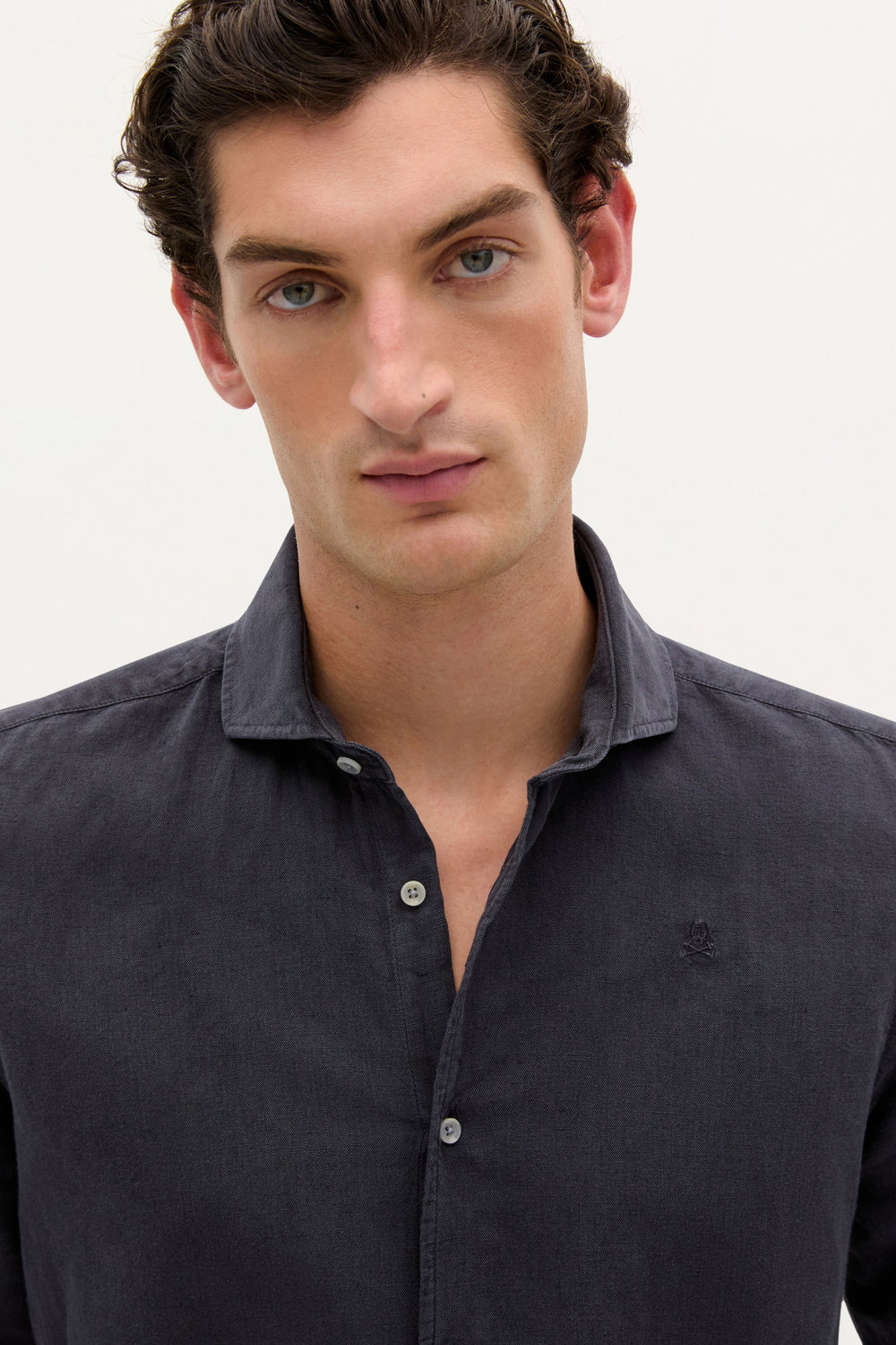 Camisa lino con calavera bordada a tono. Confeccionada en mezcla de lino y algodón. Corte regular Fit. Cuello cutaway. Cierre con botones. Manga larga terminada en puño con botones.