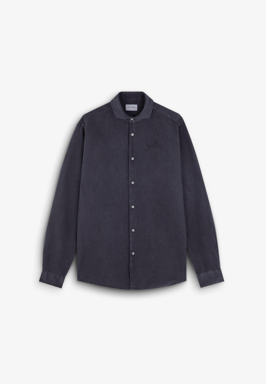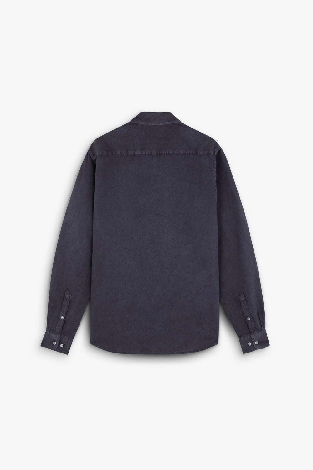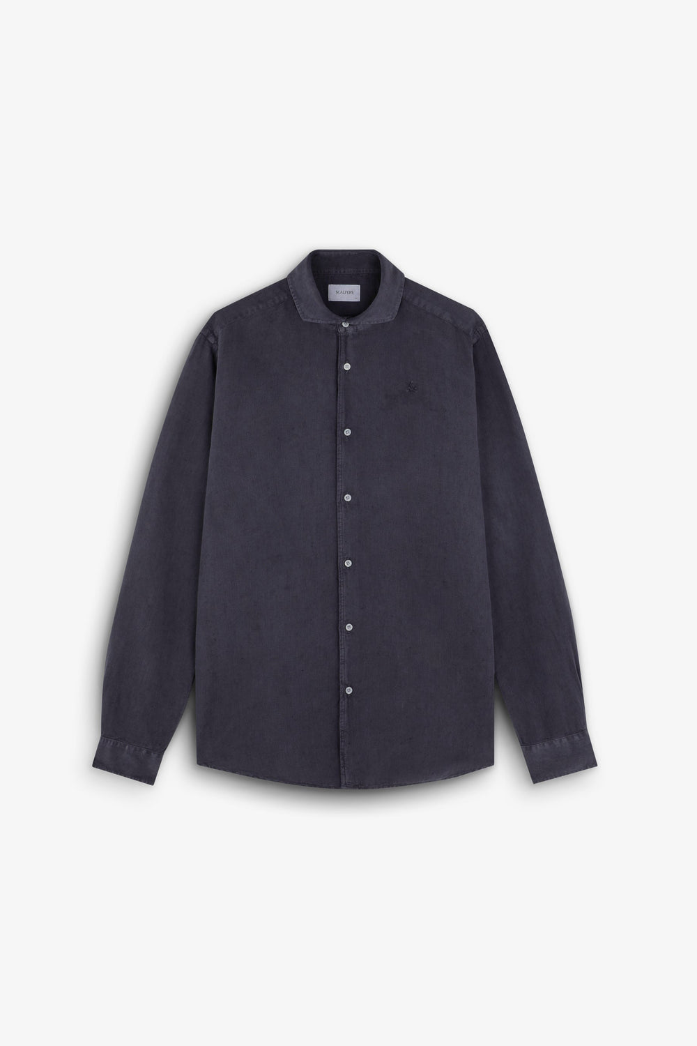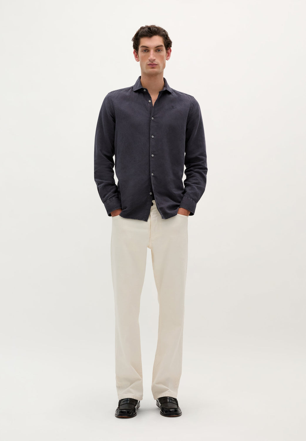 Camisa lino con calavera bordada a tono. Confeccionada en mezcla de lino y algodón. Corte regular Fit. Cuello cutaway. Cierre con botones. Manga larga terminada en puño con botones.