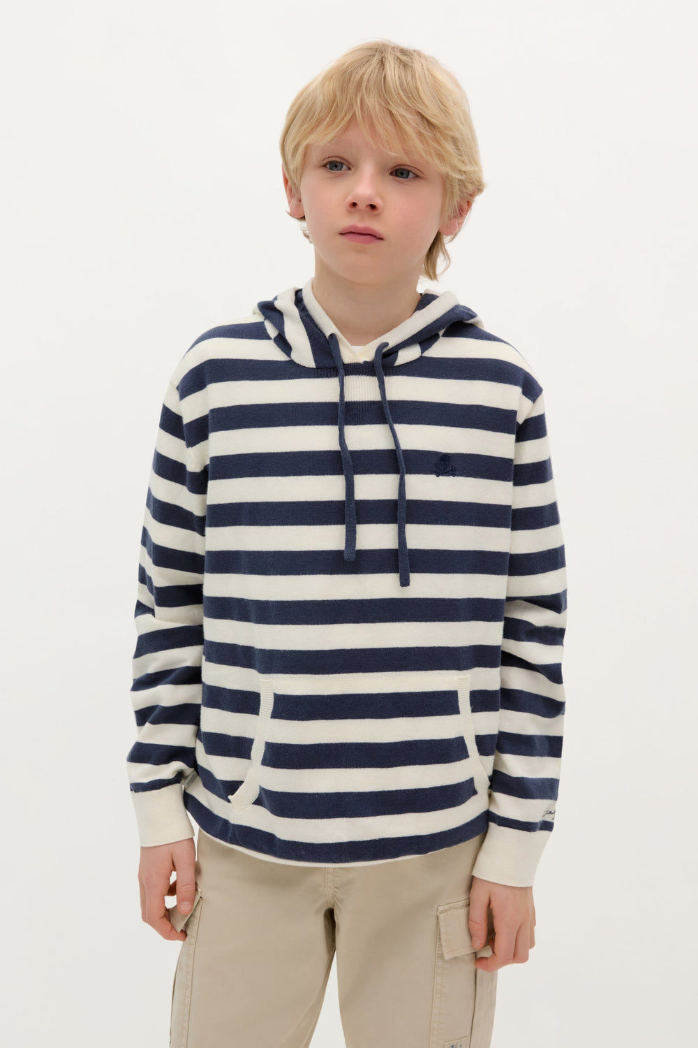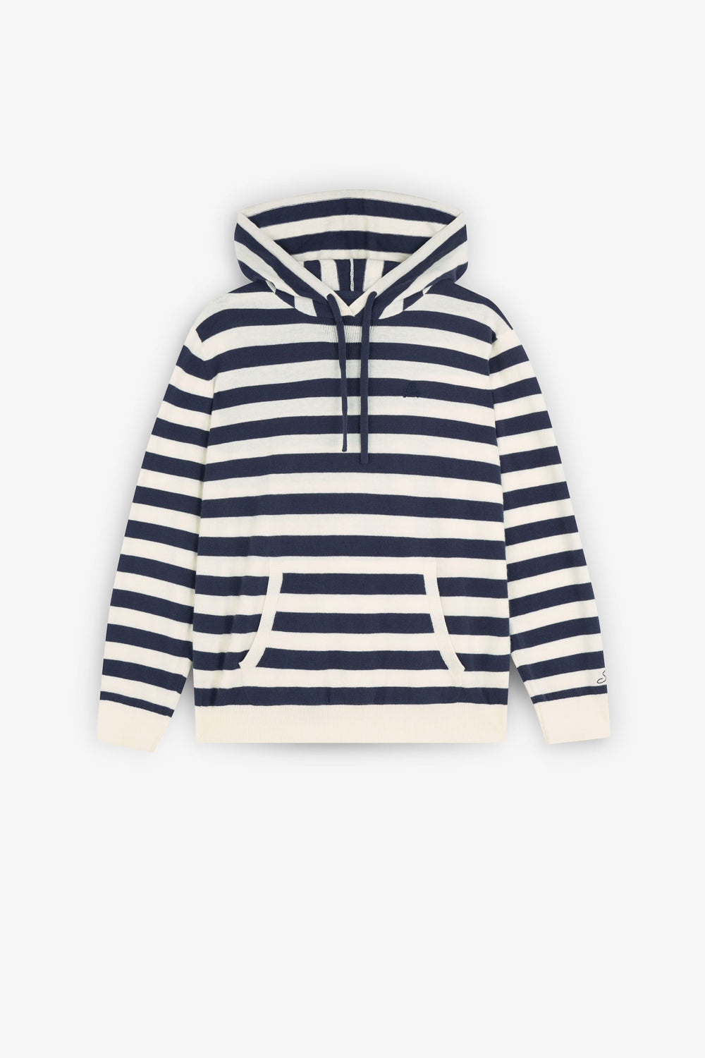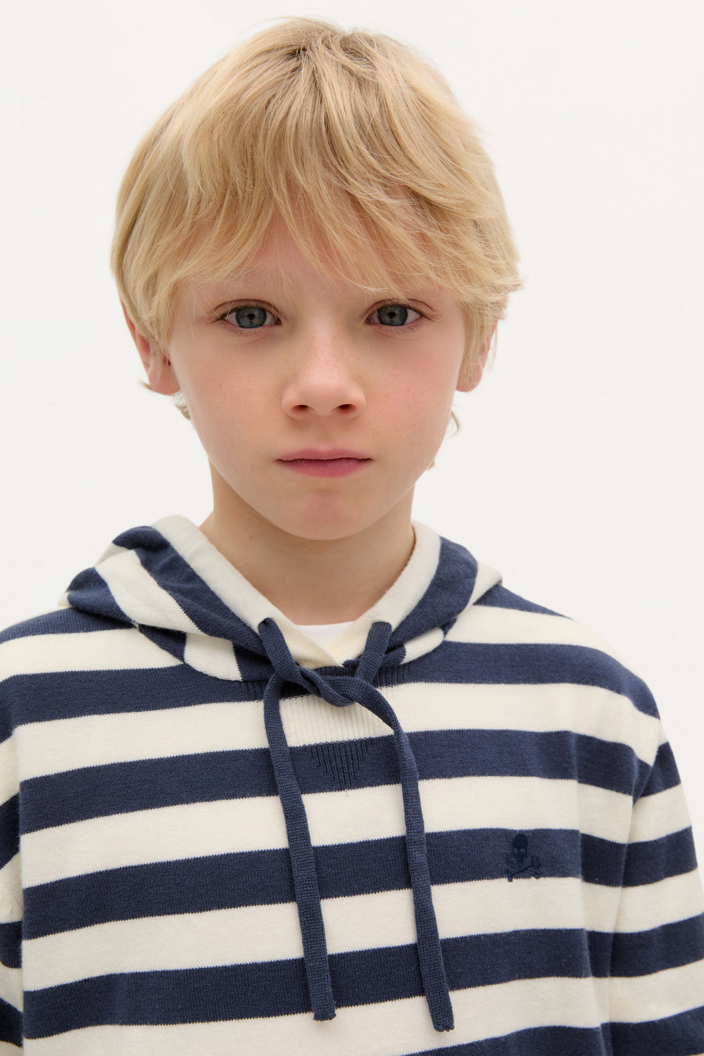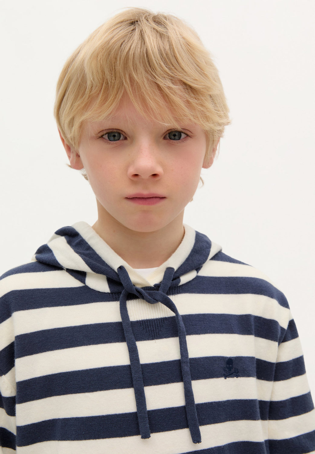 Jersey de rayas con capucha y detalles a contraste. Confeccionado en algodón 100% BCI. Corte regular Fit. Cuello con capucha ajustable. Manga larga terminada con puños a contraste. Bolsillo canguro. Detalle calavera bordada a contraste.