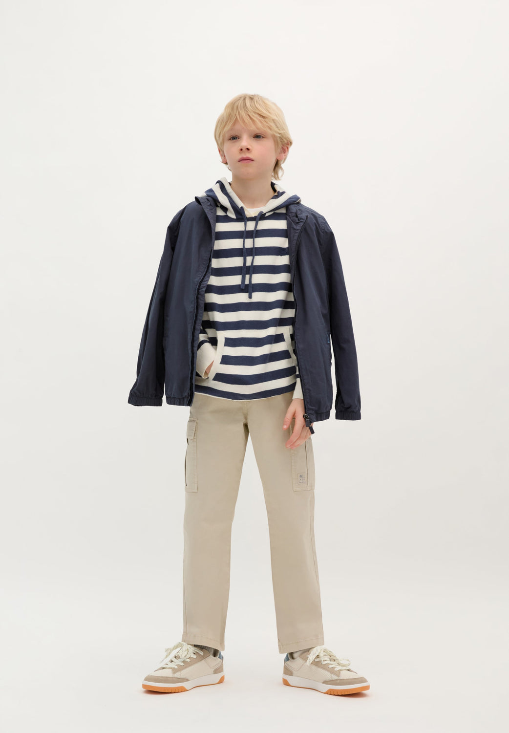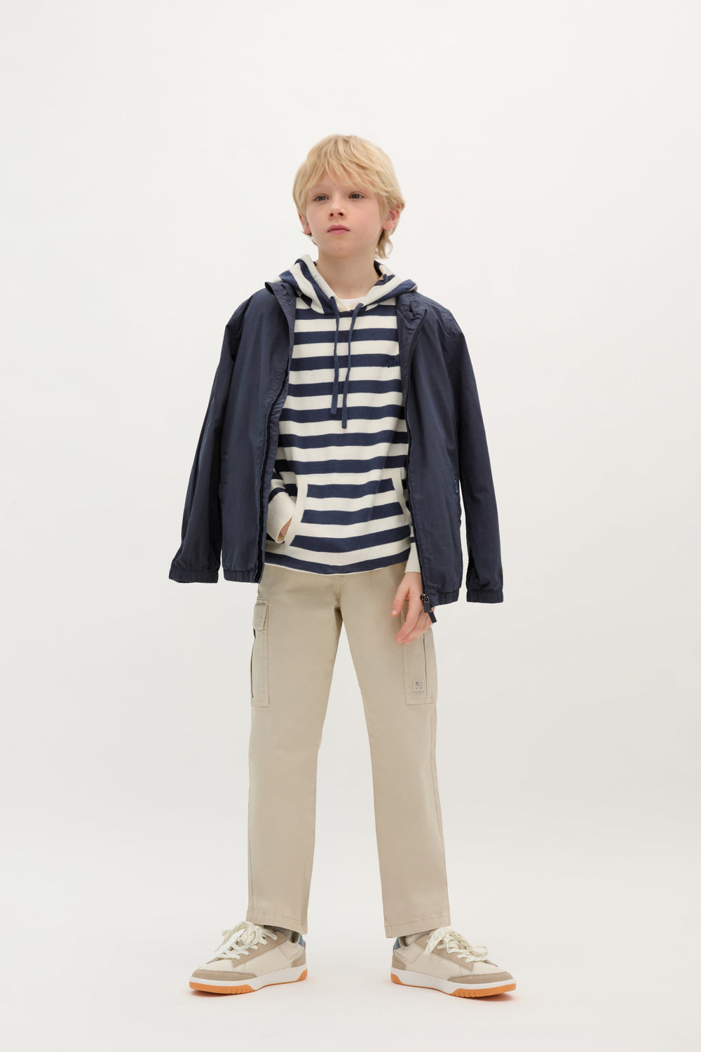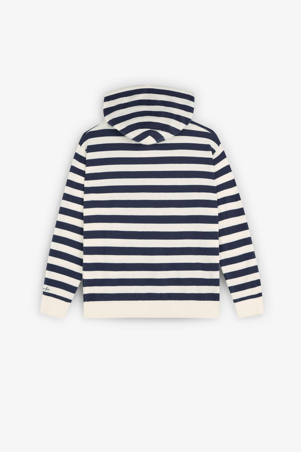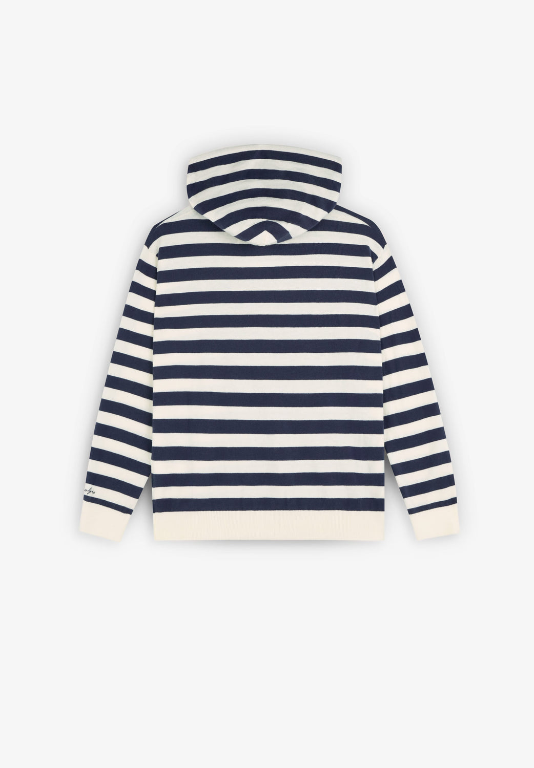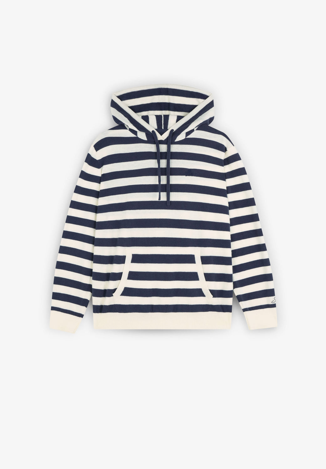 Jersey de rayas con capucha y detalles a contraste. Confeccionado en algodón 100% BCI. Corte regular Fit. Cuello con capucha ajustable. Manga larga terminada con puños a contraste. Bolsillo canguro. Detalle calavera bordada a contraste.