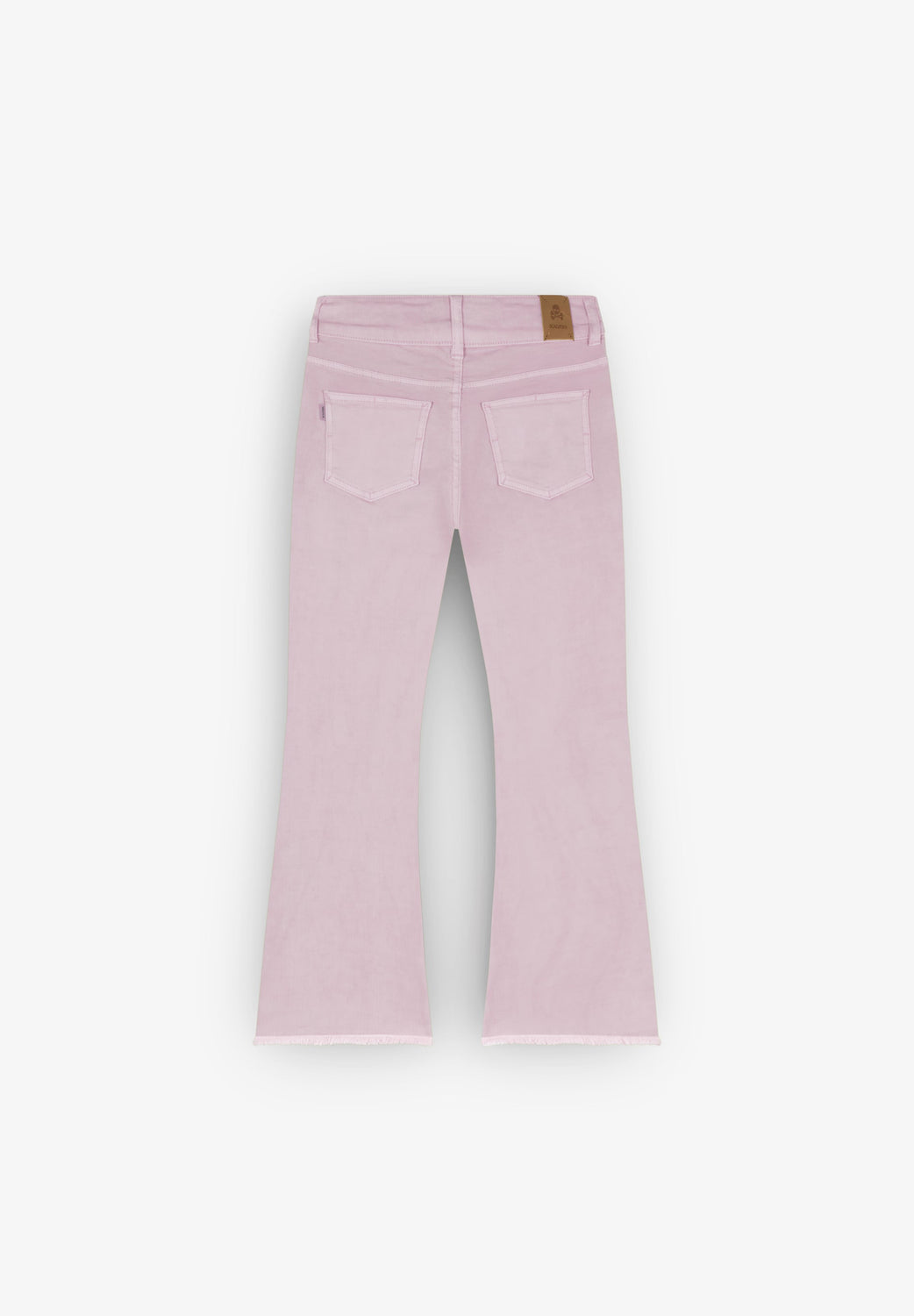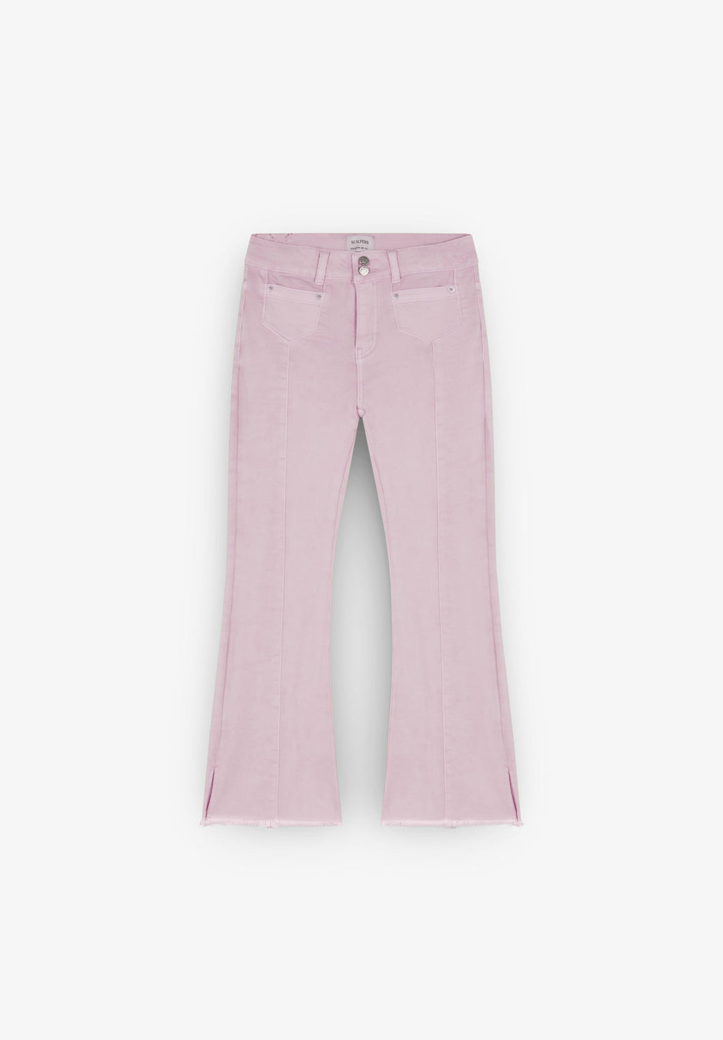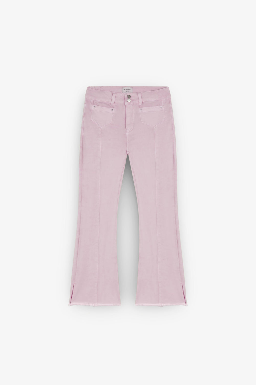 Pantalón confeccionado en algodón ligeramente elástico. Flare fit. Cierre con doble botón y cremallera. Bolsillos delanteros y traseros. Detalle de costura en parte frontal. Apertura lateral y remates desflecados en bajos.